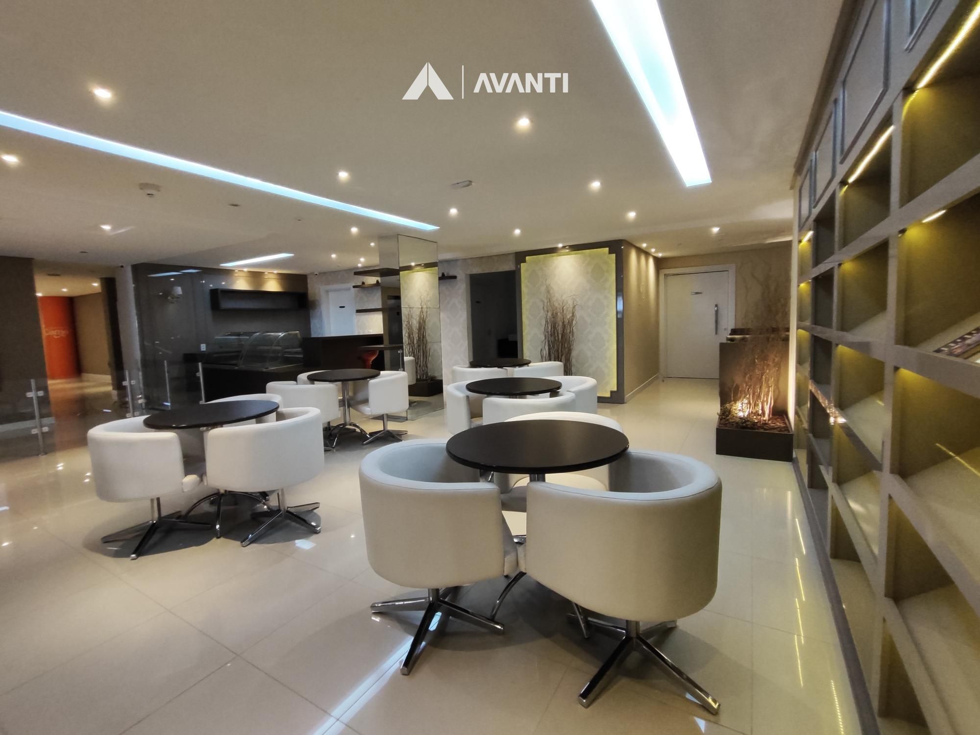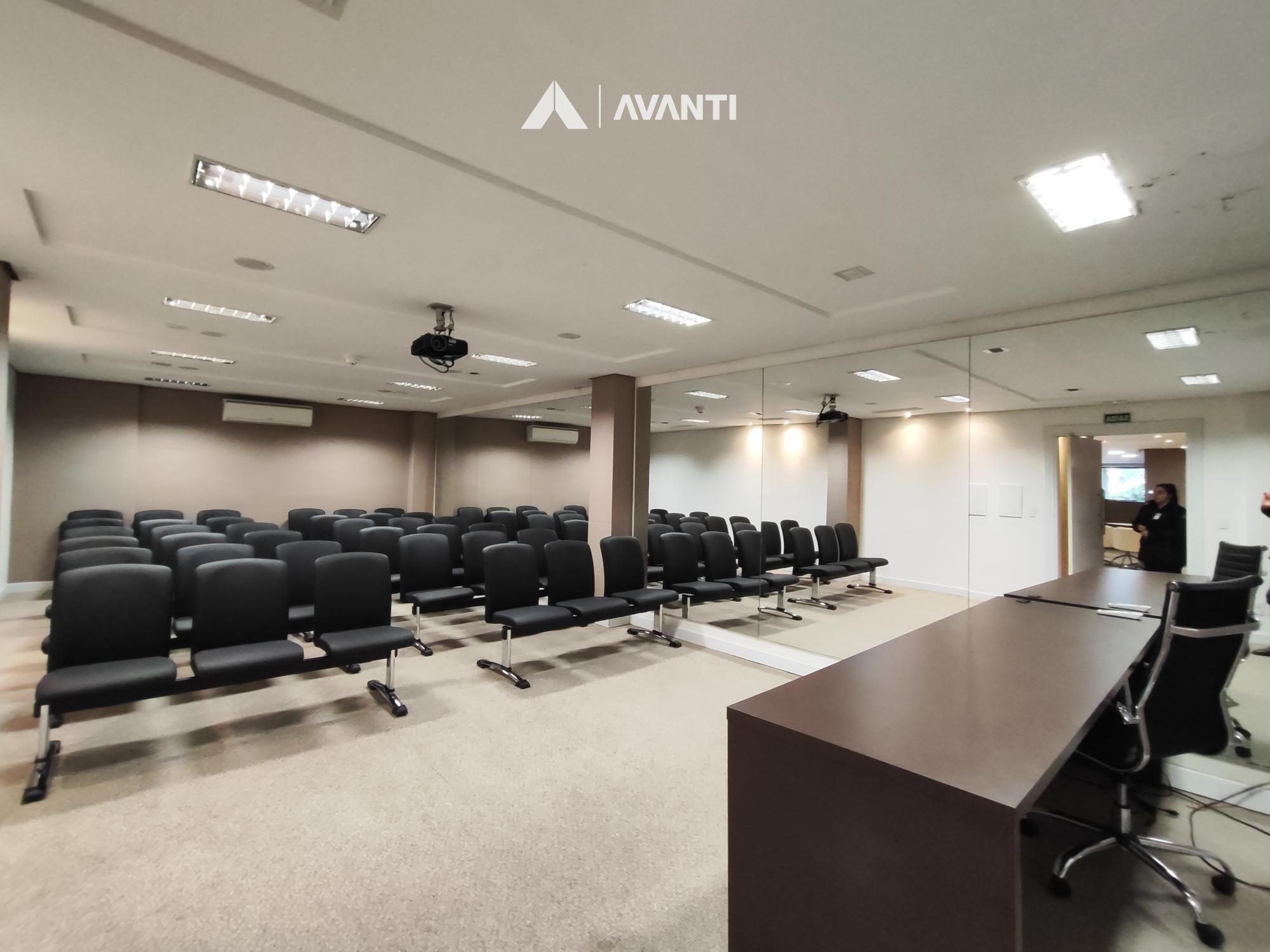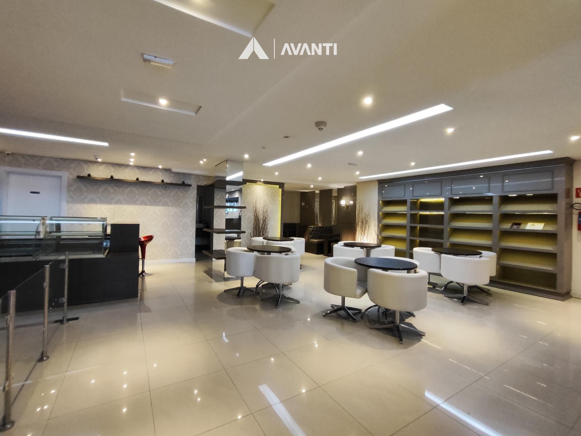 Condomínio com portaria, catracas, elevador, salas de reuniões, auditório e espaço para cafeteria.