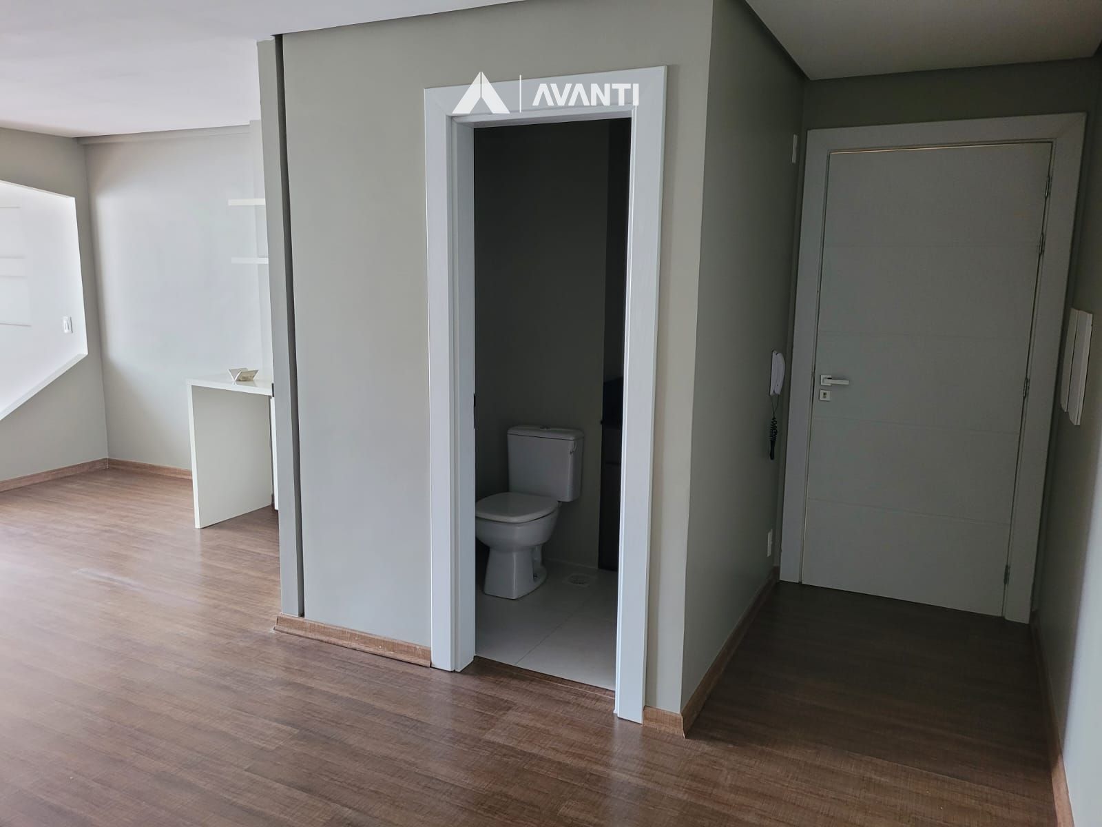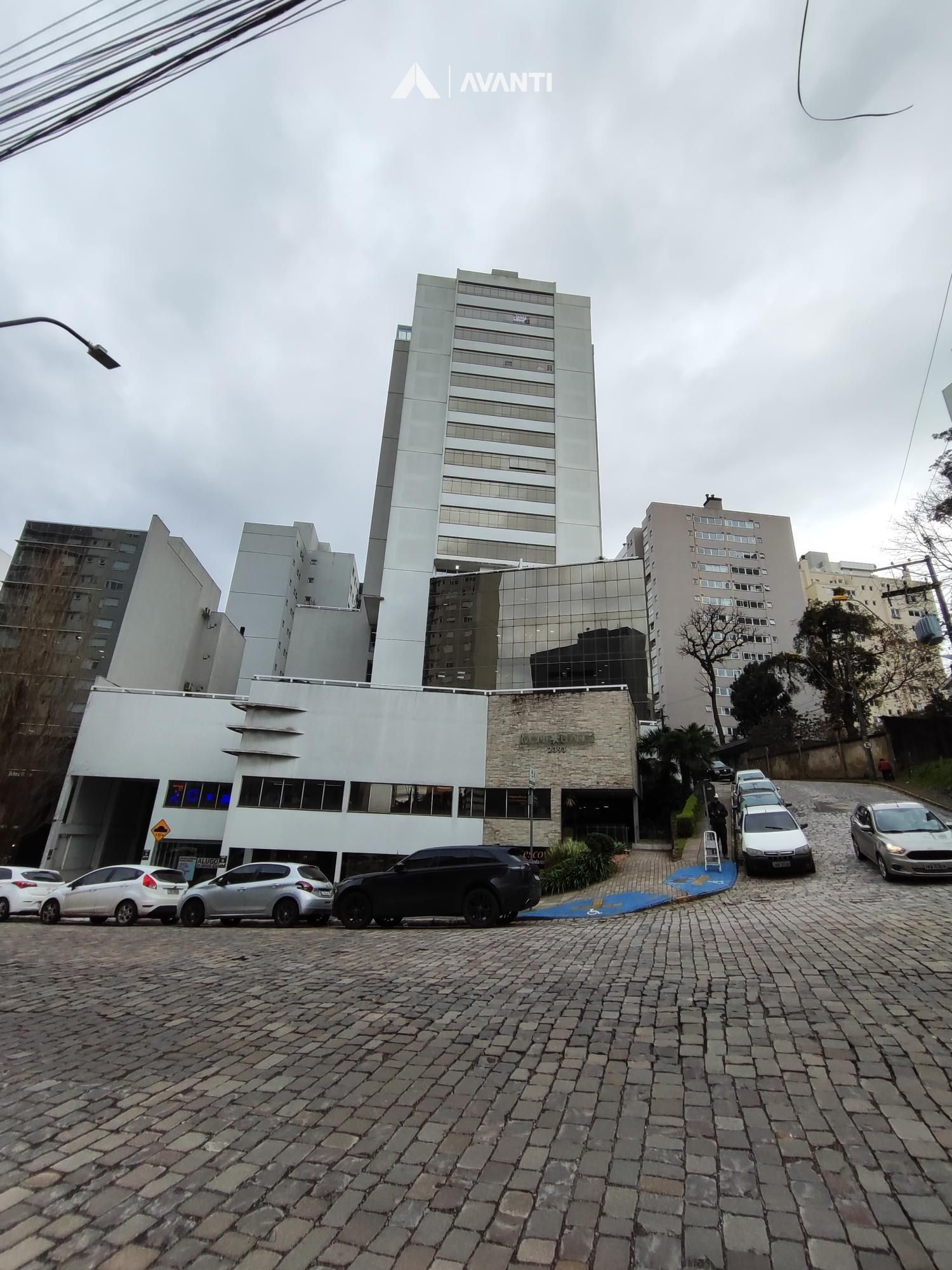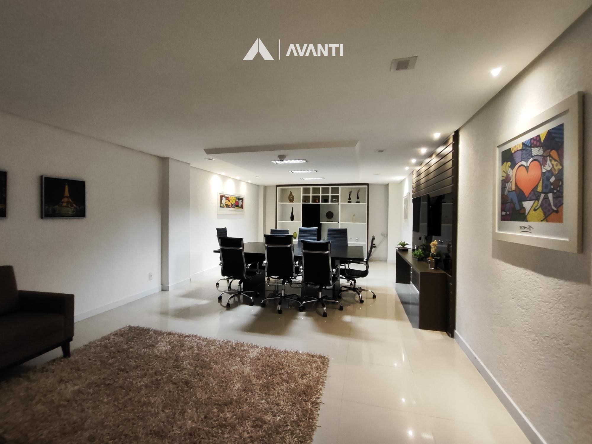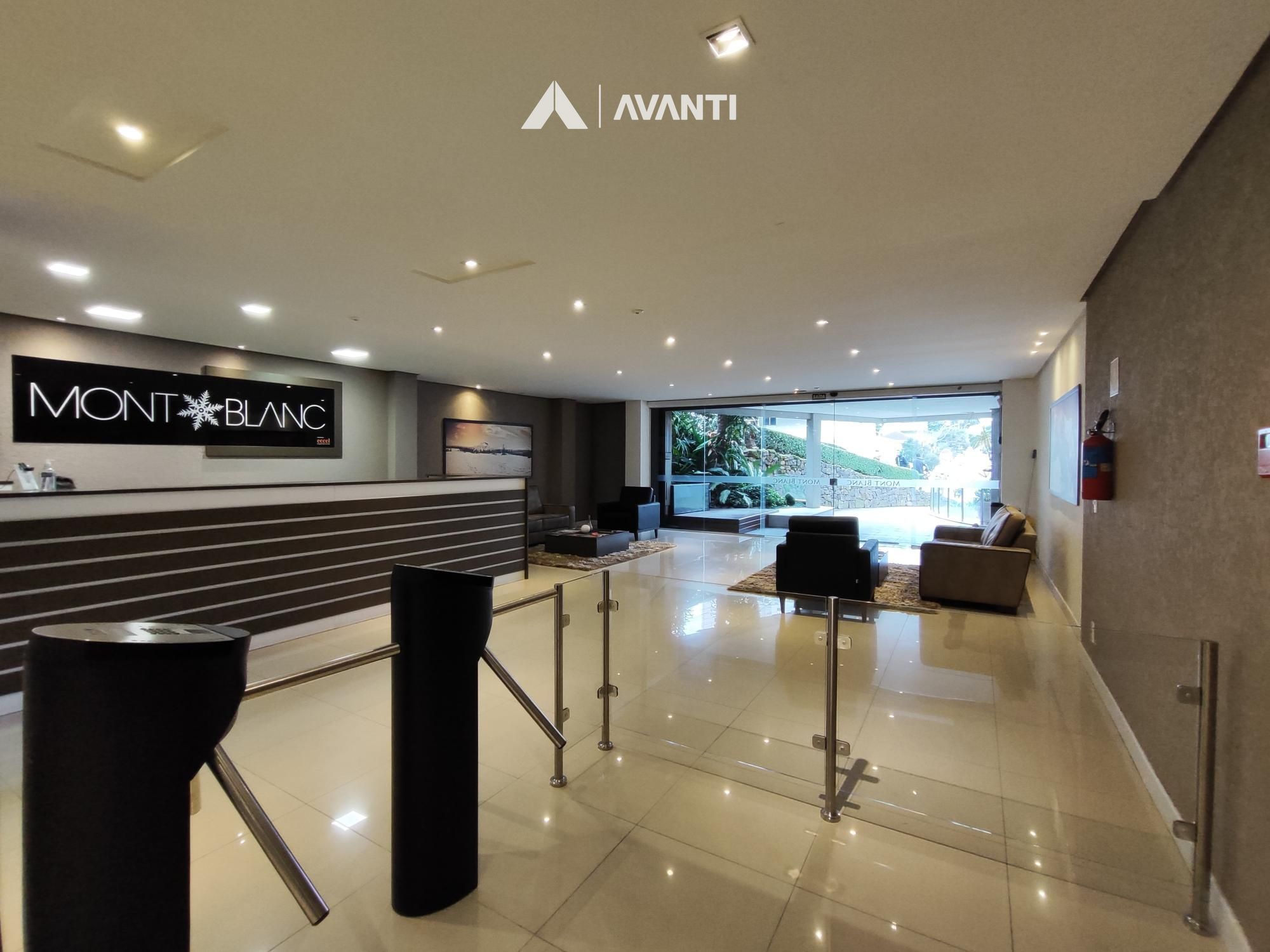 Condomínio com portaria, catracas, elevador, salas de reuniões, auditório e espaço para cafeteria.