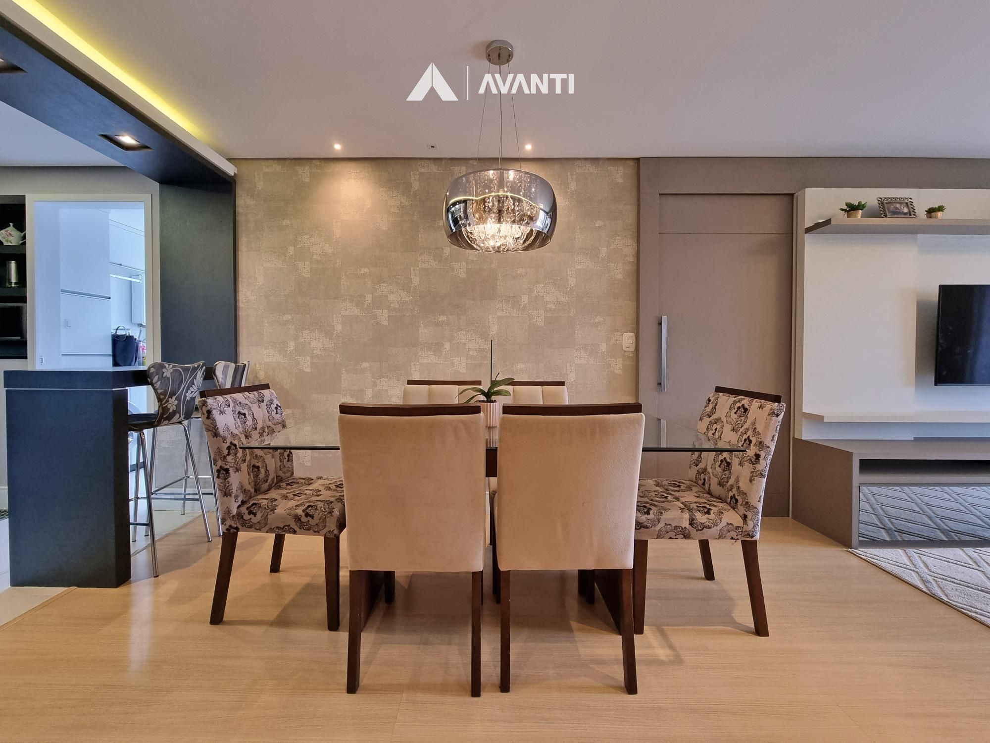 Hall de entrada, sala de jantar, sala de estar, sacada gourmet com fechamento reiki, cozinha com bancada, área de serviço e banheiro social.