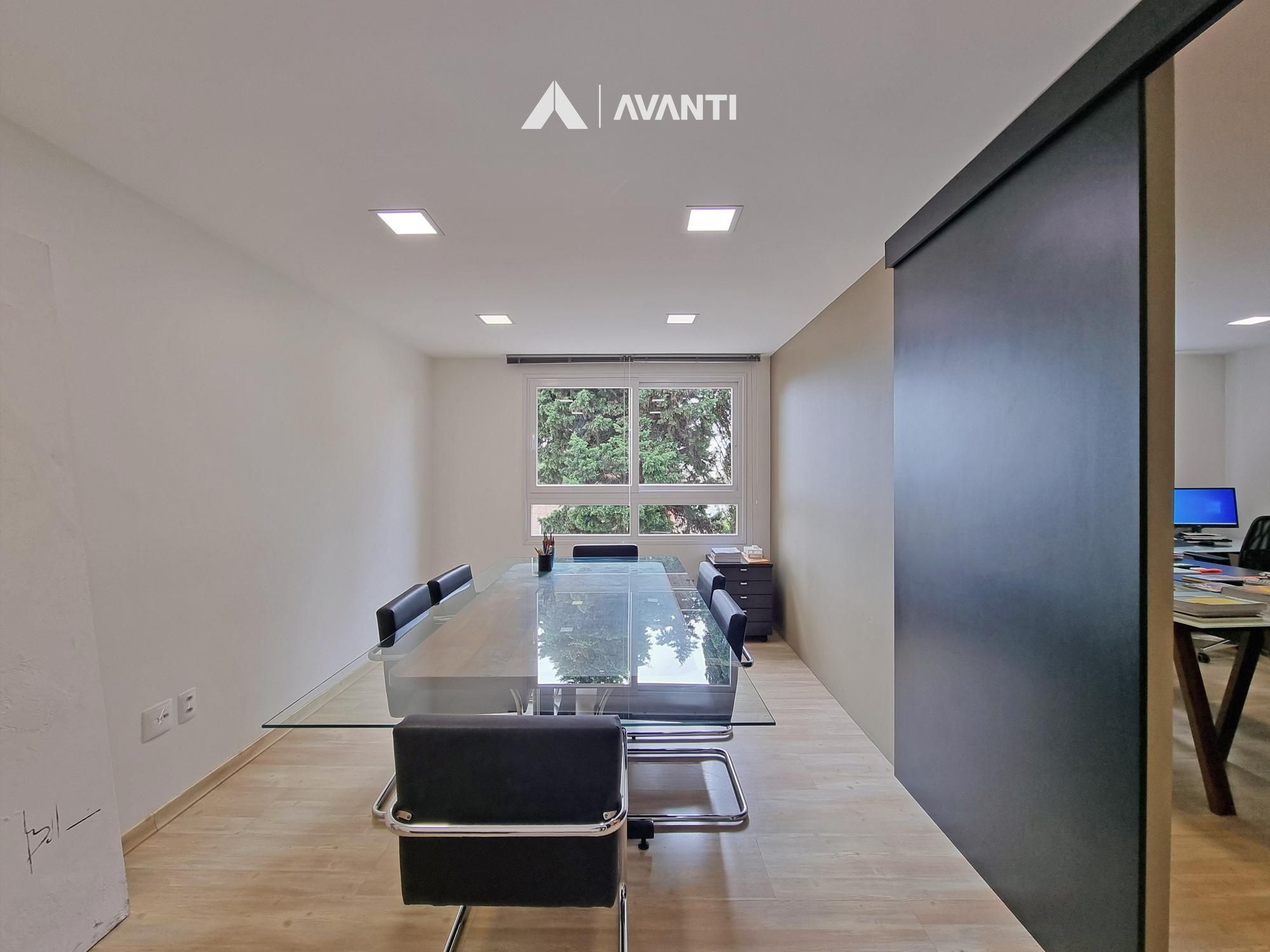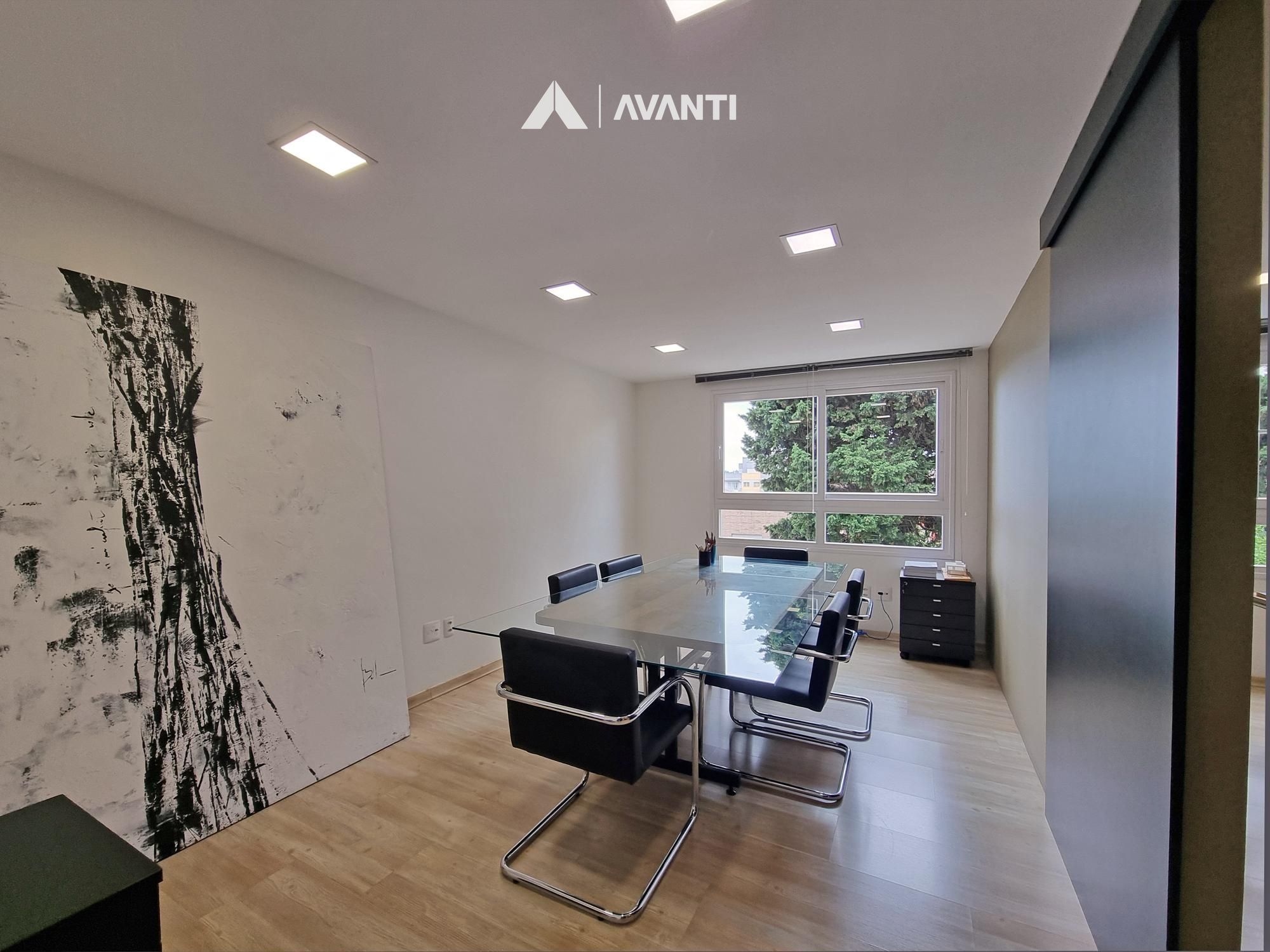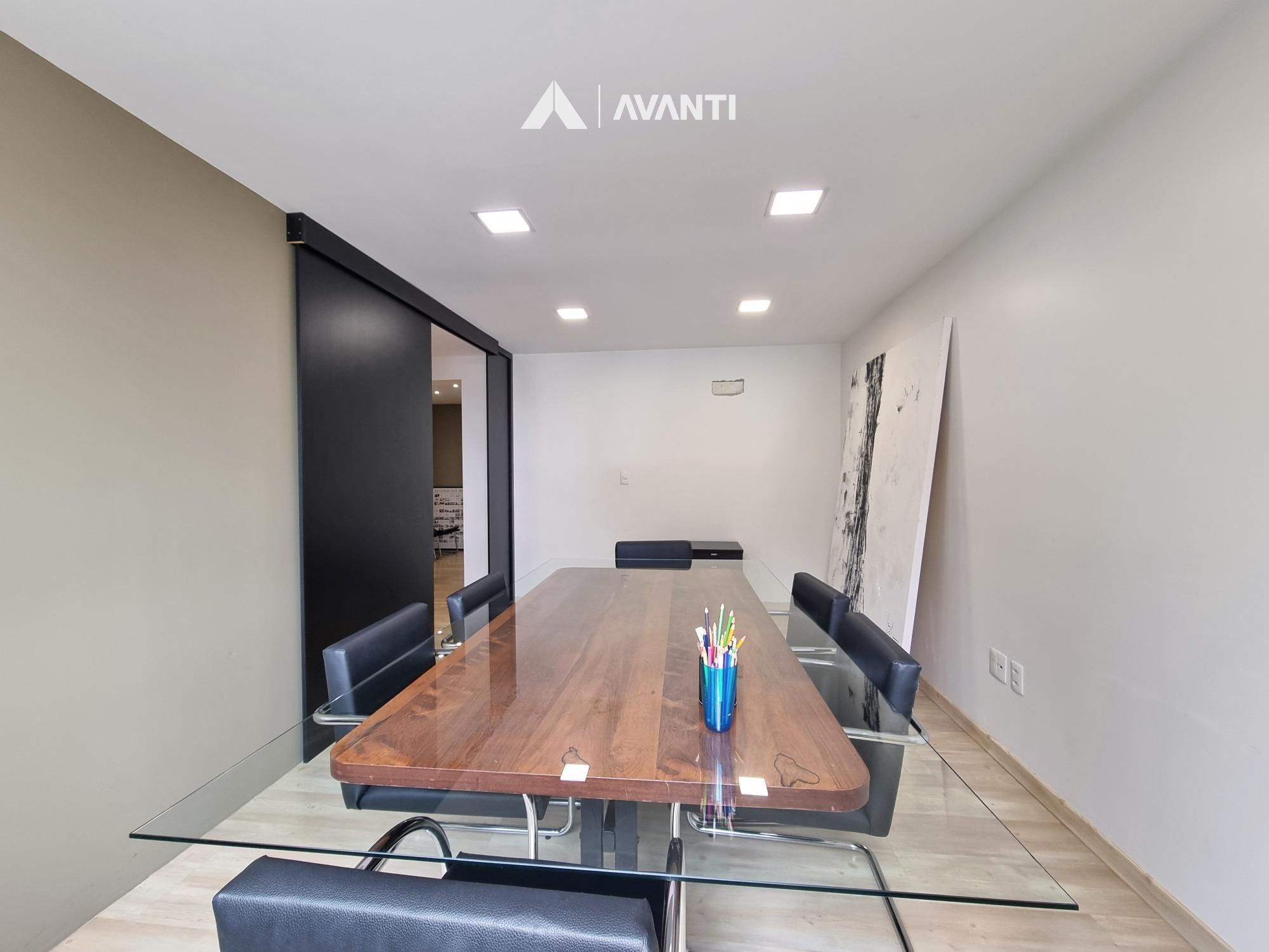 Sala de reuniões, escritório, 2 lavabos e 1 vaga de garagem.