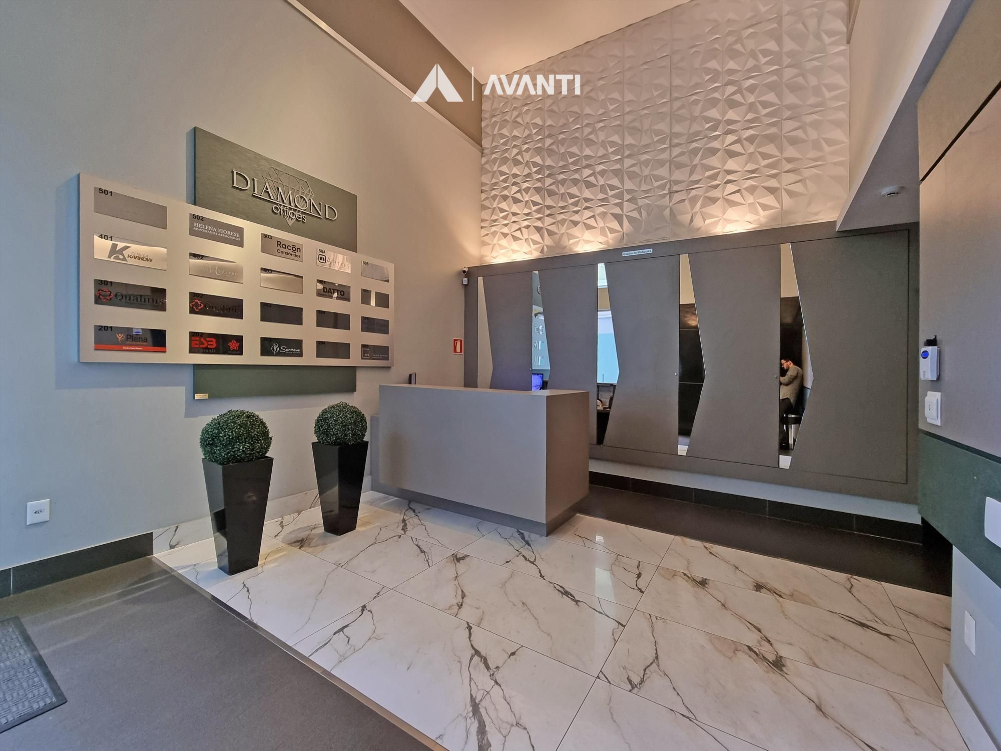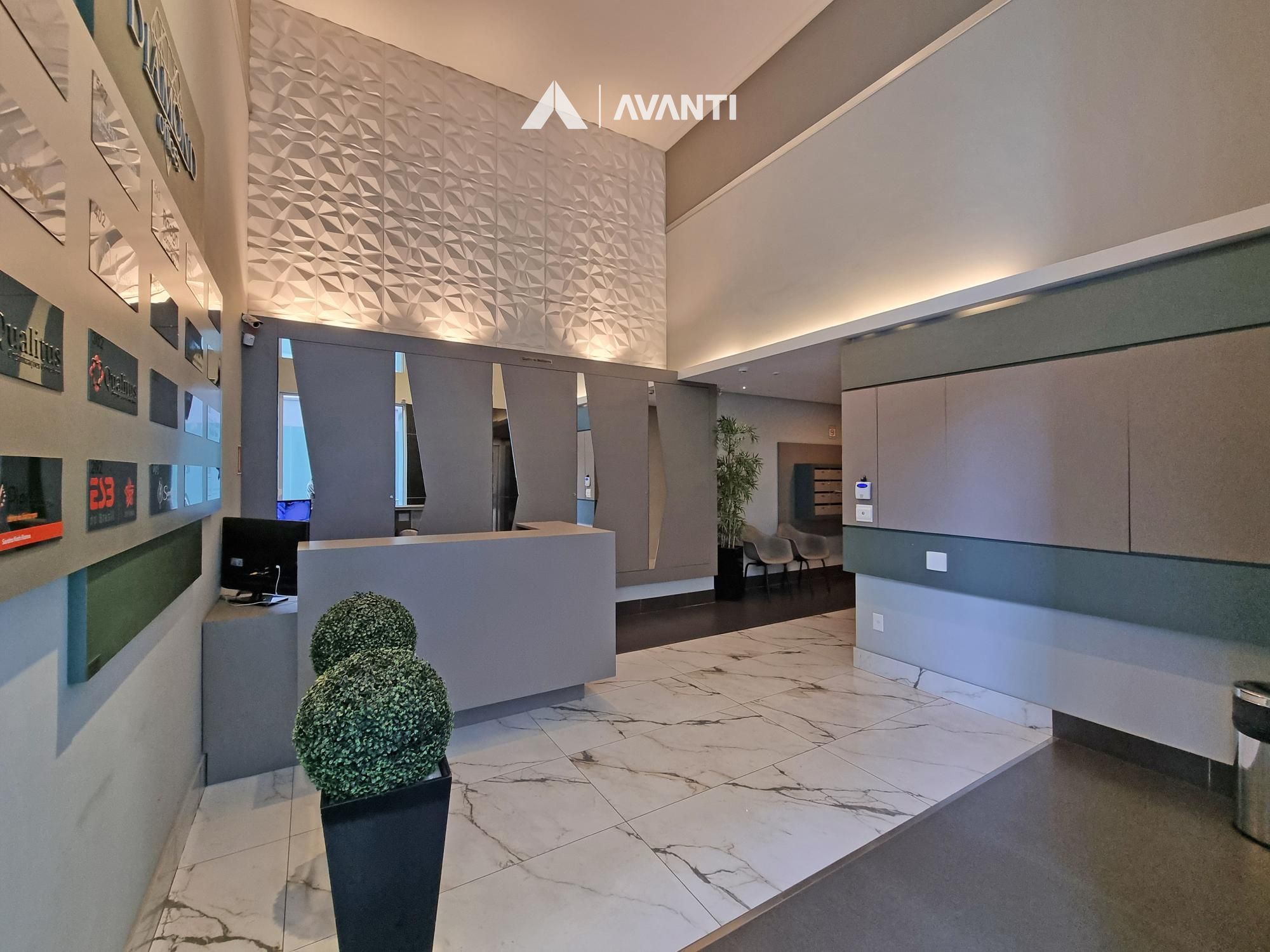 Condomínio com portaria em horário comercial, imponente hall decorado e elevador.
