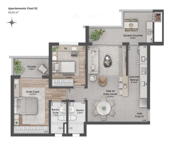 Hall de entrada, living em conceito aberto que comporta jantar, estar e cozinha, sacada com churrasqueira e banheiro social.