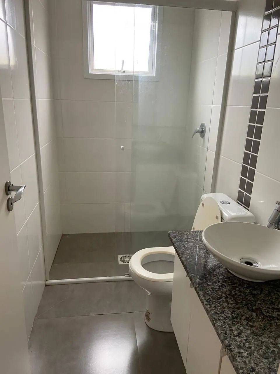 Living integrado, sacada com churrasqueira, cozinha e banheiro social.