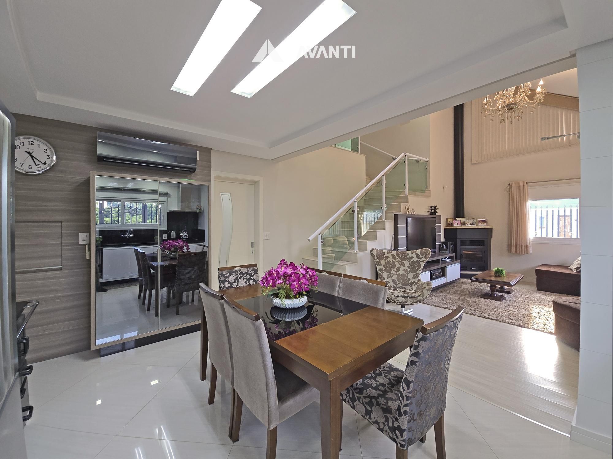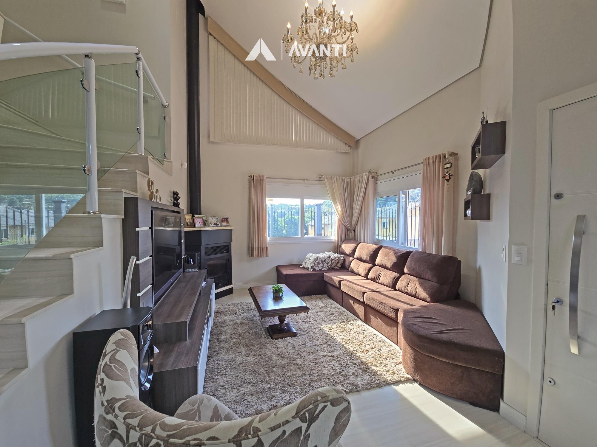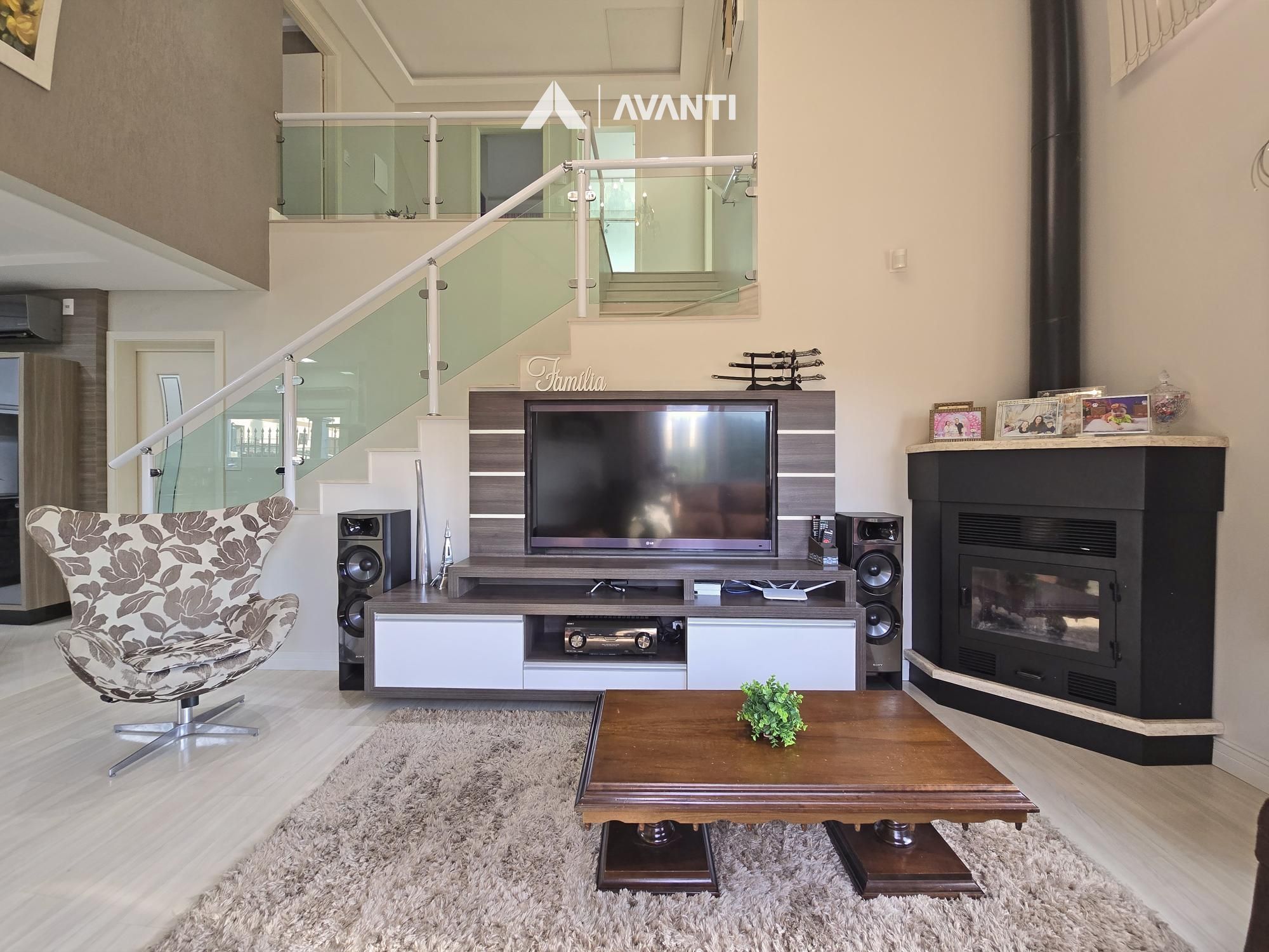 Imponente living com pé direito duplo, sala de estar com lareira, cozinha copa, espaço gourmet com lavabo, banheiro social e área de serviço separada.
