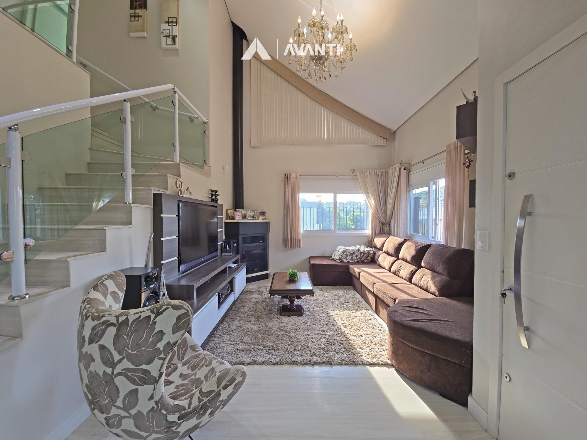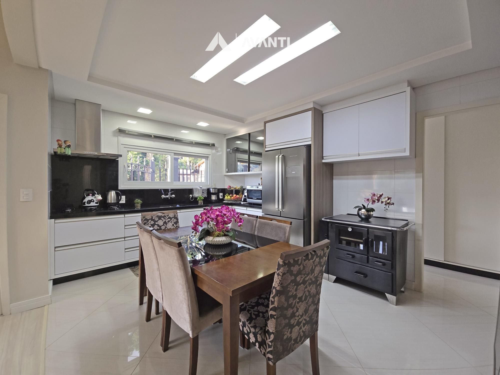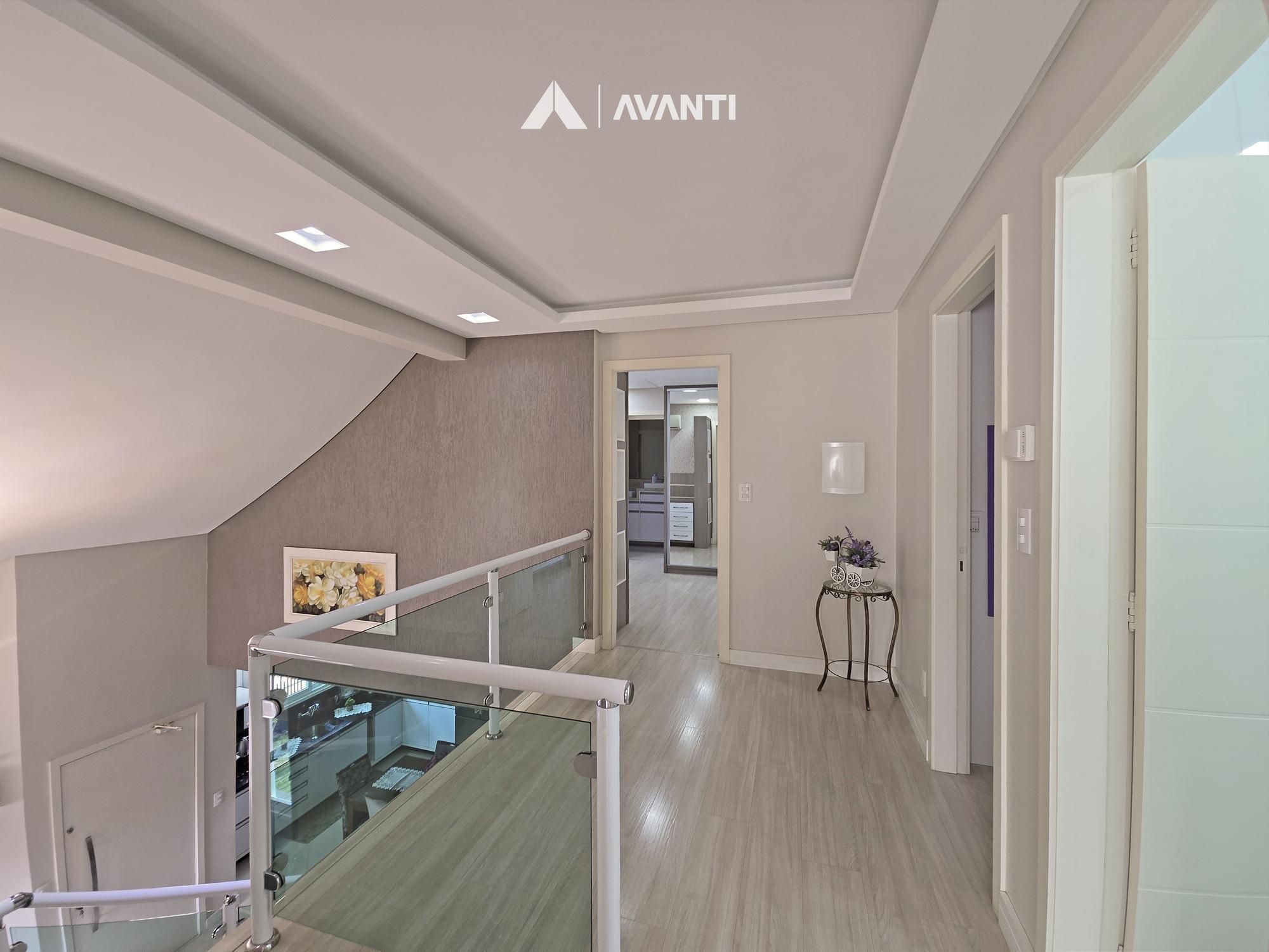 Imponente living com pé direito duplo, sala de estar com lareira, cozinha copa, espaço gourmet com lavabo, banheiro social e área de serviço separada.