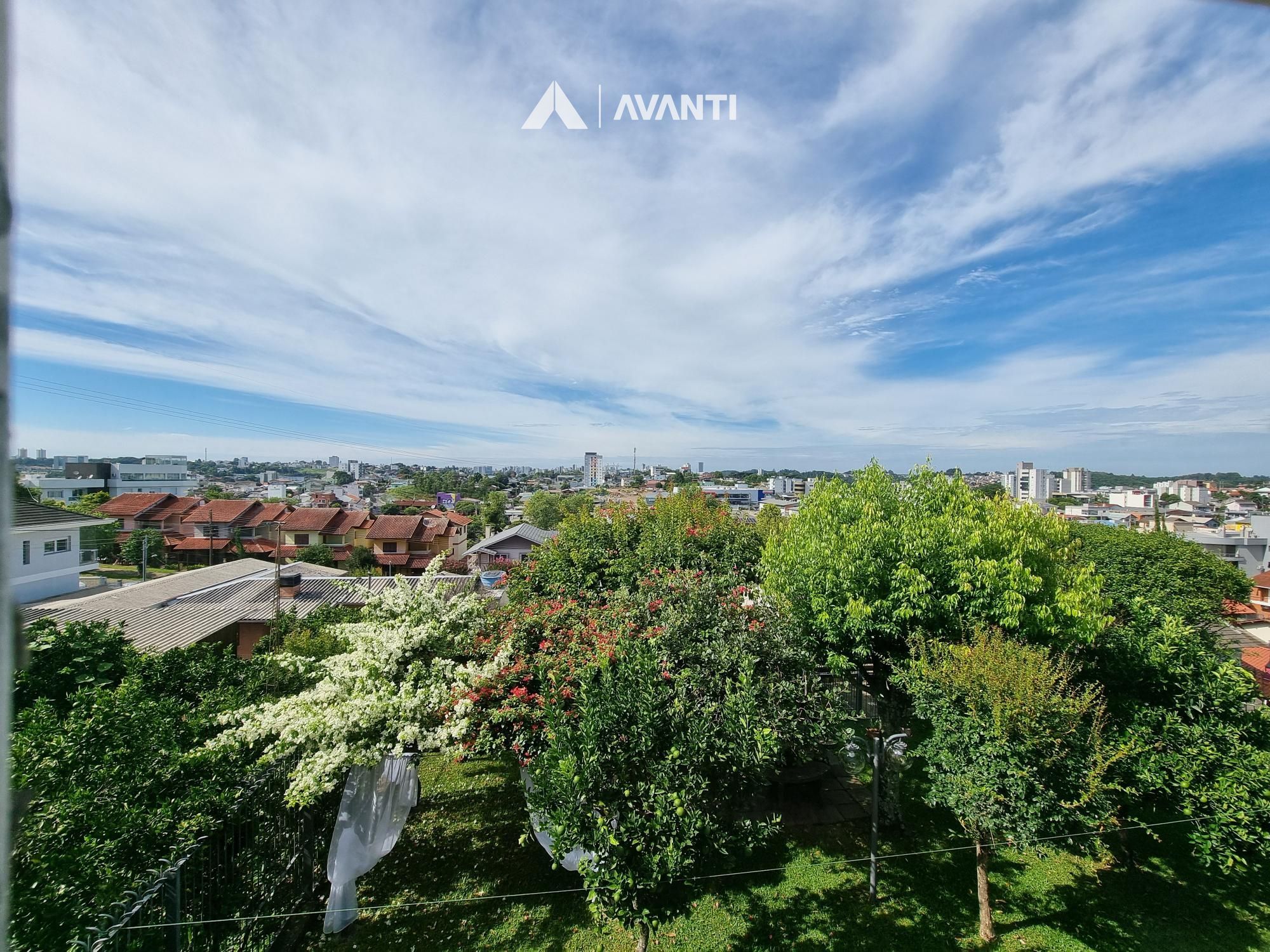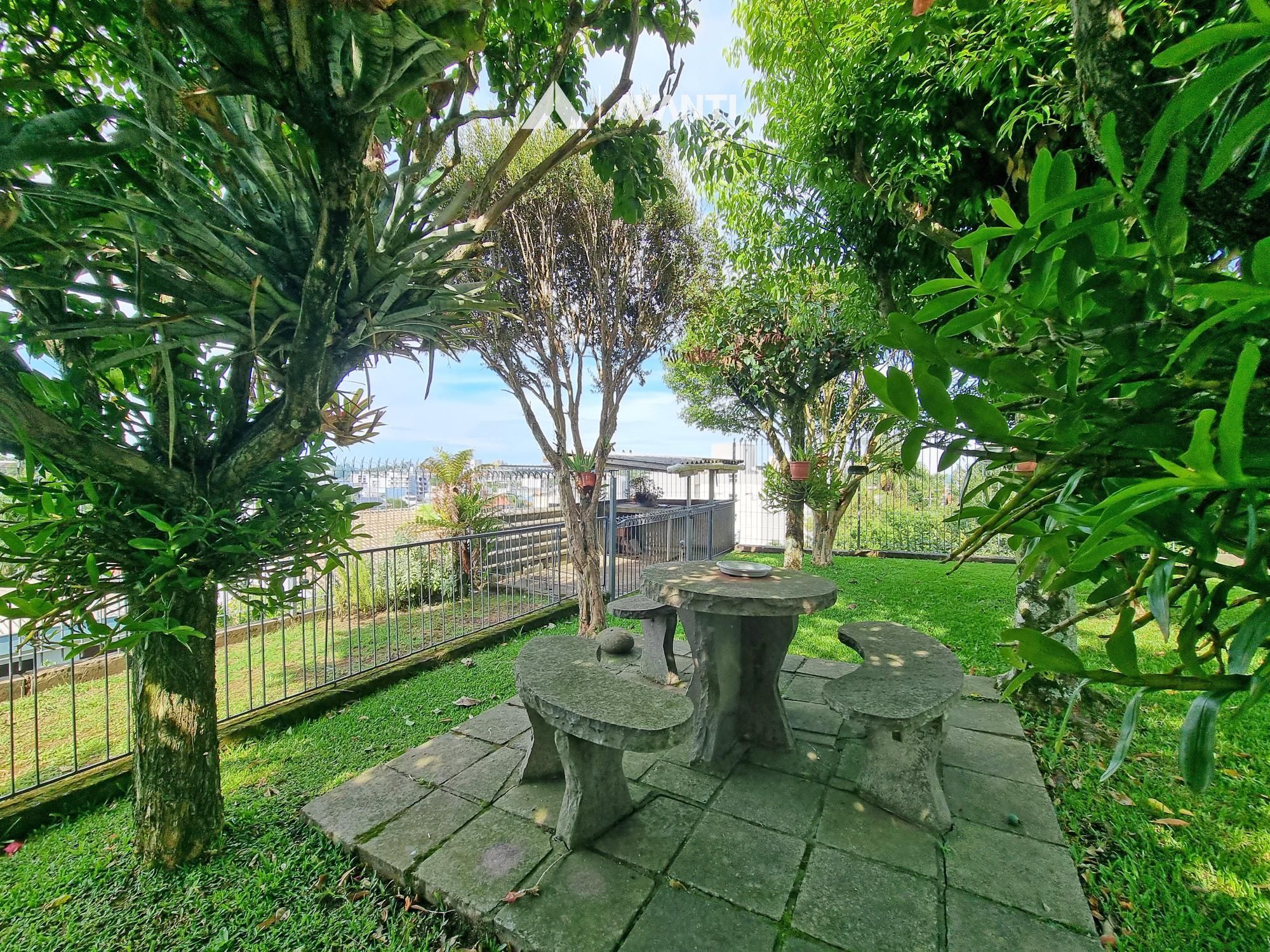Pátio frontal com jardim, quintal privativo com árvores e vista para cidade.