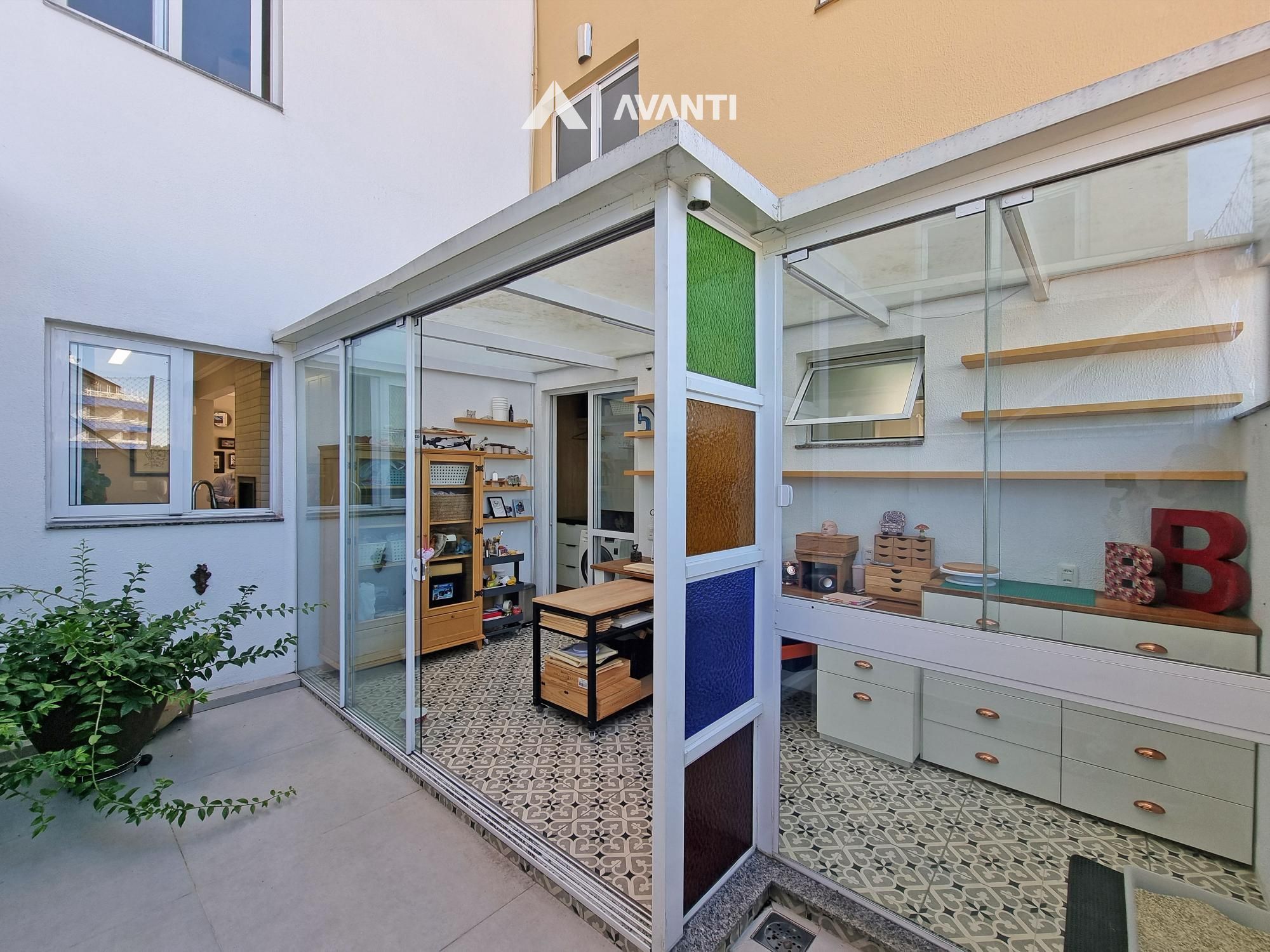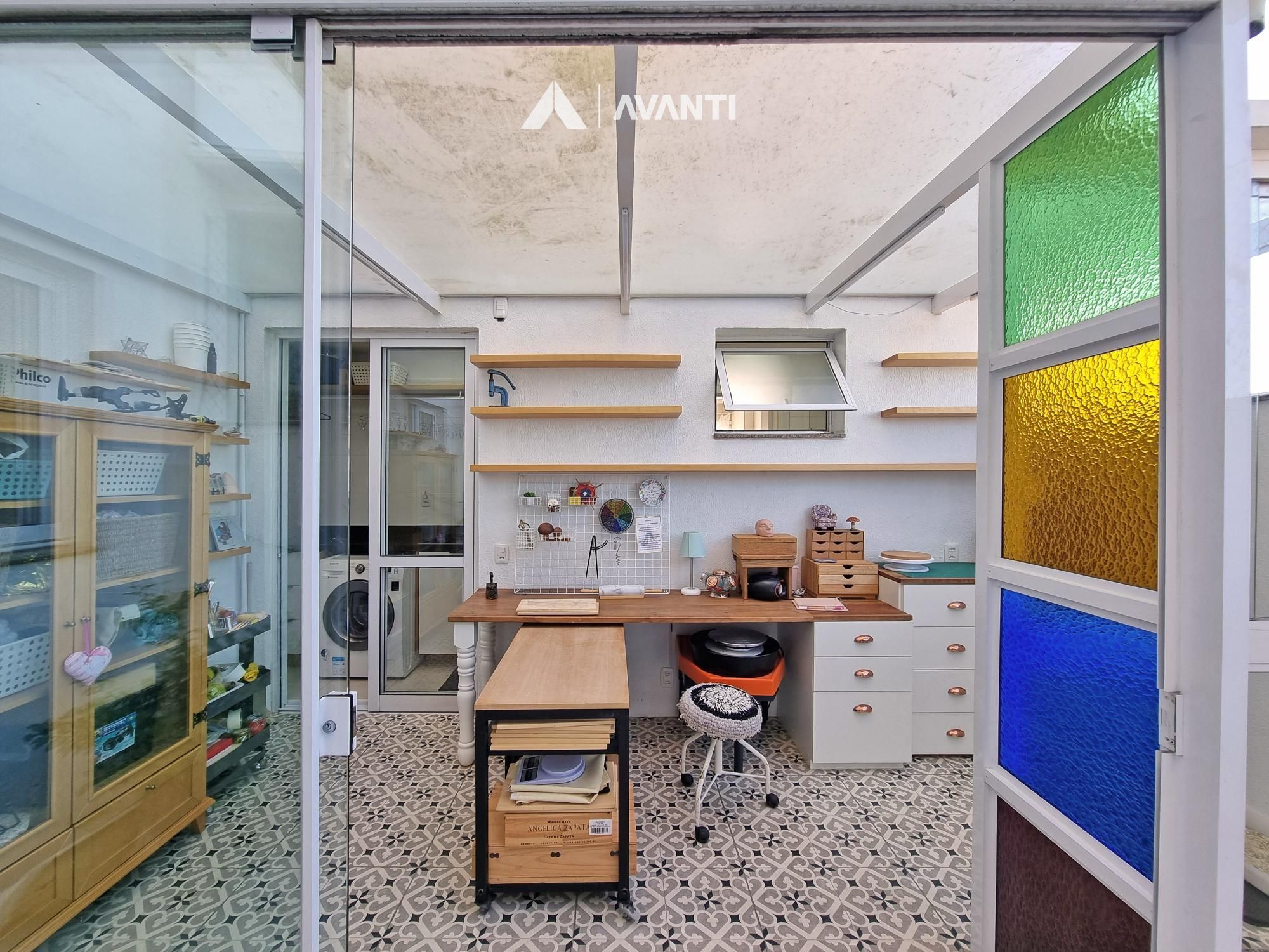 Hall de entrada, sala de estar, cozinha com churrasqueira, área de serviço, terraço fechado adaptado para escritório.
