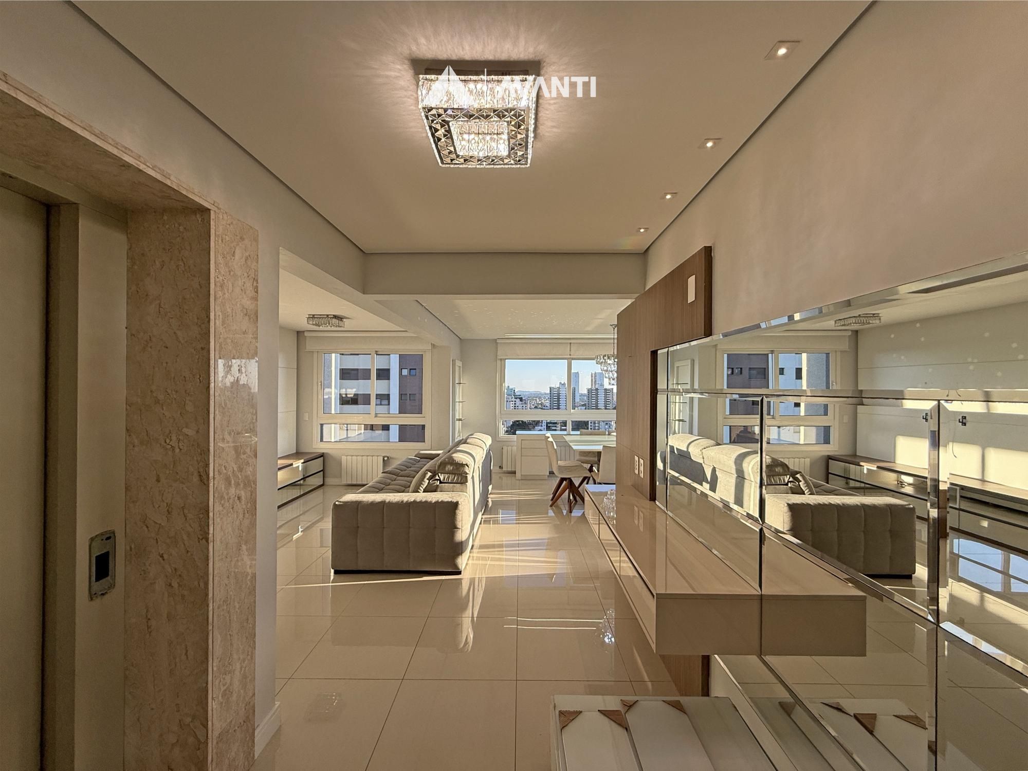 Hall privativo com elevador codificado e lavabo, sala TV com lareira ecológica, sala estar 2 ambientes integrada ao espaço gourmet com vista deslumbrante da cidade. Cozinha americana e área de serviço com banheiro auxiliar.