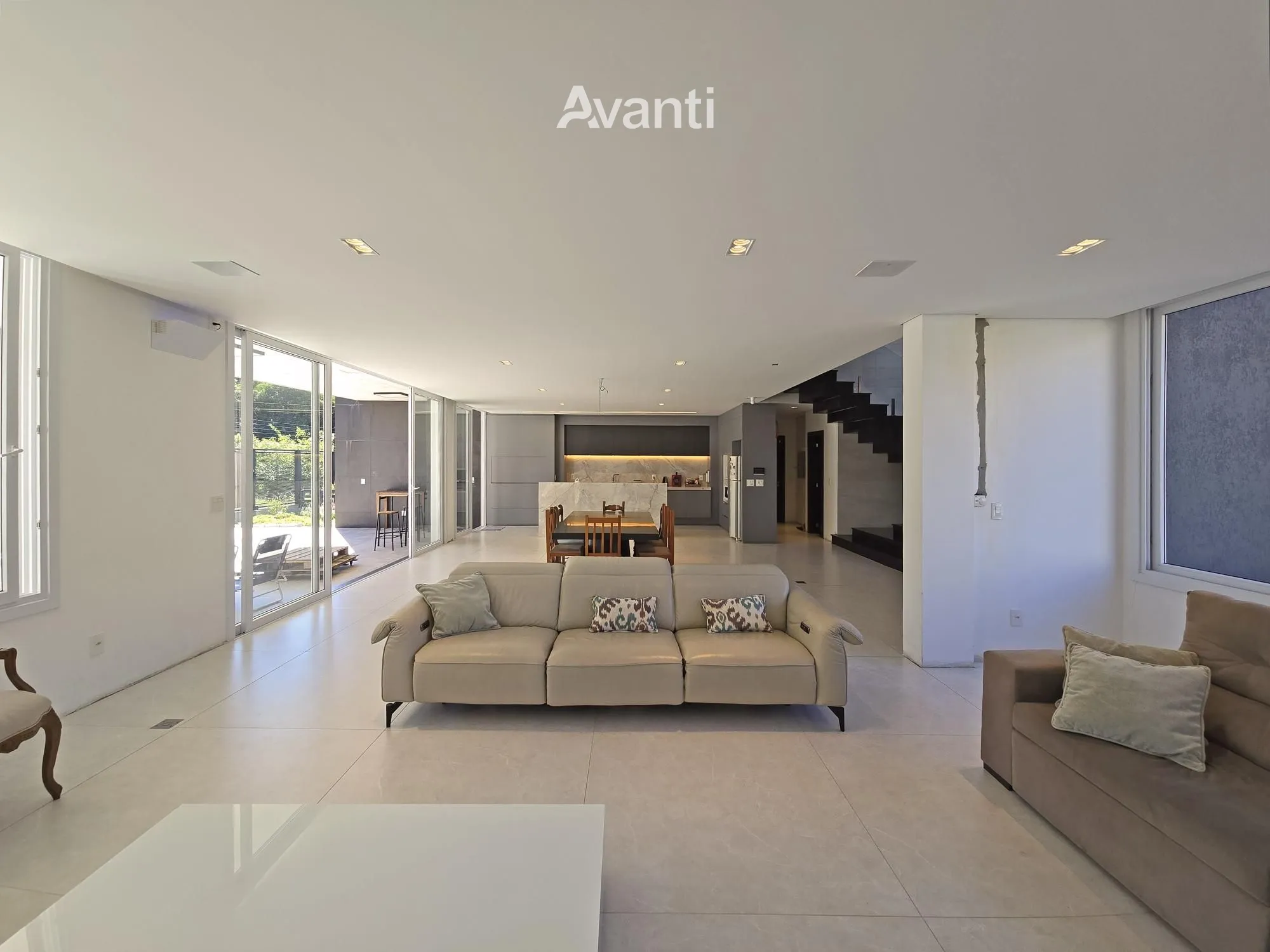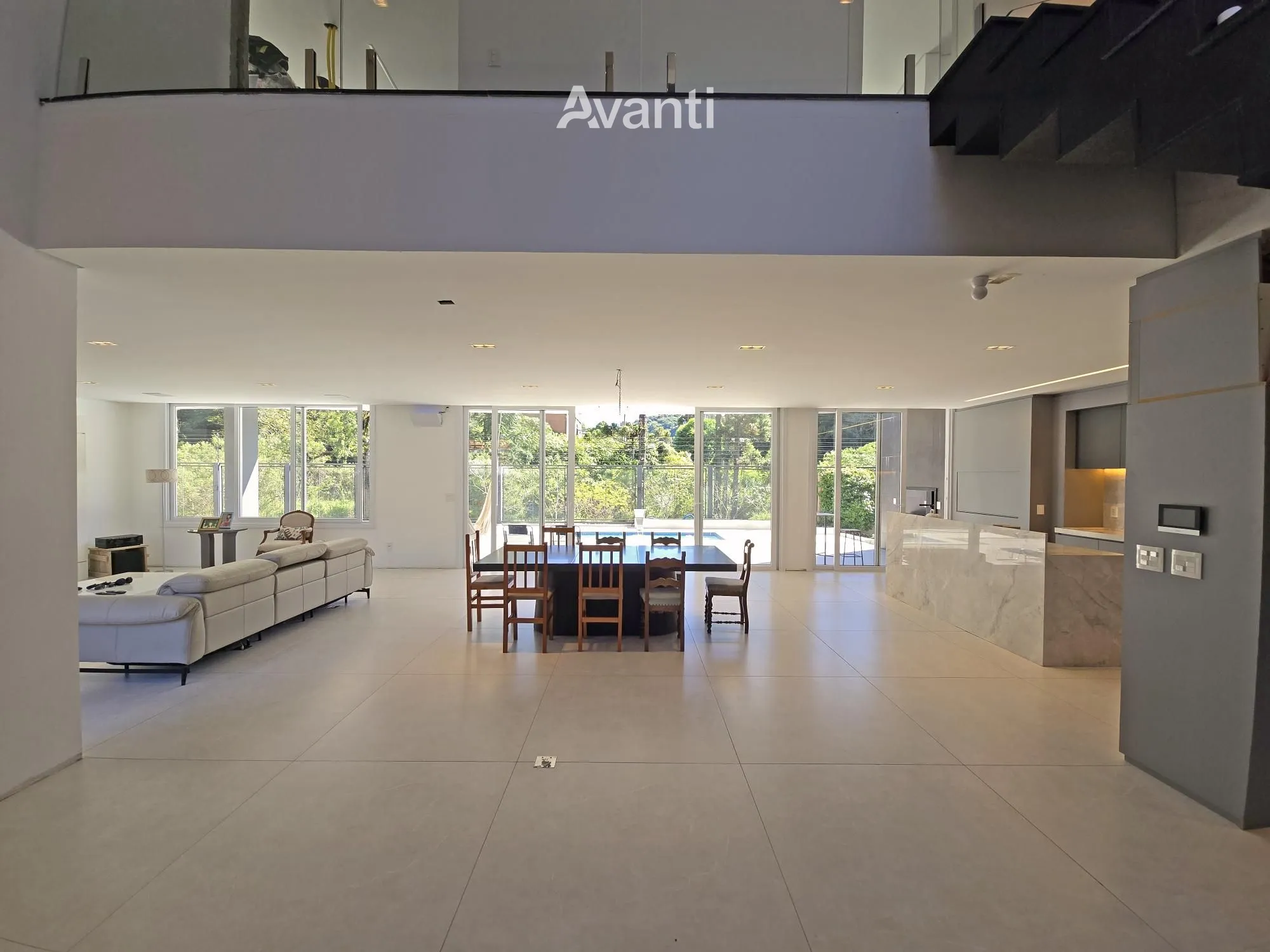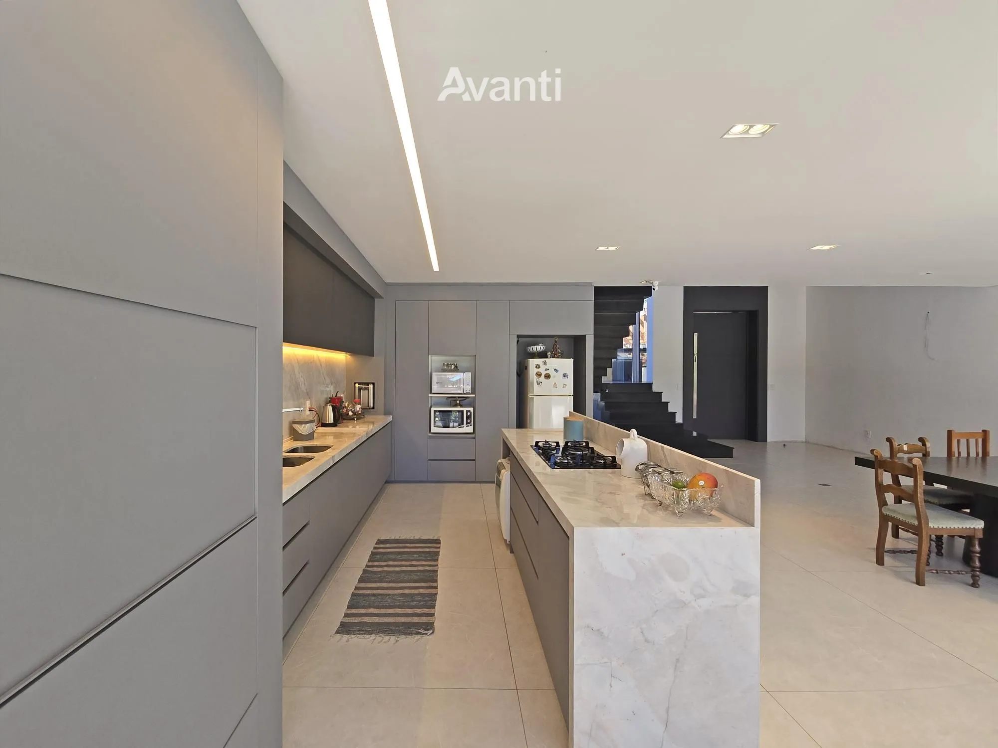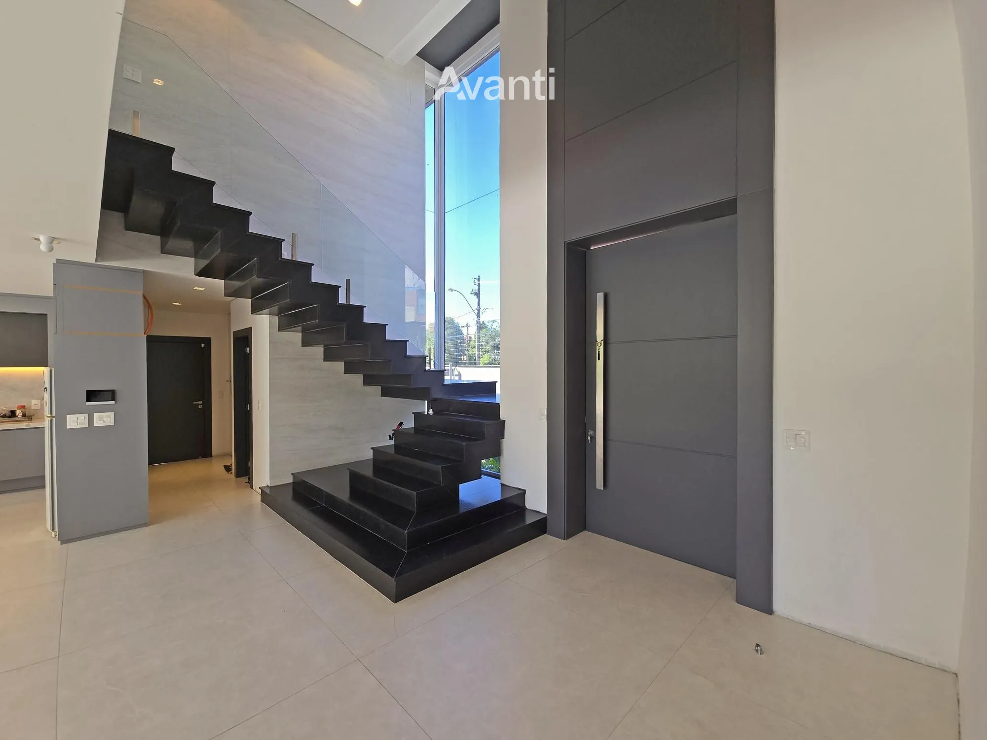 Hall de entrada com pé direito duplo e imponente escadaria em mármore, estar social que comporta sala de estar, sala de jantar, cozinha americana com churrasqueira e lavabo. Garagem fechada para 4 carros com churrasqueira, área de serviço e banheiro auxiliar.