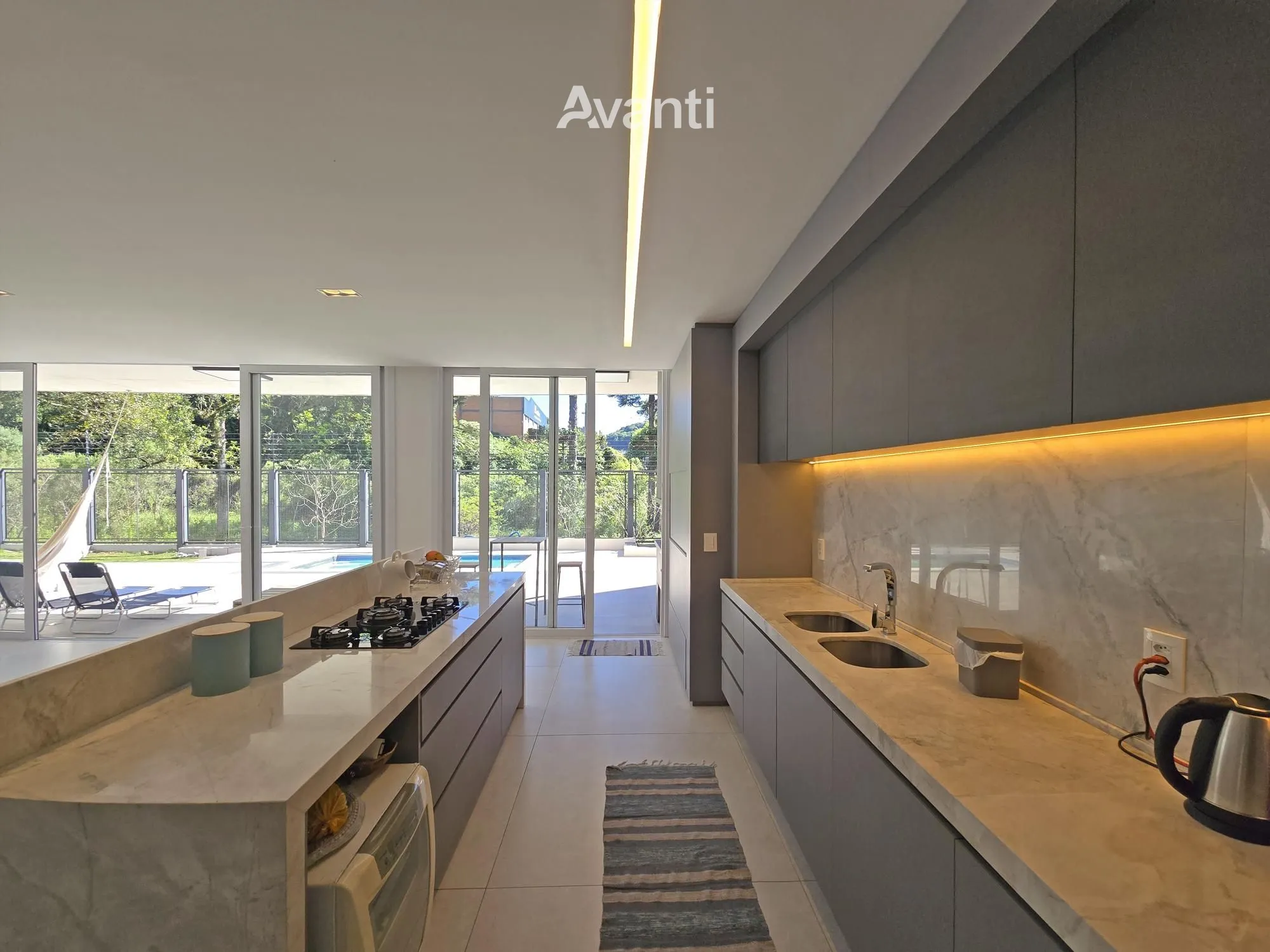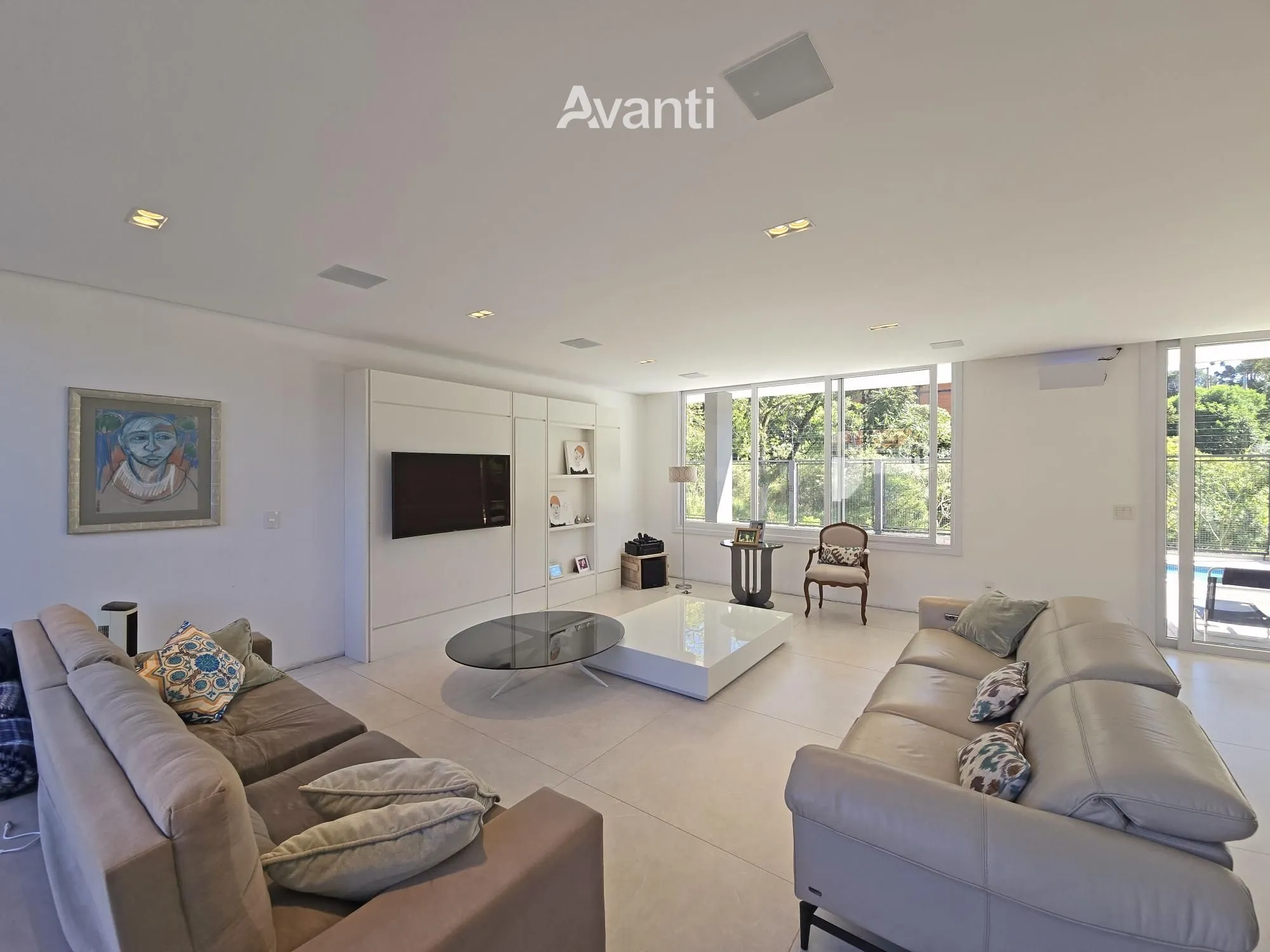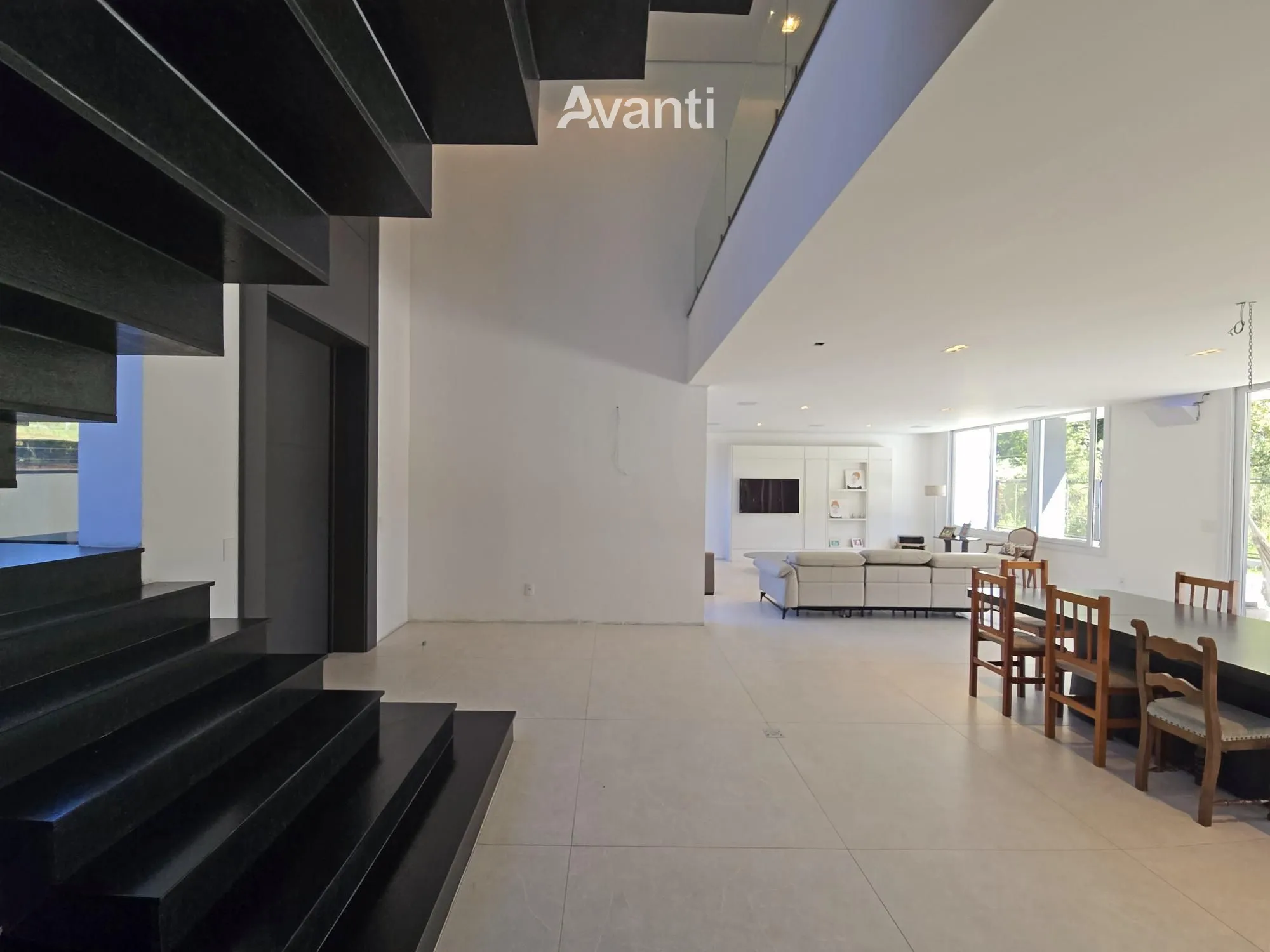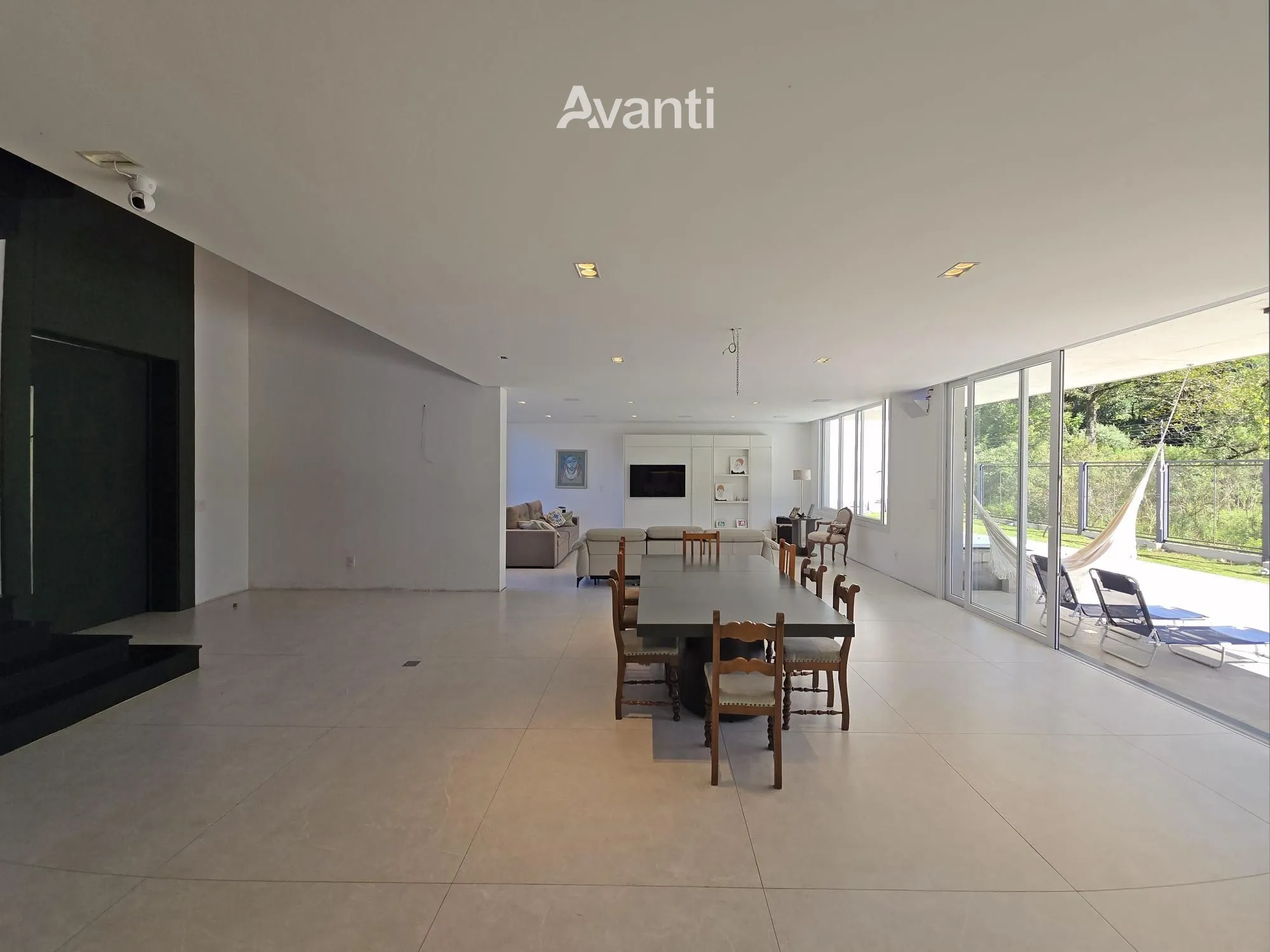Hall de entrada com pé direito duplo e imponente escadaria em mármore, estar social que comporta sala de estar, sala de jantar, cozinha americana com churrasqueira e lavabo. Garagem fechada para 4 carros com churrasqueira, área de serviço e banheiro auxiliar.