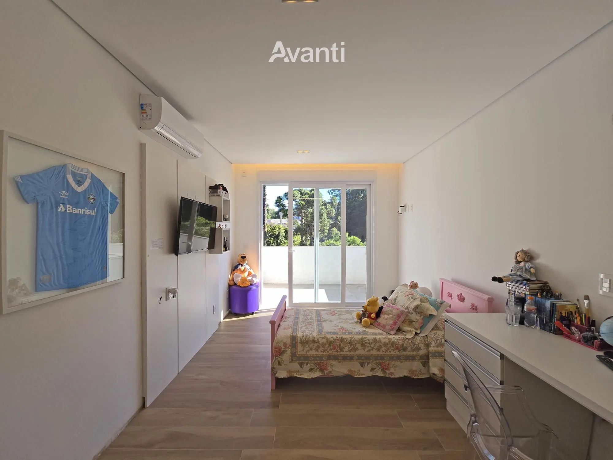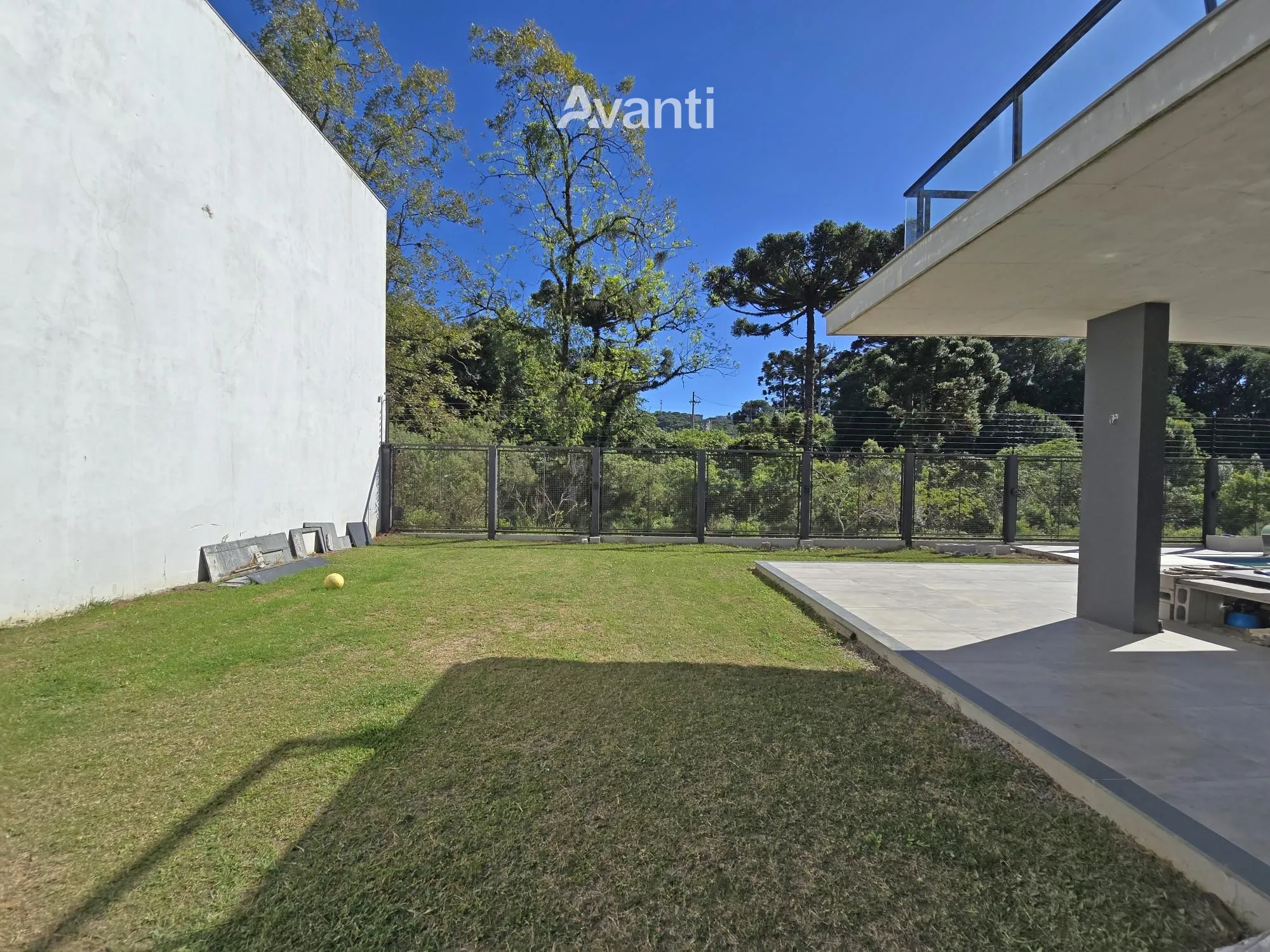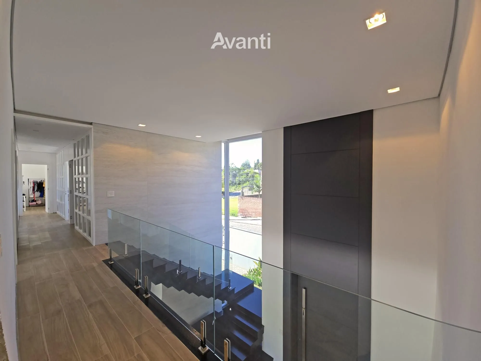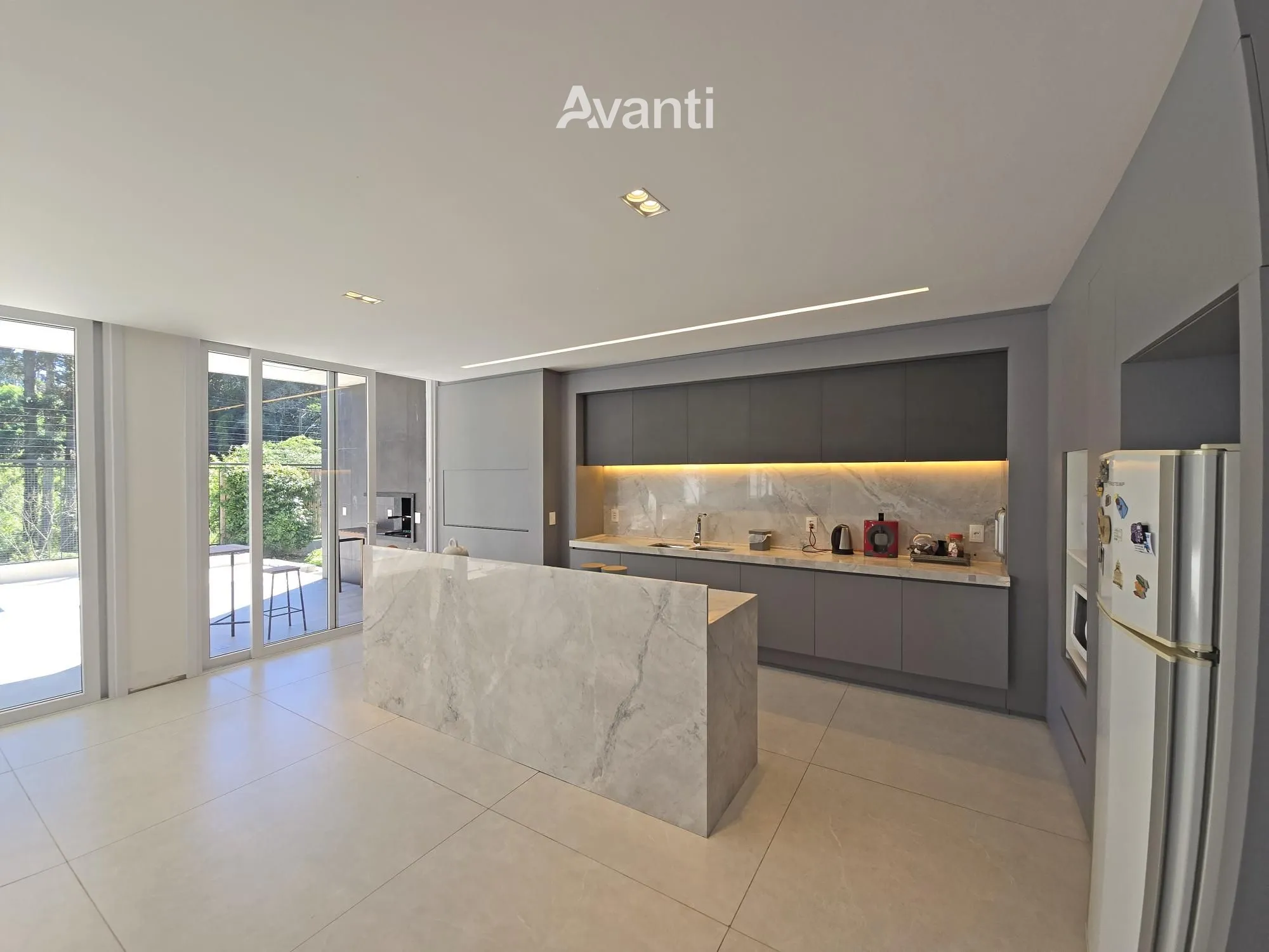Hall de entrada com pé direito duplo e imponente escadaria em mármore, estar social que comporta sala de estar, sala de jantar, cozinha americana com churrasqueira e lavabo. Garagem fechada para 4 carros com churrasqueira, área de serviço e banheiro auxiliar.