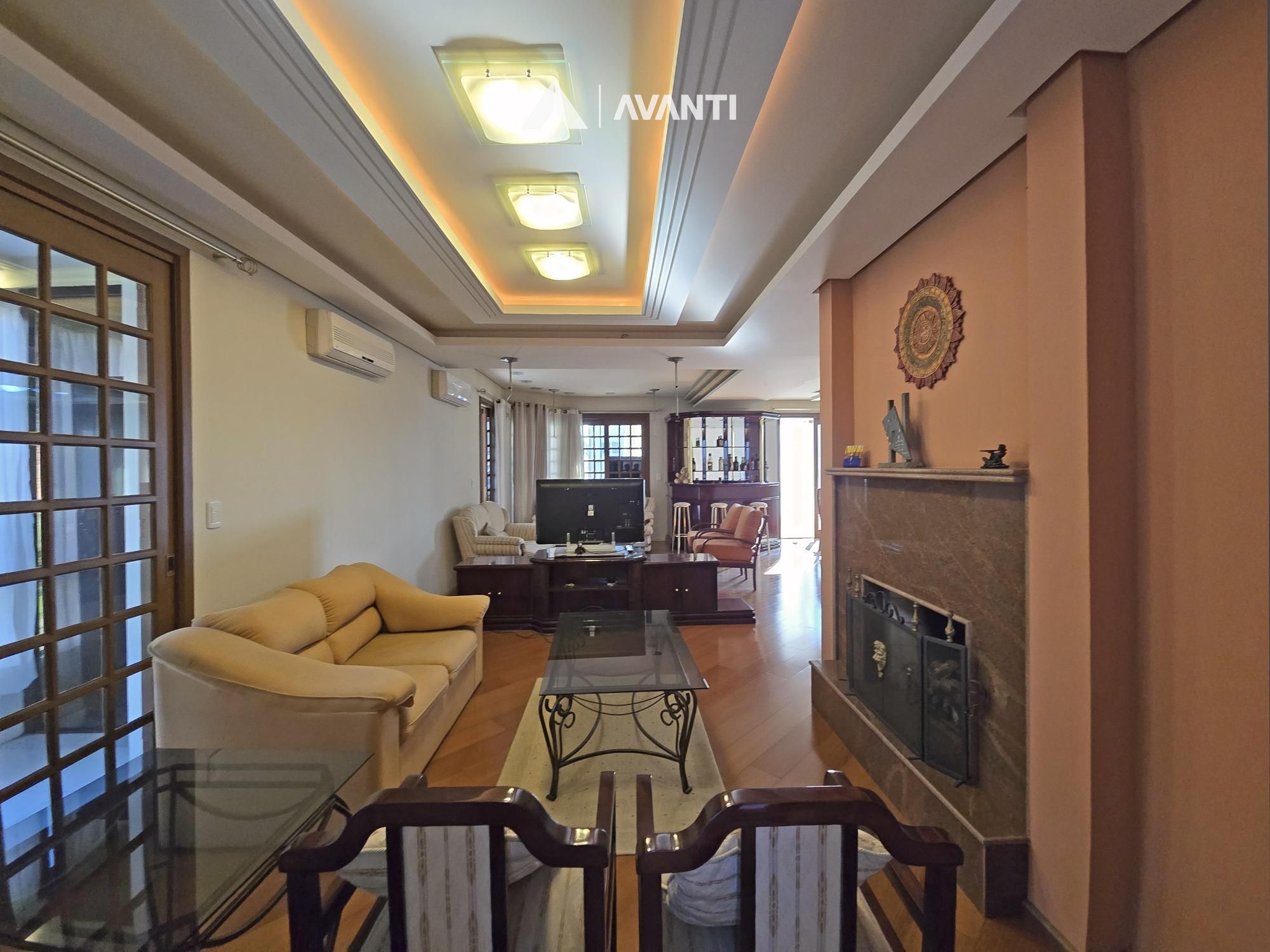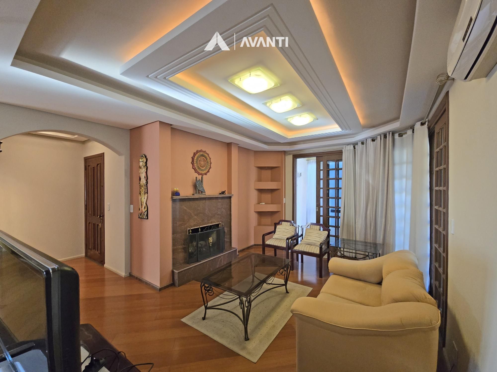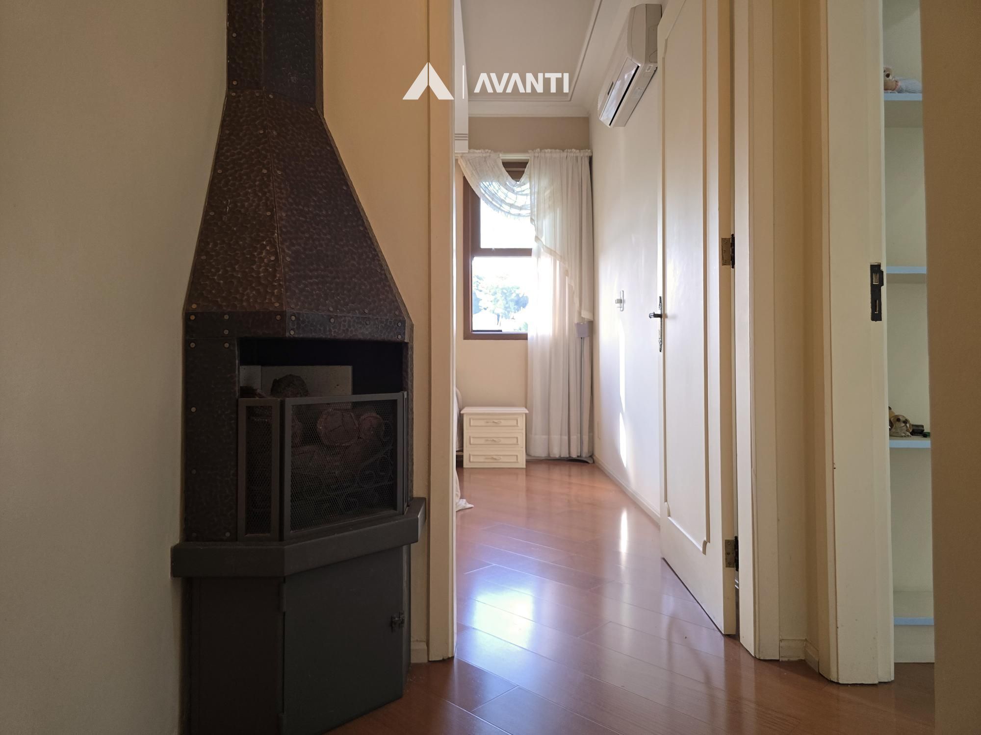 Possui living com lareira e área de serviço com churrasqueira.
