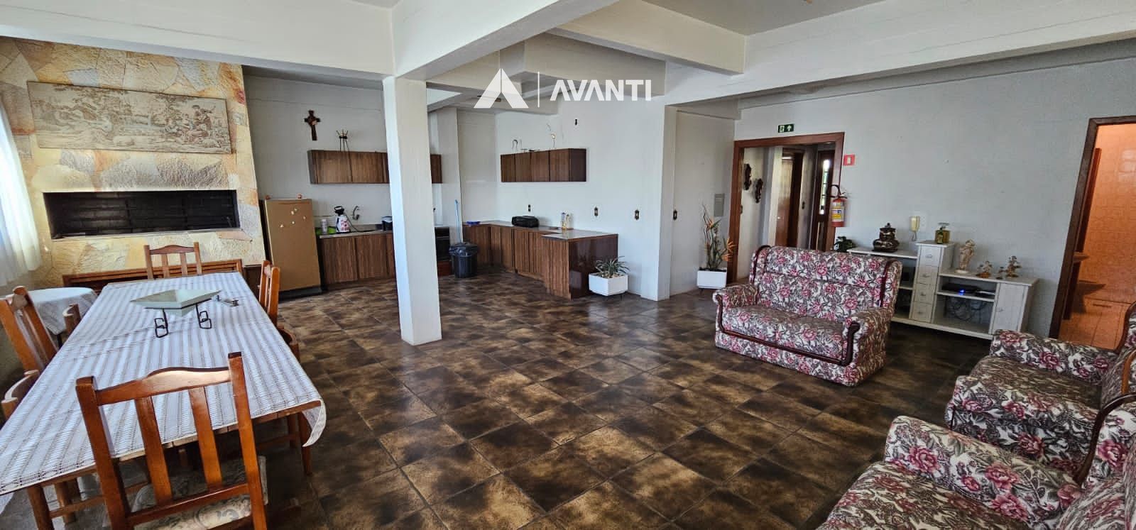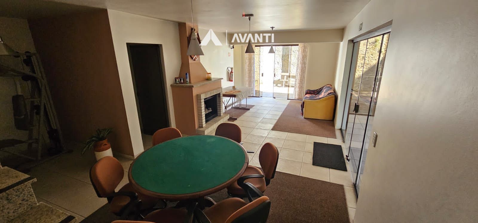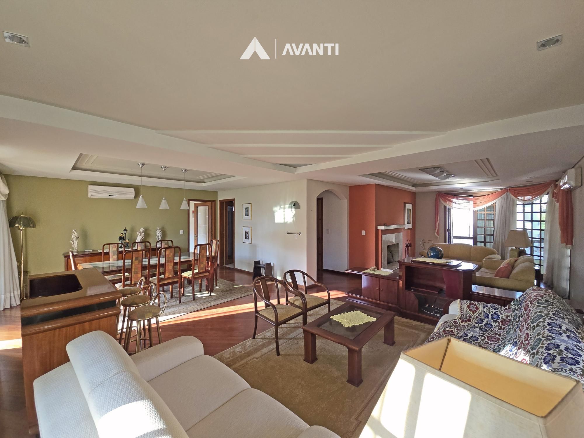 Possui living com lareira e área de serviço com churrasqueira.