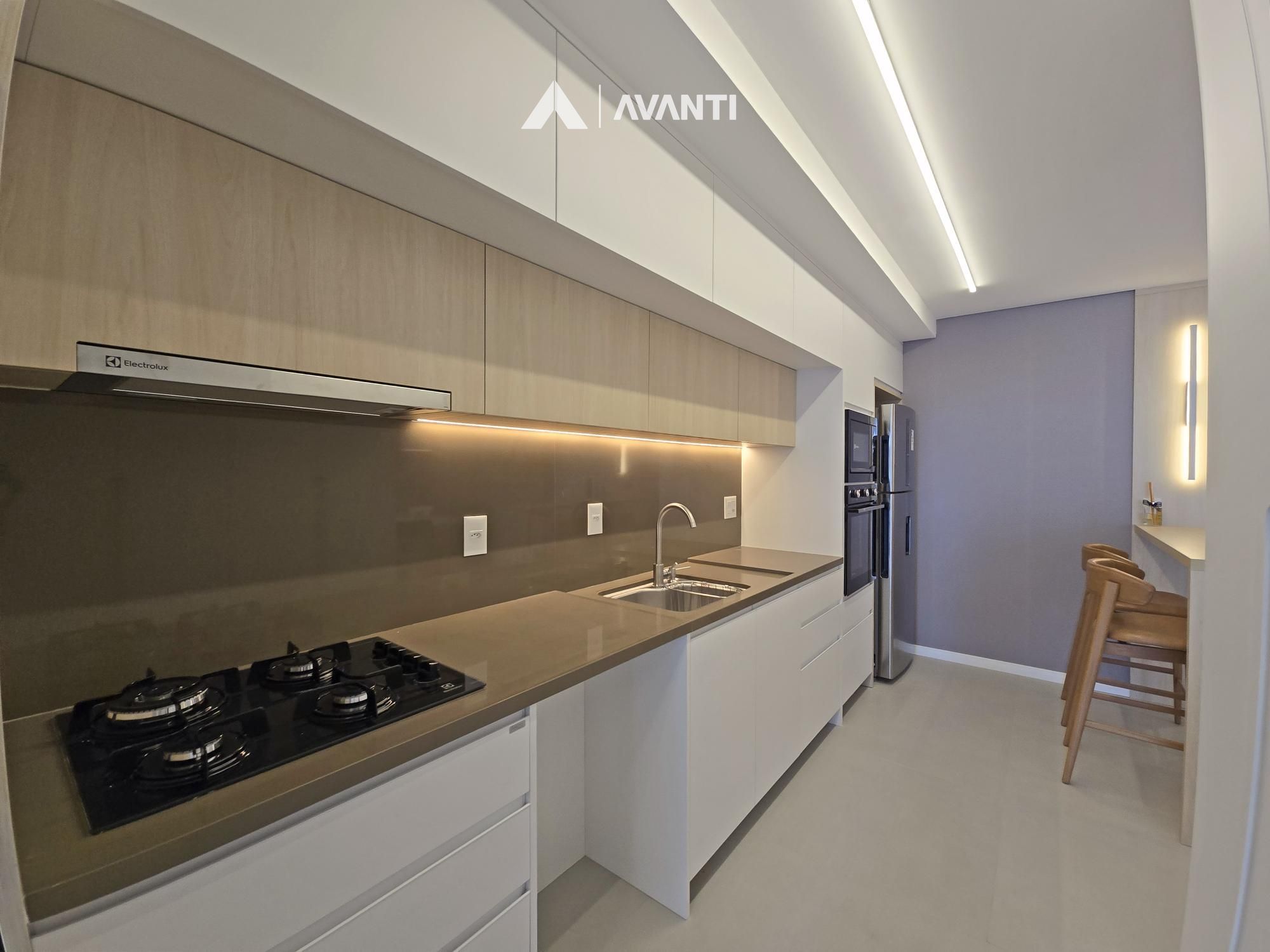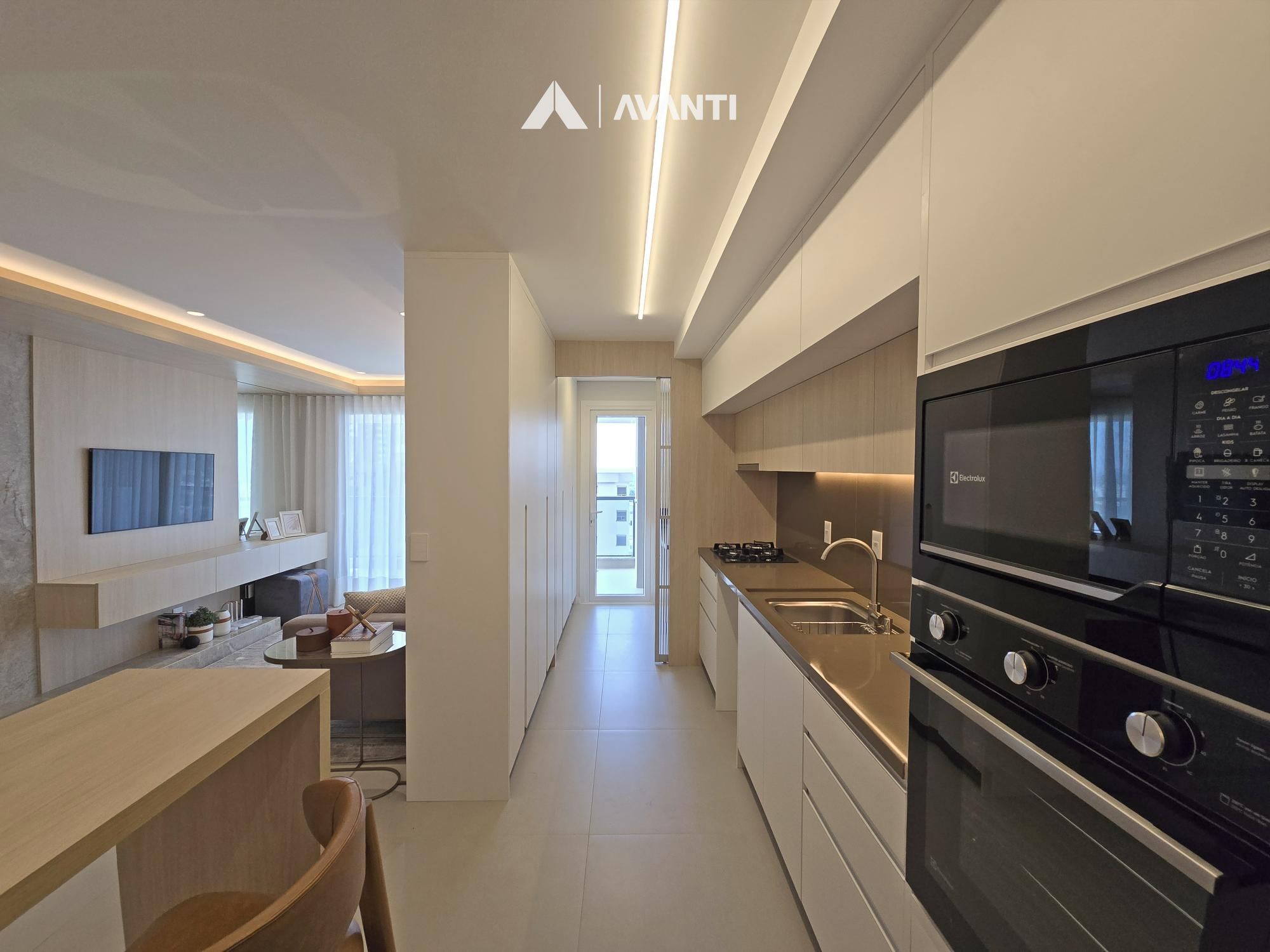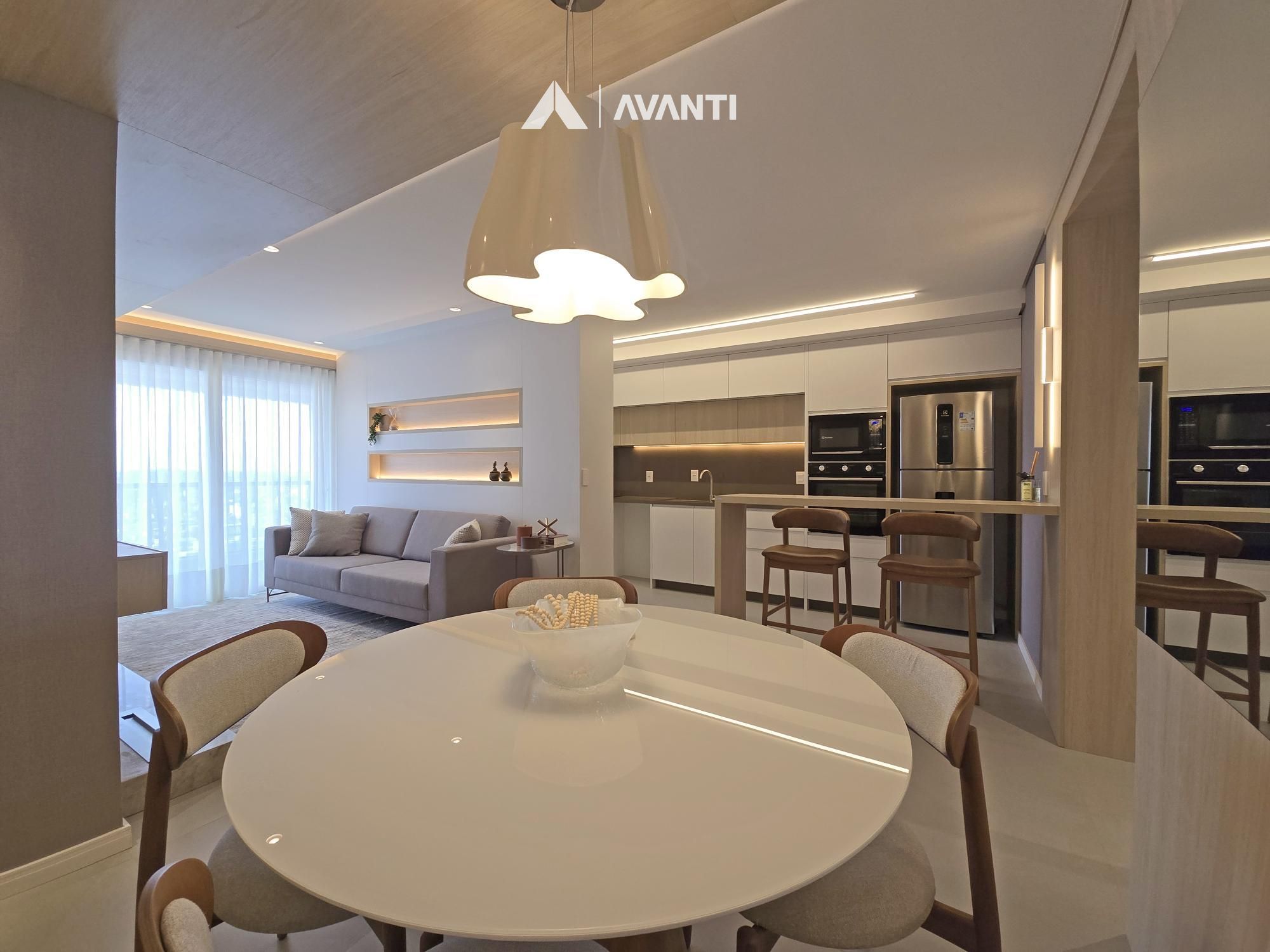 Living integrado que comporta jantar, estar e cozinha com bancada, sacada gourmet com vista para cidade, área de serviço e banheiro social.
