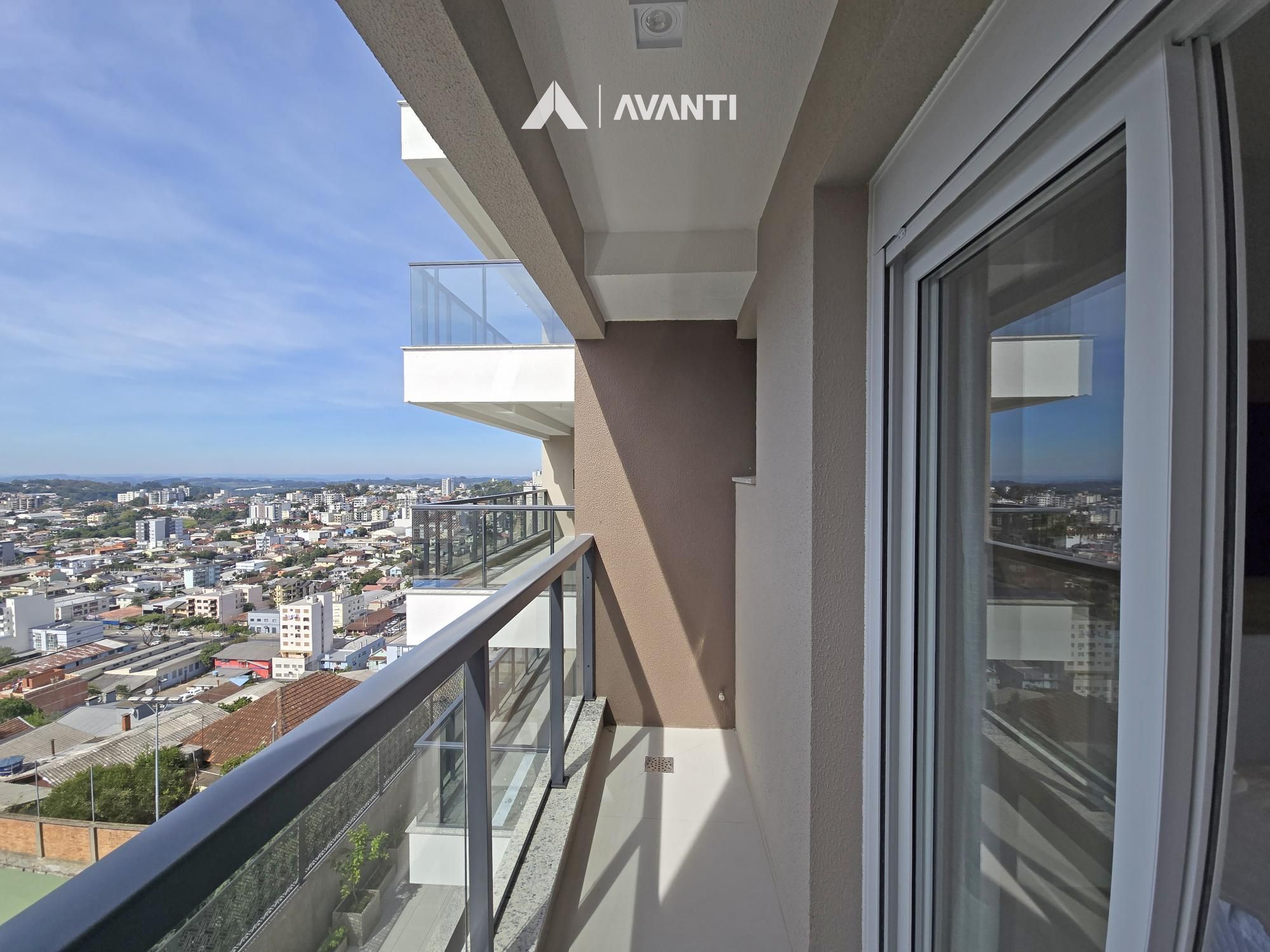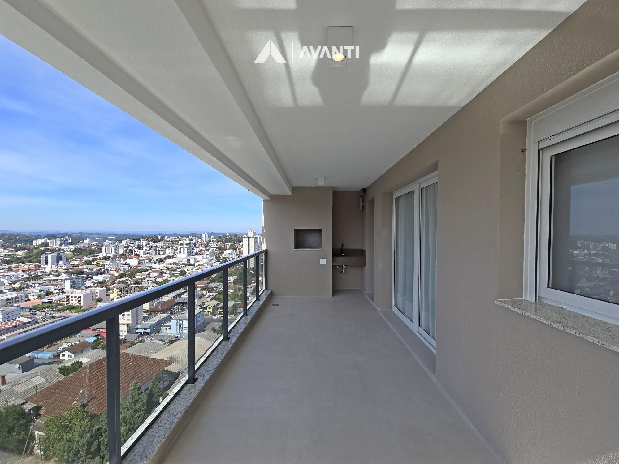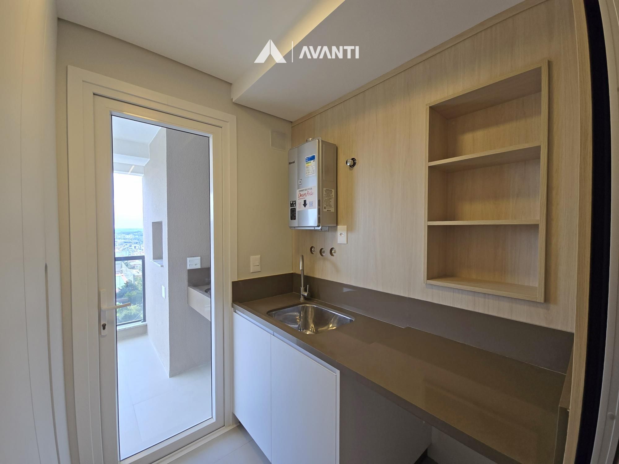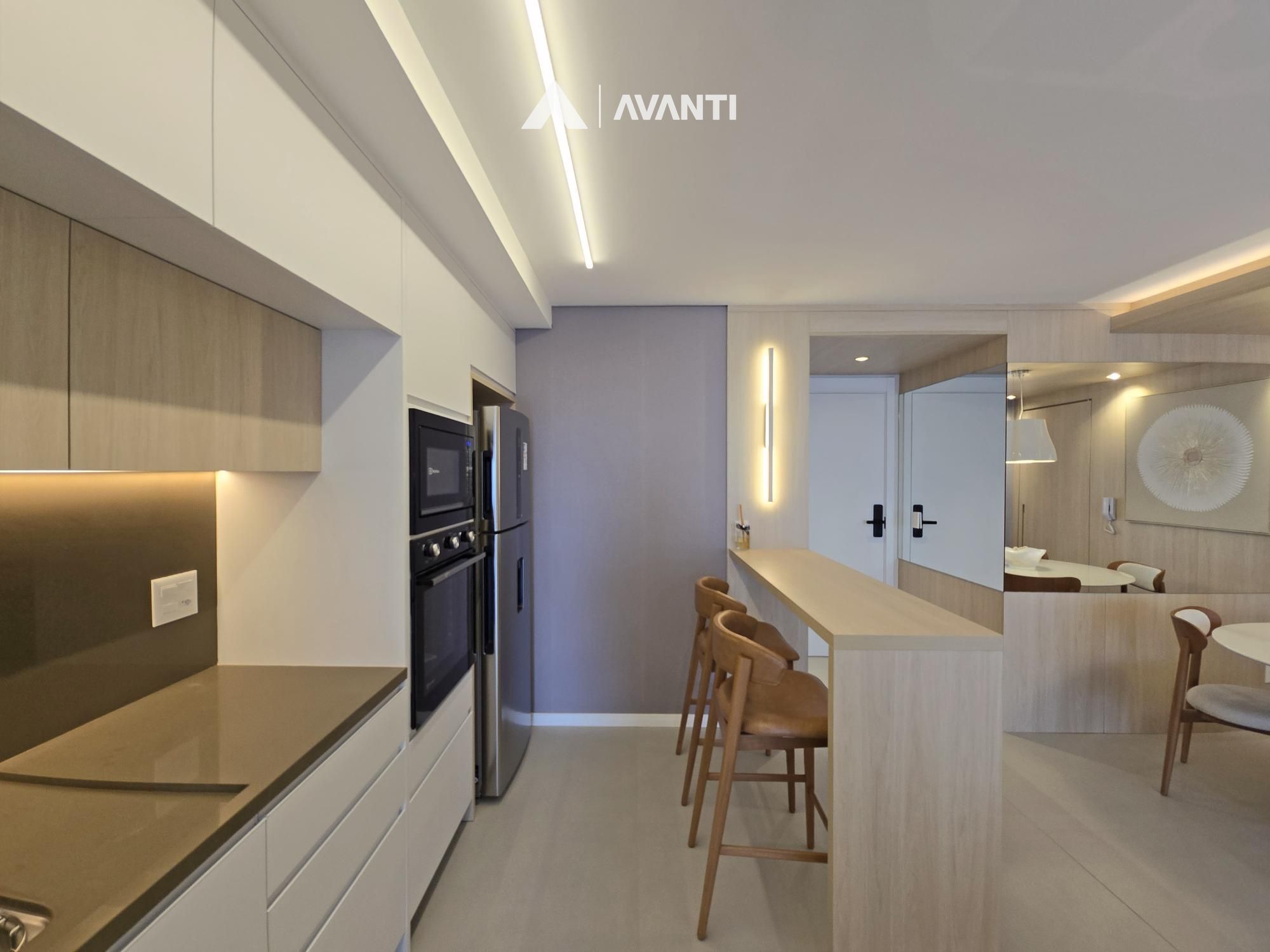 Living integrado que comporta jantar, estar e cozinha com bancada, sacada gourmet com vista para cidade, área de serviço e banheiro social.