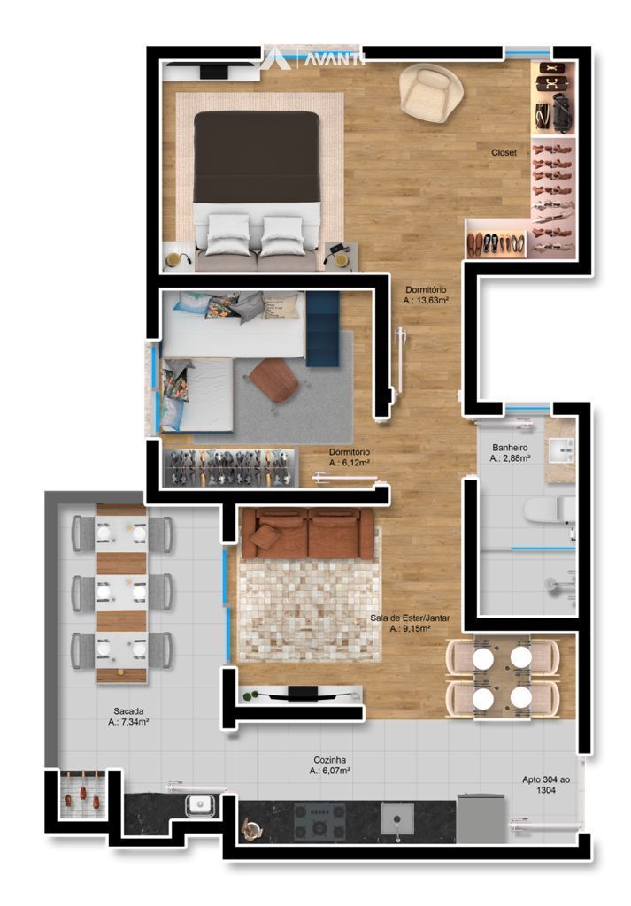 Living integrado com sala, cozinha e acesso para sacada gourmet, banheiro social, espera para água quente , rebaixe em gesso, piso laminado, aberturas em alumínio.