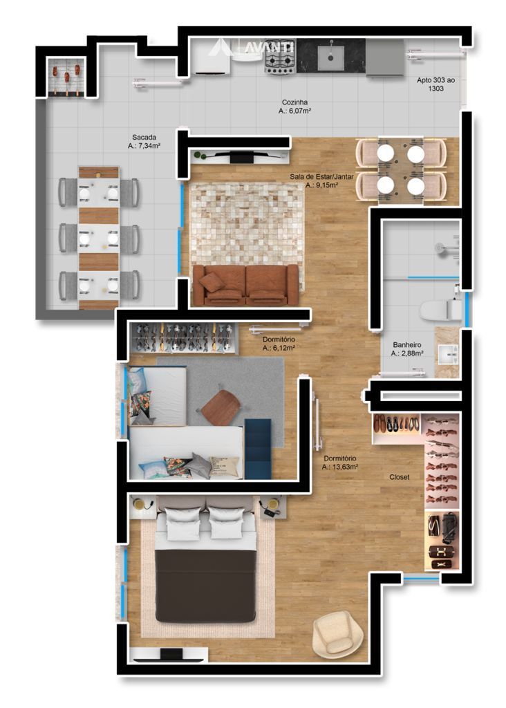 Com 52m² de área privativa, conta com 2 dormitórios sendo 1 suíte e vaga para 1 carro.