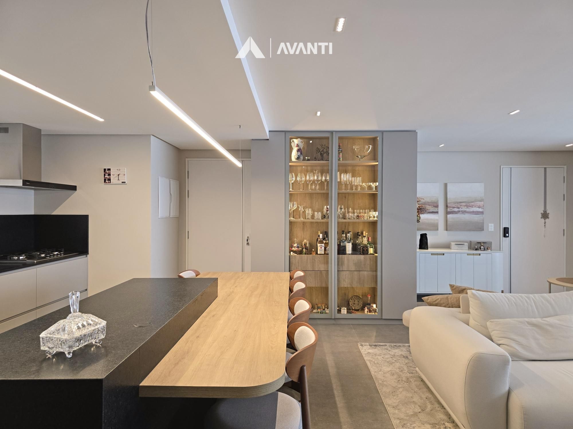 Hall de entrada decorado com lavabo, imponente living em conceito aberto que comporta sacada gourmet com fechamento em PVC, sala de estar e cozinha com bancada.