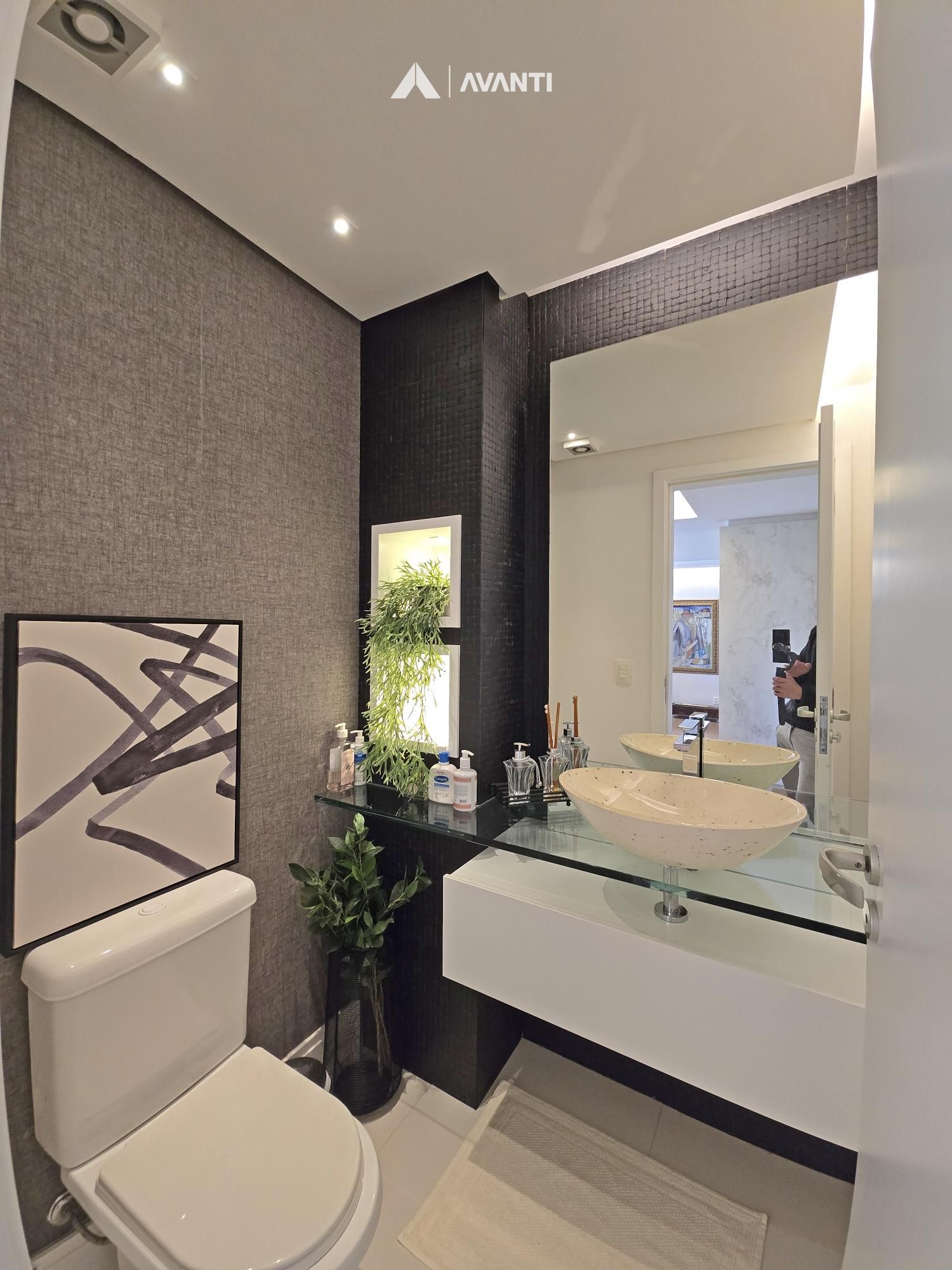 Elevador privativo, hall de entrada com lavabo, sala de estar com adega e sacada, além de sala de jantar integrada à cozinha e ao segundo estar que possui projetor instalado. Área de serviço separada com banheiro auxiliar.
