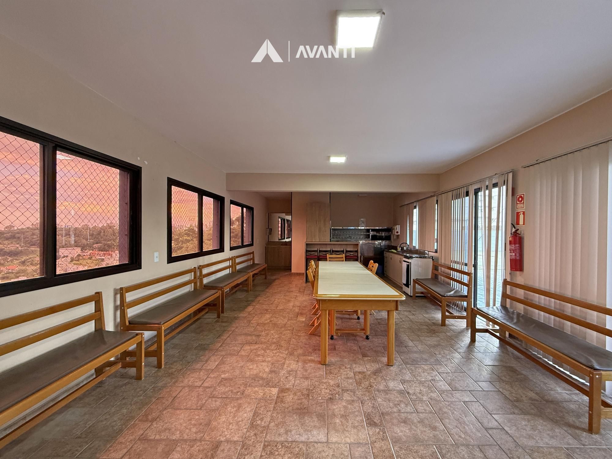 A área íntima conta com 3 dormitórios, sendo 1 suíte, oferecendo privacidade e boa distribuição dos espaços. A cozinha é bem planejada e se conecta à área de serviço com churrasqueira, tornando o ambiente funcional para a rotina e para receber. O apartamento ainda dispõe de banheiro social e posição solar oeste, proporcionando boa iluminação natural.