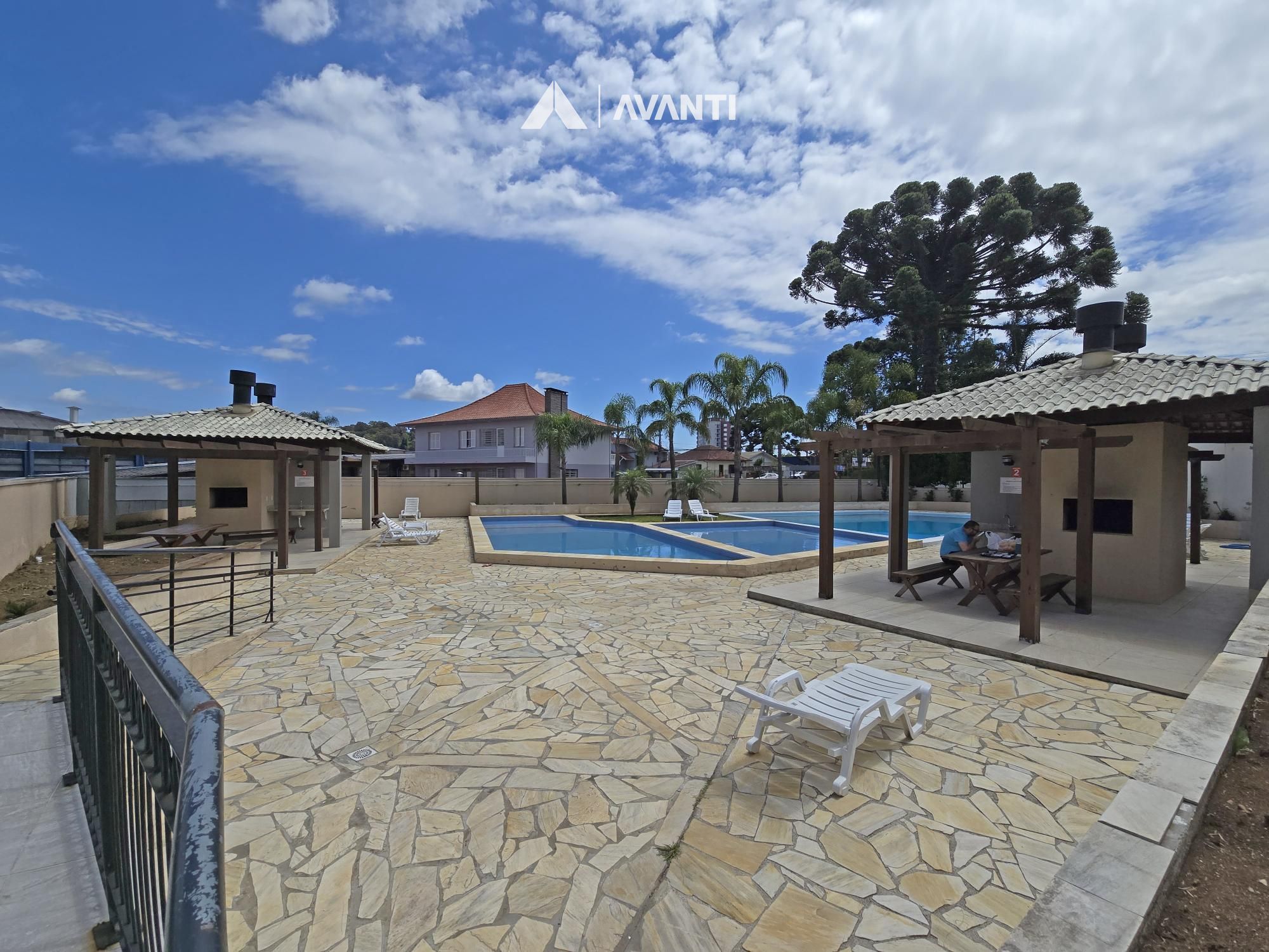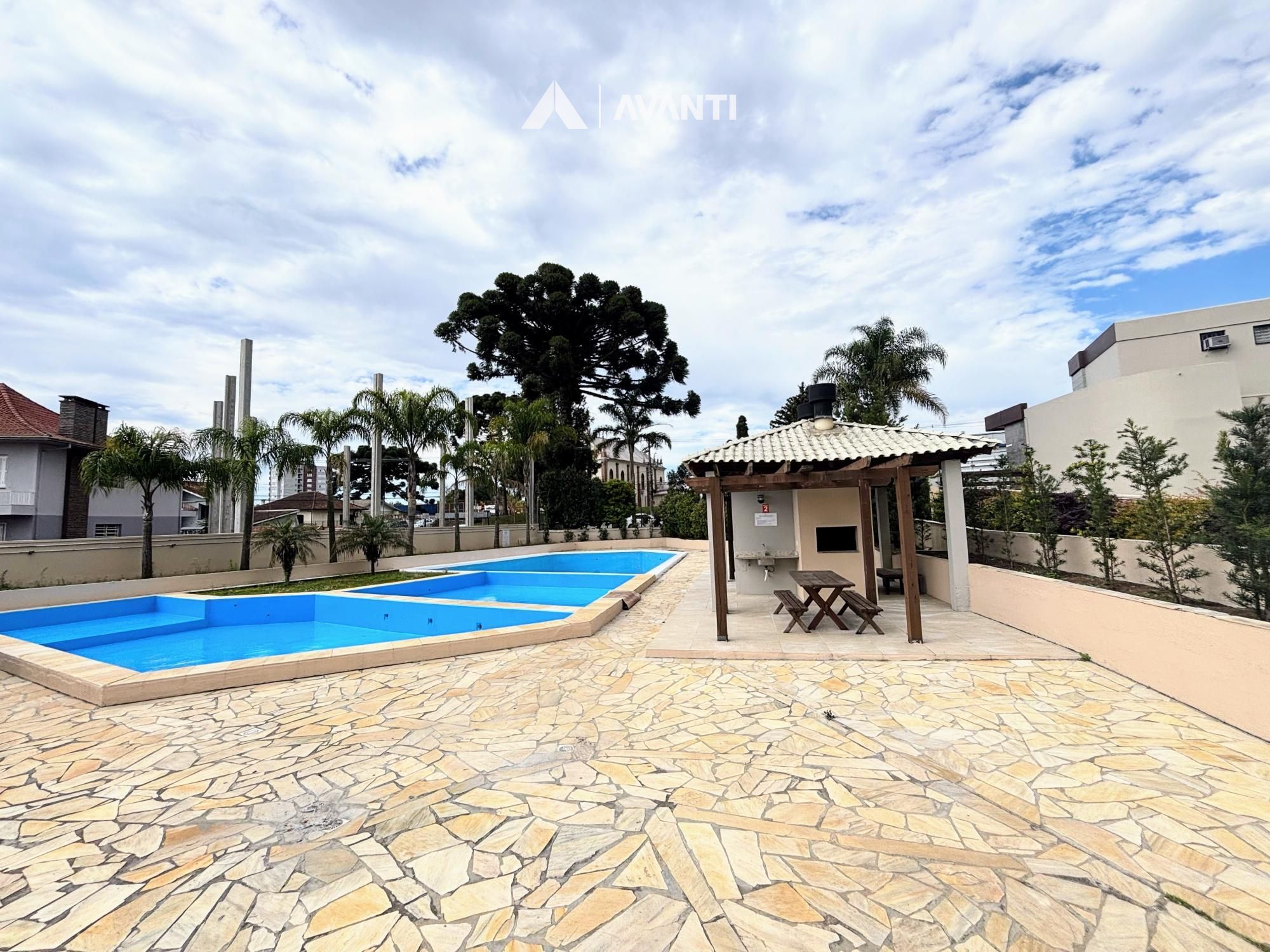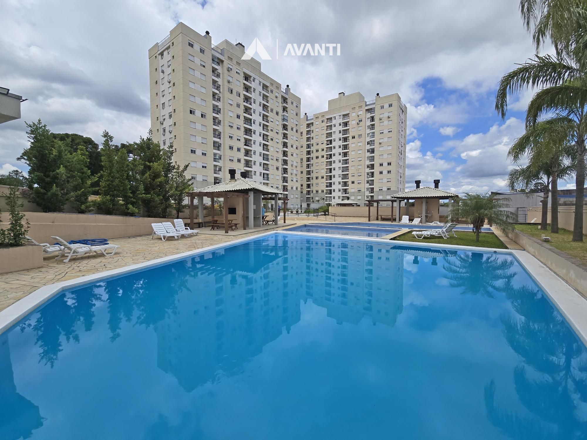 Condomínio com academia, brinquedoteca, elevador, espaço gourmet, salão de festas, piscina e portaria.