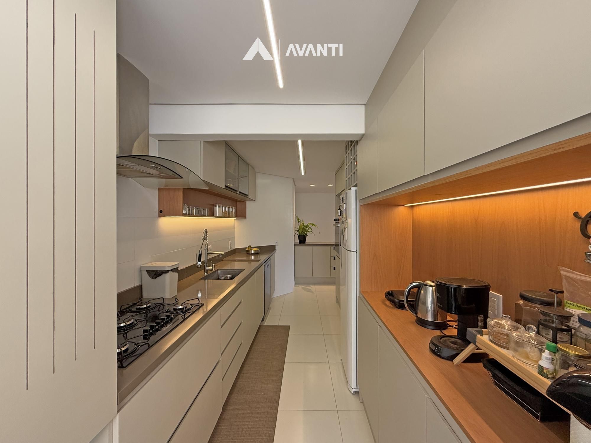 Com excelente orientação solar oeste, o living integrado une sala de jantar, sala de estar e uma charmosa sacada gourmet com fechamento em Reiki — um convite para apreciar o pôr do sol em boa companhia. A cozinha, com bancada funcional, conecta-se à ampla área de serviço, criando uma dinâmica prática e elegante para o dia a dia.