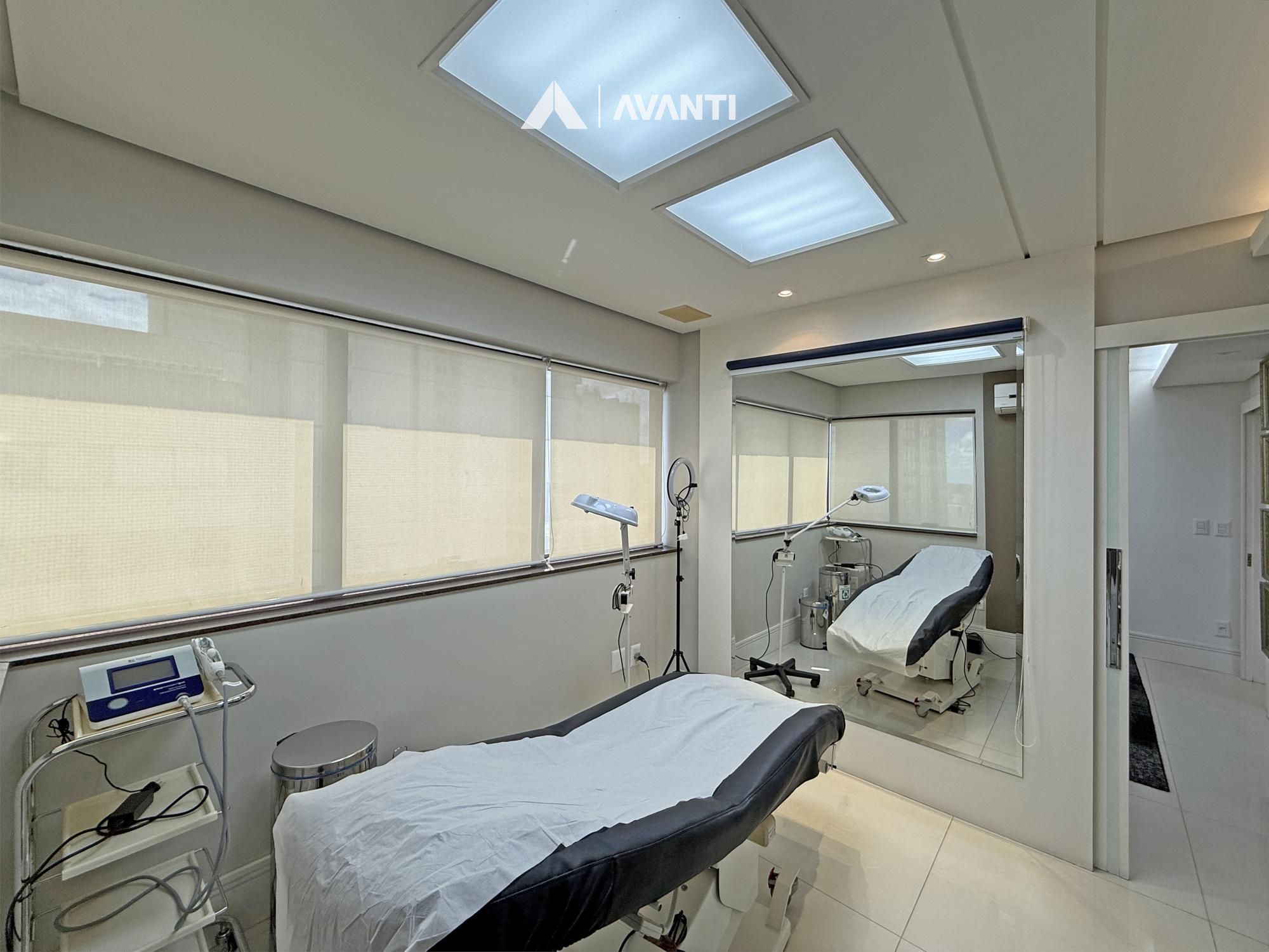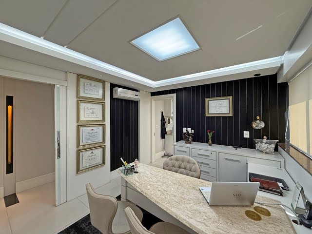 Logo na entrada principal, a recepção acolhedora conta com lavabo e espaço de espera, proporcionando uma experiência agradável desde o primeiro contato. Um segundo acesso independente leva a uma sala de espera com TV e mais um lavabo, ideal para receber diferentes perfis de público com discrição e organização.