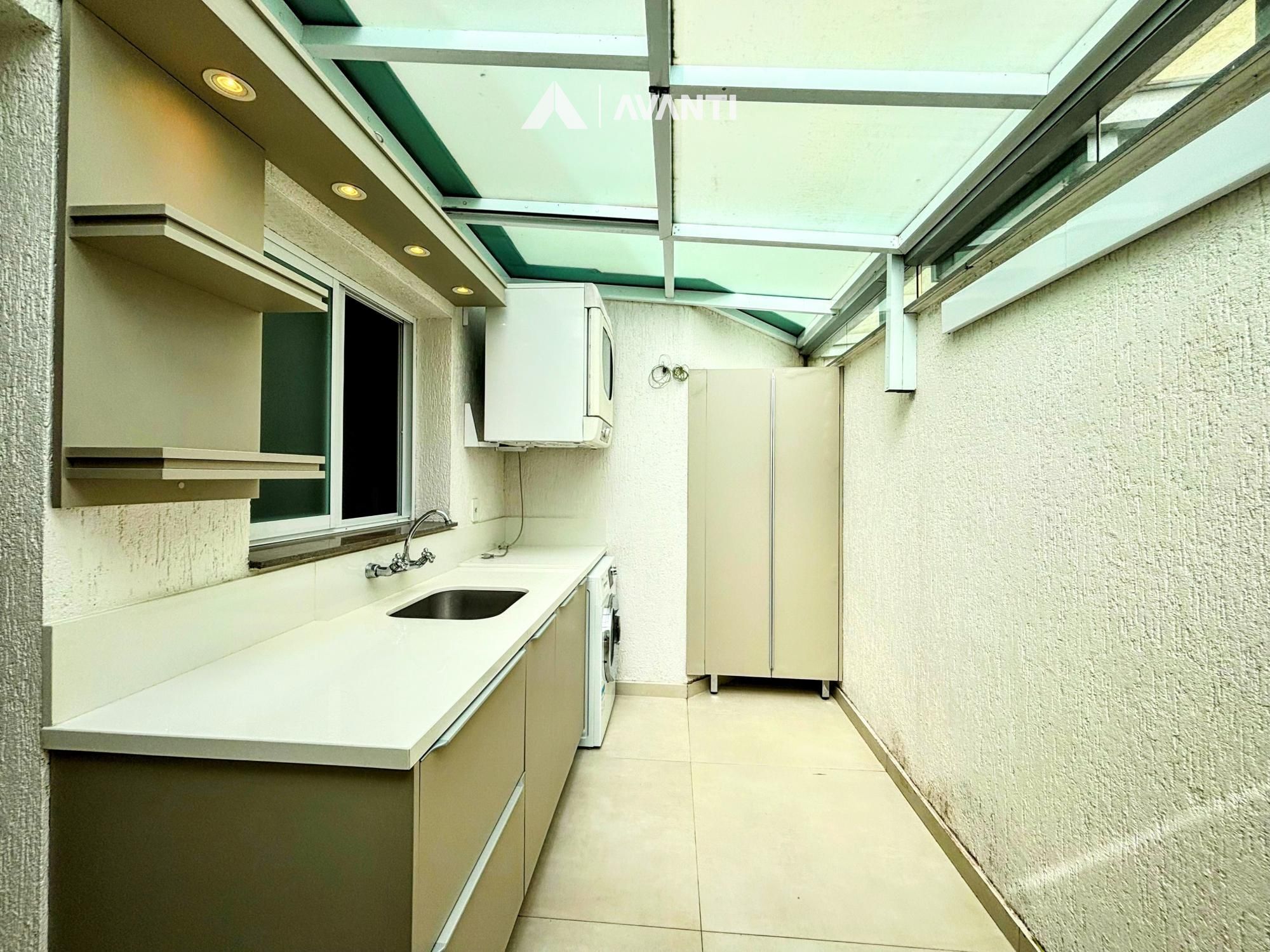 Living integrado, sacada fechada com churrasqueira, banheiro social e área de serviço.