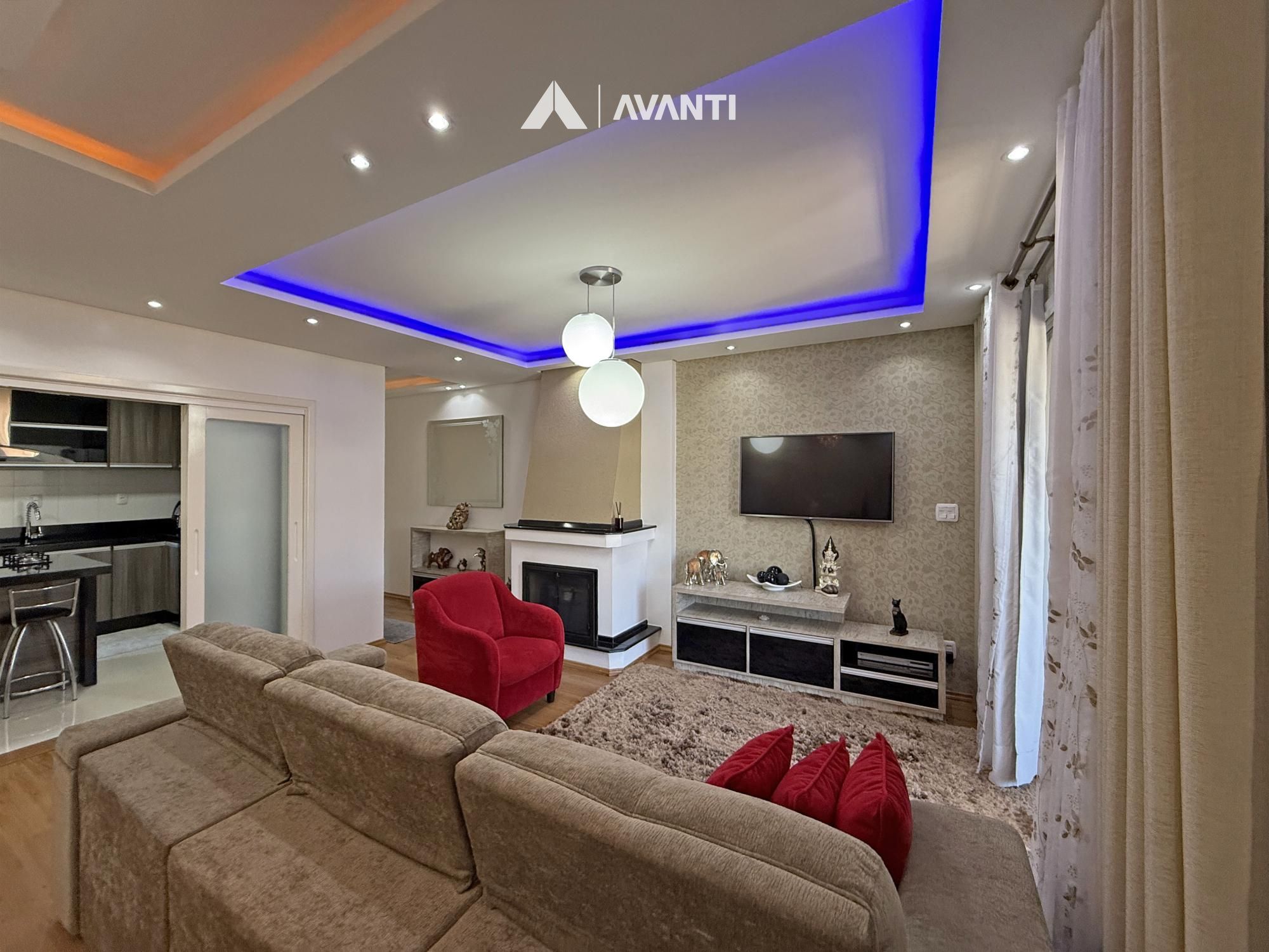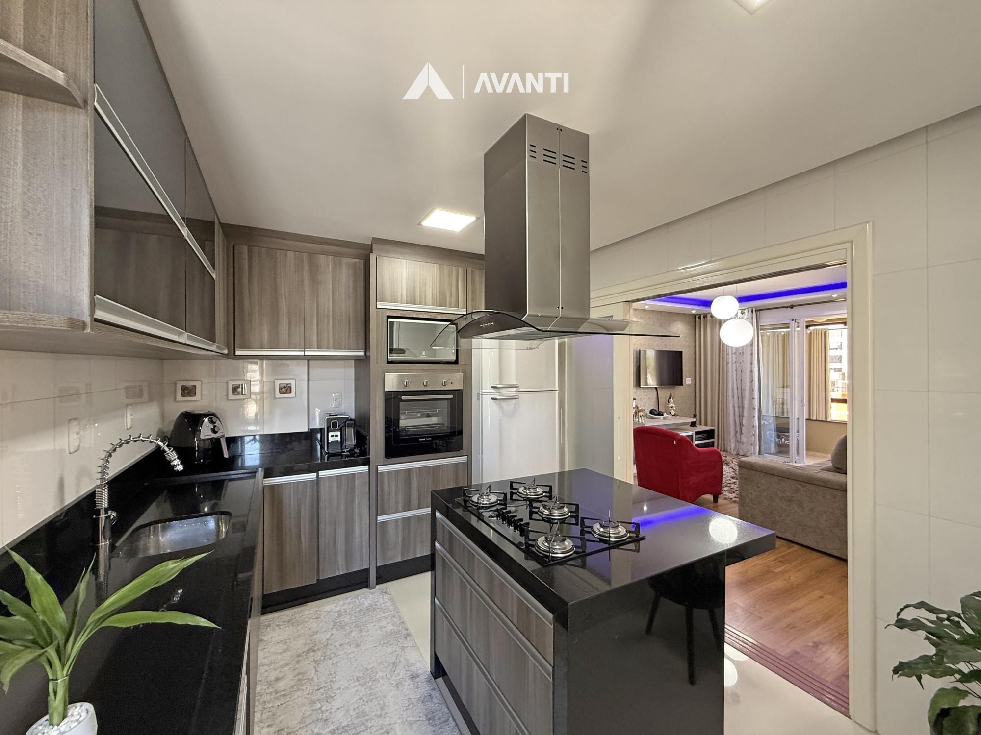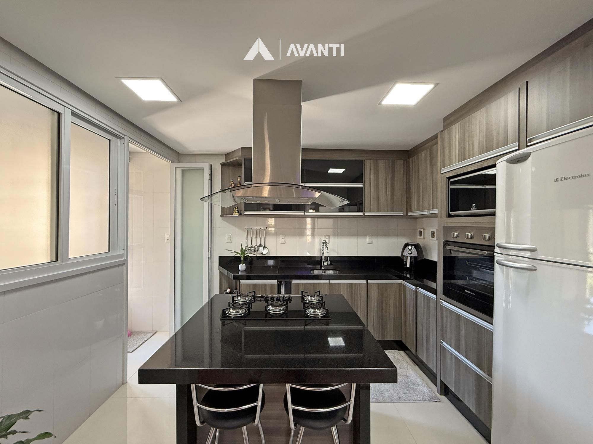 dispõe de hall de entrada, amplo living que comporta sala de estar com lareira, sala de jantar, ampla sacada fechada, cozinha americana com bancada, área de serviço com churrasqueira e banheiro social.