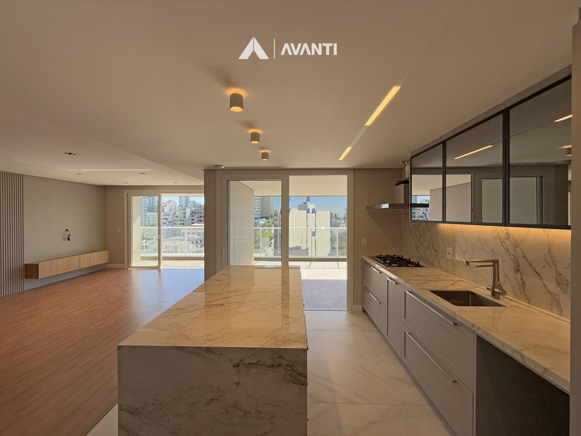 Hall de entrada com lavabo, imponente living integrado, sala de estar e jantar, ampla cozinha com bancada, sacada gourmet com vista, e área de serviço separada com sacada auxiliar.
