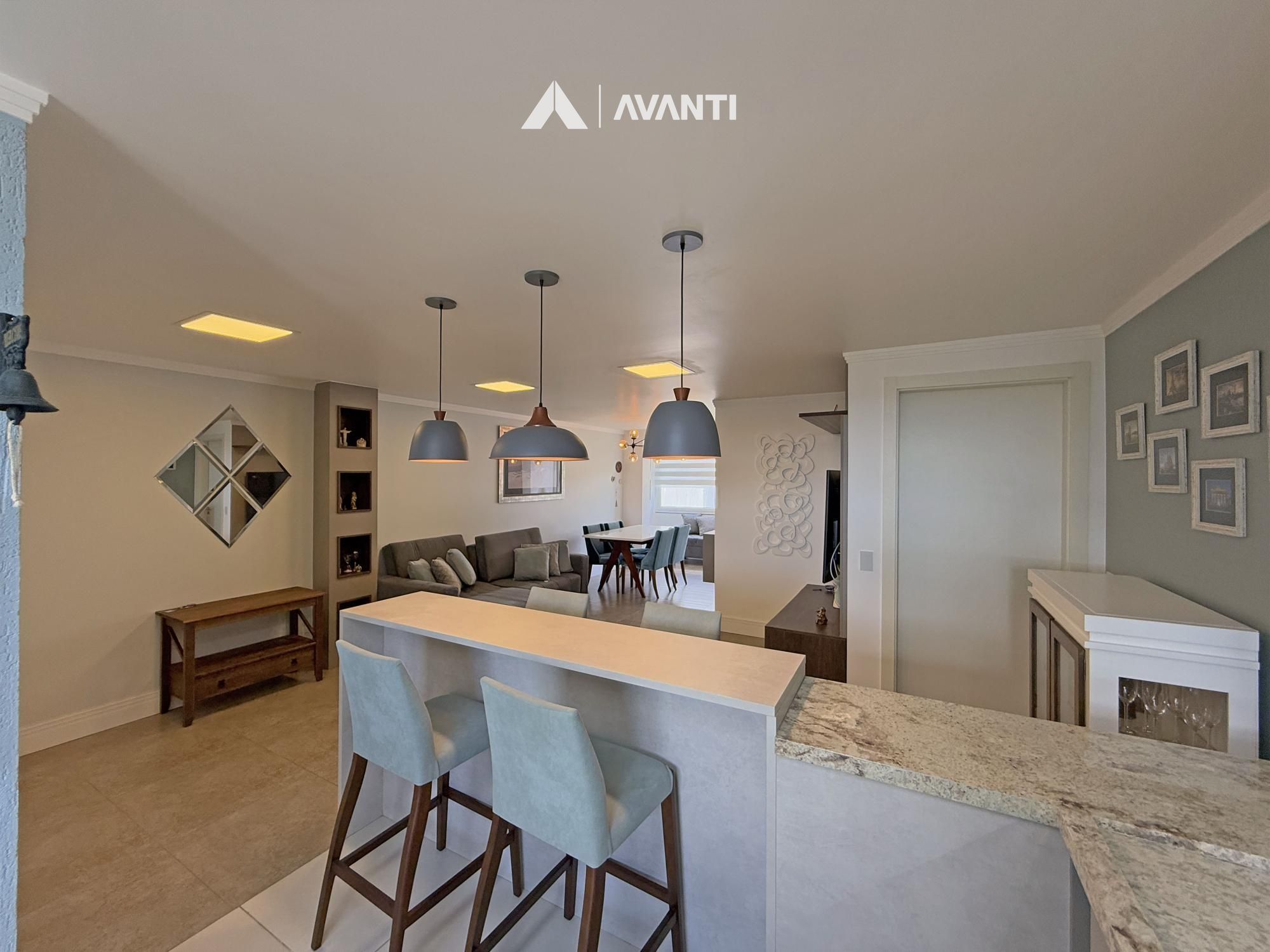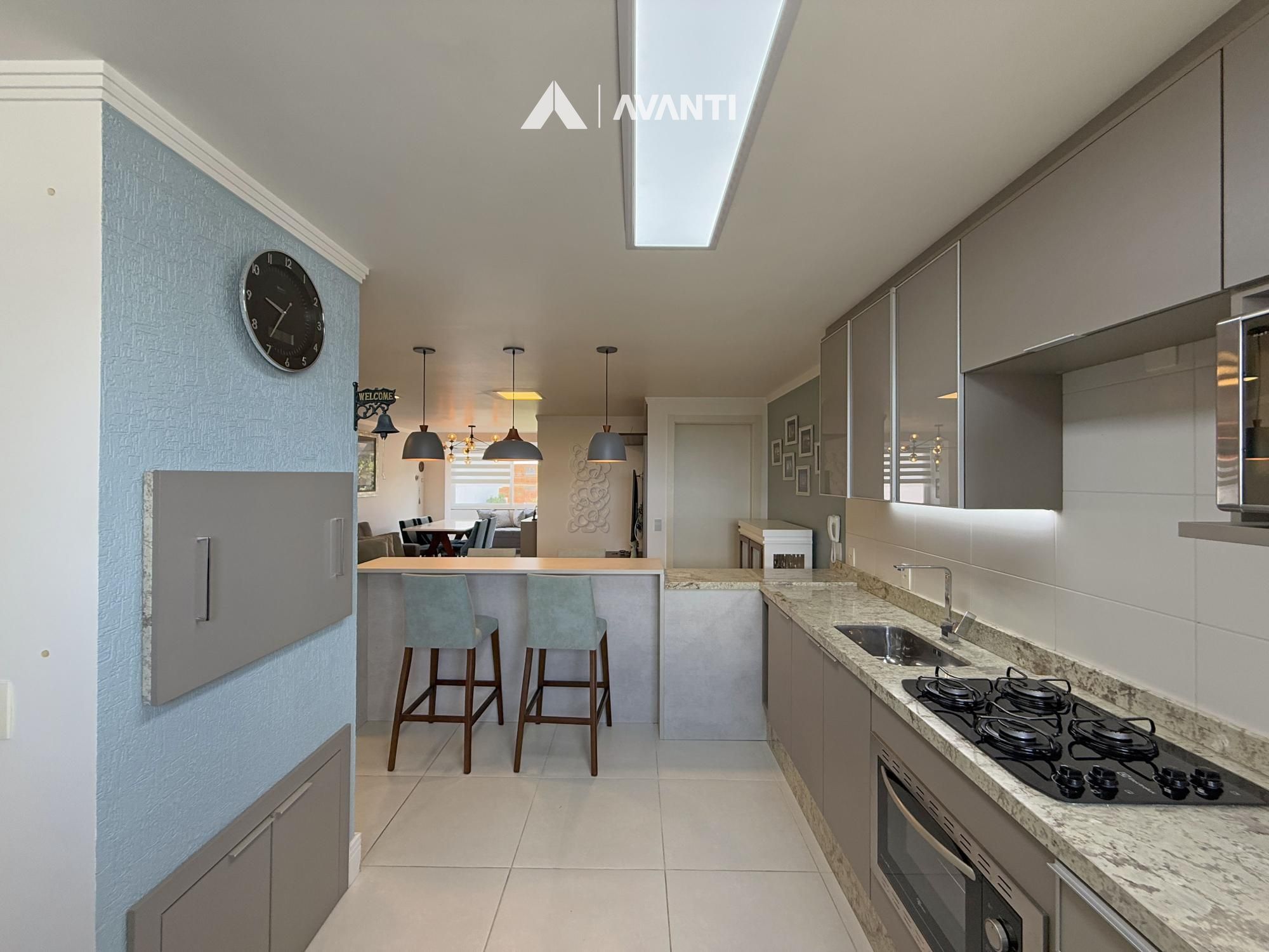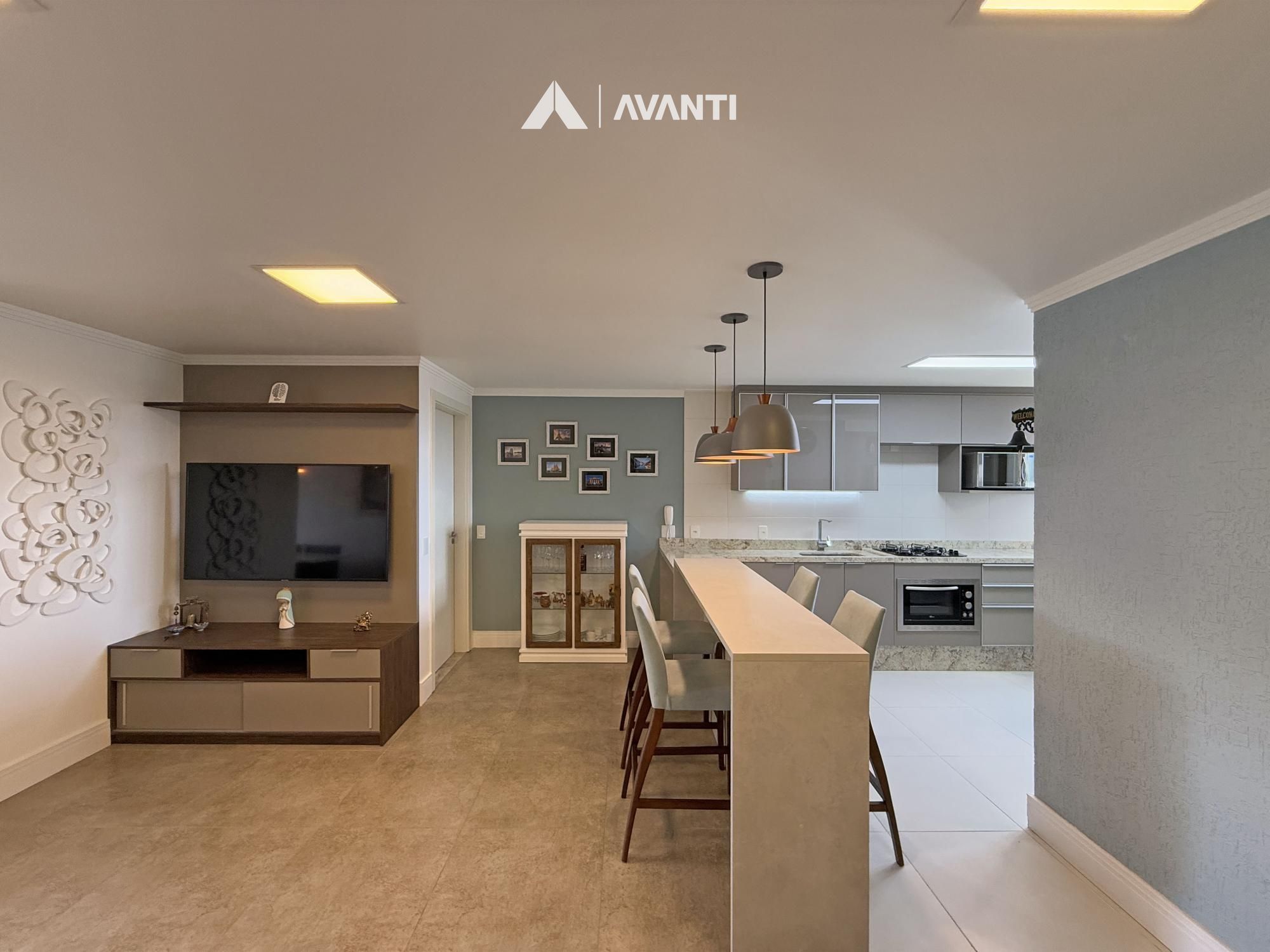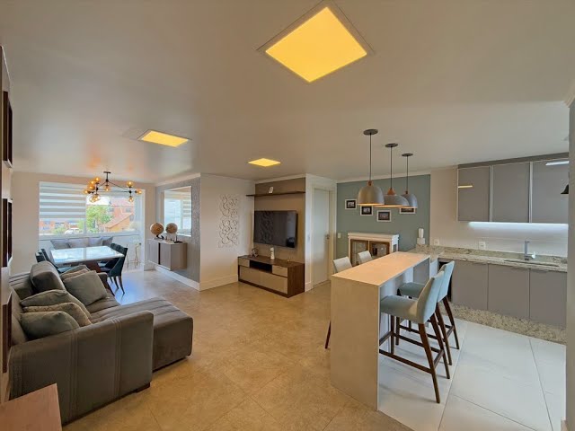 Amplo living em conceito aberto, sala de estar, sala de jantar, sacada nivelada e fechada em esquadrias, ampla cozinha com churrasqueira e bancada, área de serviço e banheiro social.