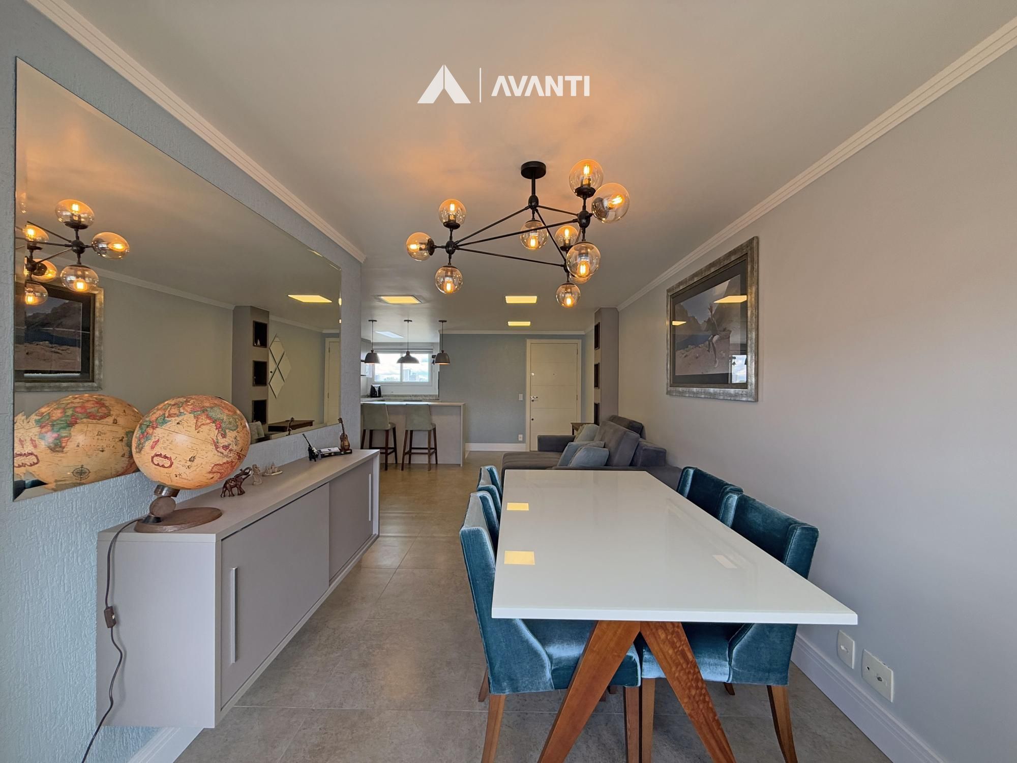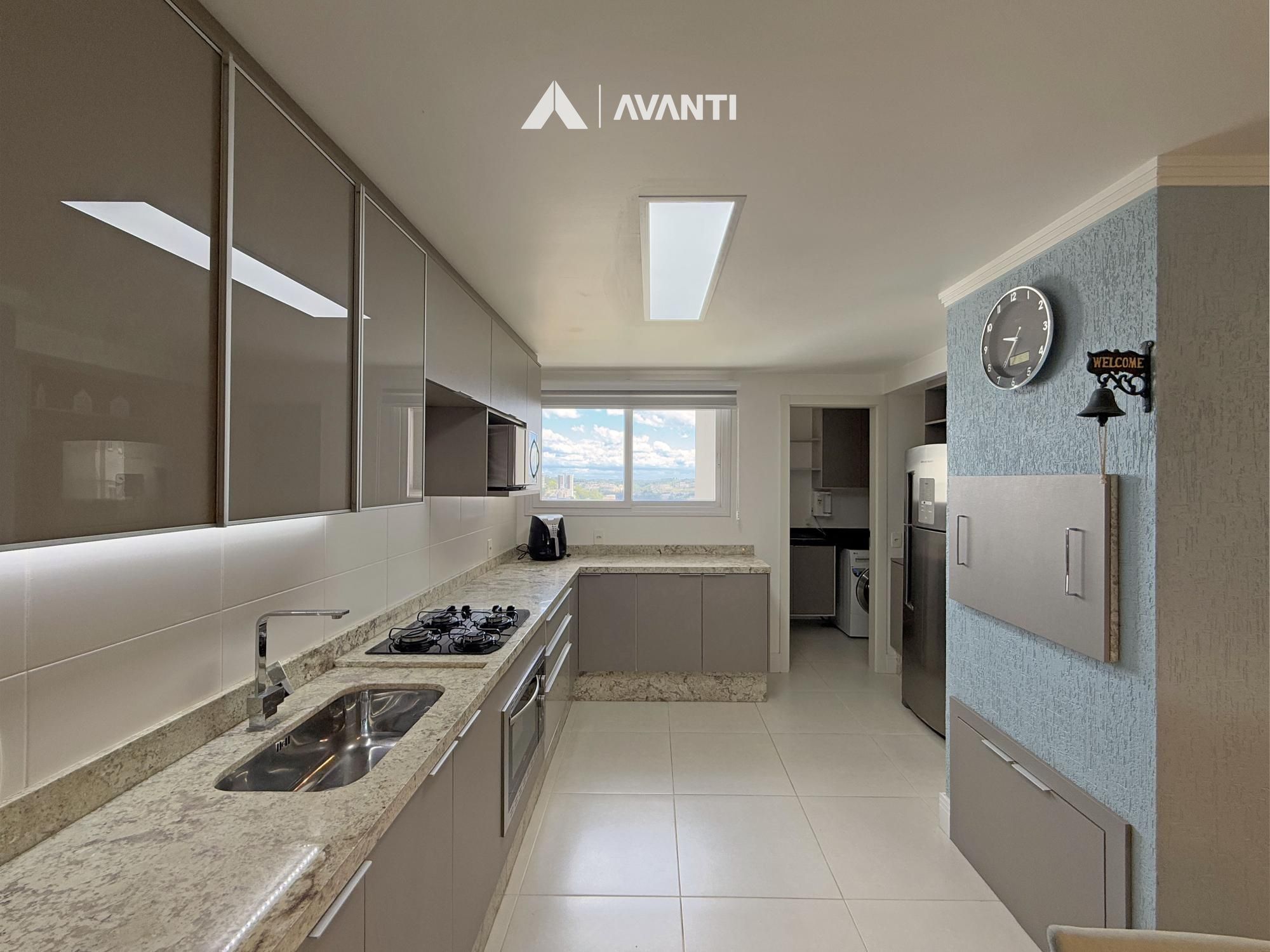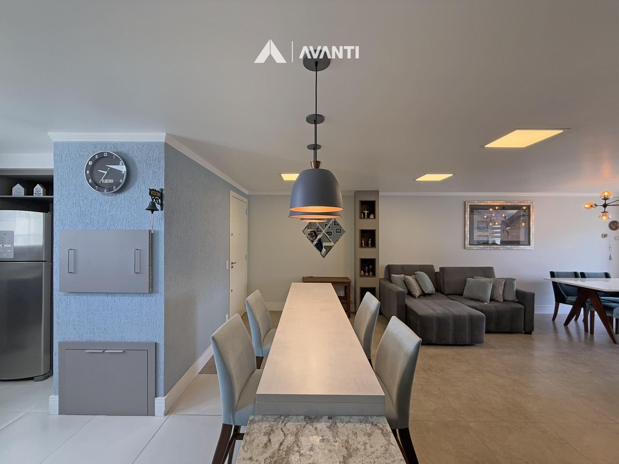 Amplo living em conceito aberto, sala de estar, sala de jantar, sacada nivelada e fechada em esquadrias, ampla cozinha com churrasqueira e bancada, área de serviço e banheiro social.
