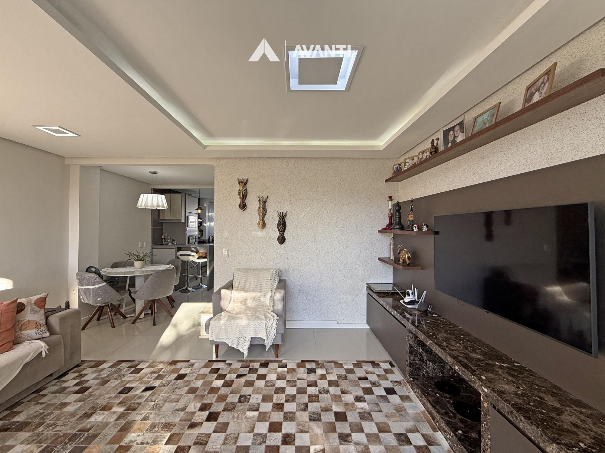 O pavimento social apresenta um living amplo, com espaço para sala de estar e jantar, integrado à sacada, além de cozinha com bancada, área de serviço e lavabo. Uma planta prática, com circulação fluida e boa integração entre os ambientes.
