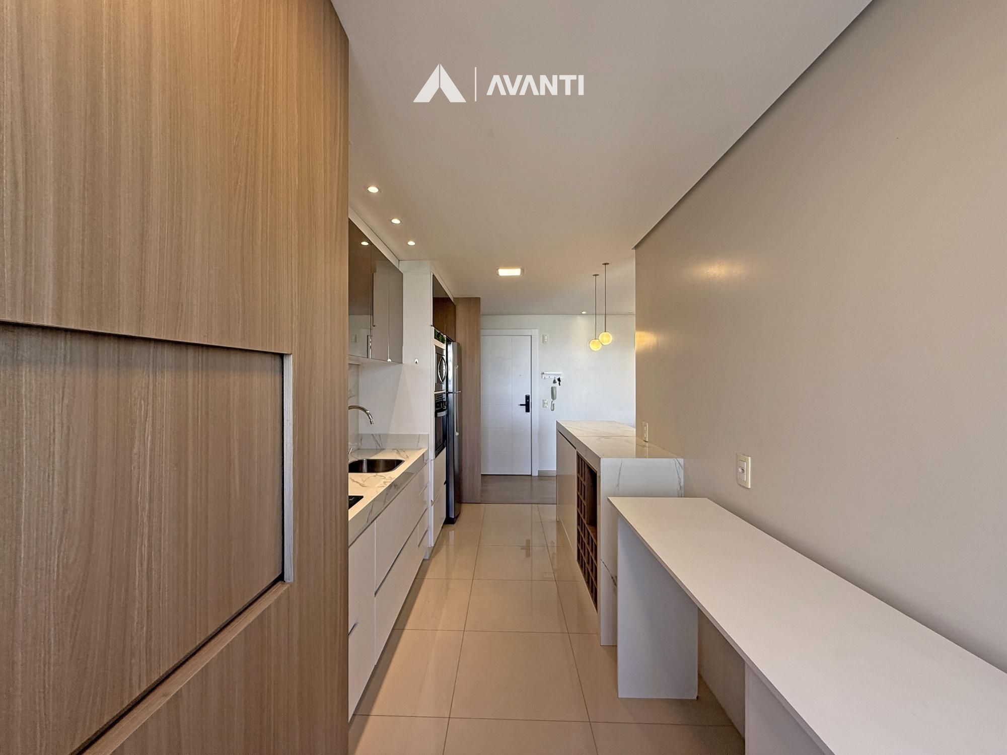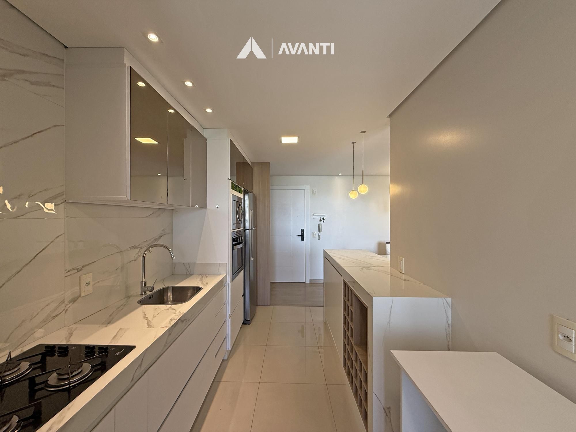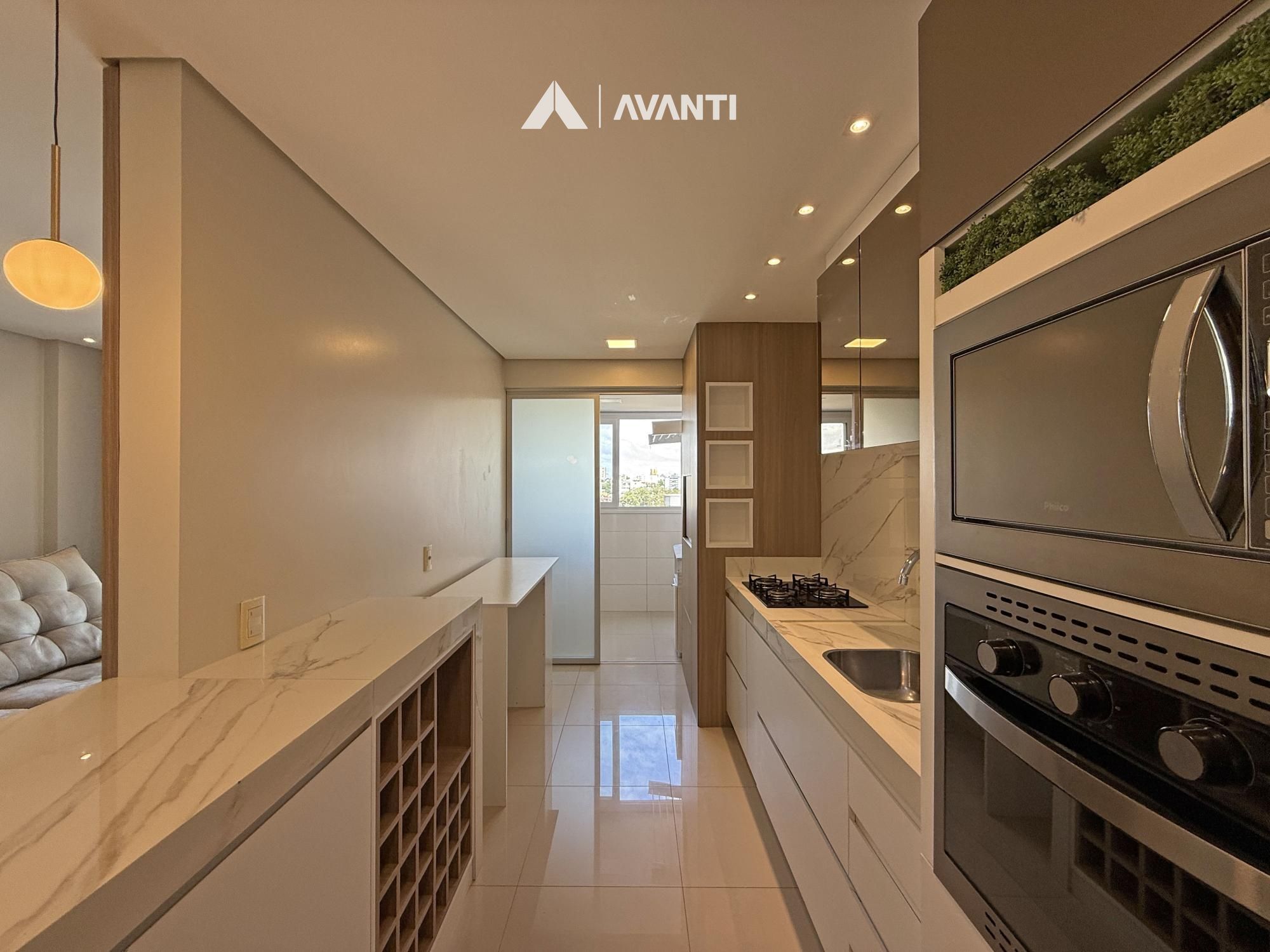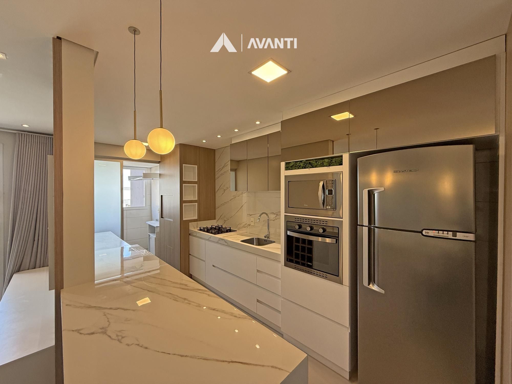 A cozinha com bancada e churrasqueira complementa o espaço, integrada à sacada com fechamento em reiki, ideal para aproveitar o ambiente em todas as estações. O apartamento ainda dispõe de área de serviço e banheiro social, atendendo bem à rotina.
