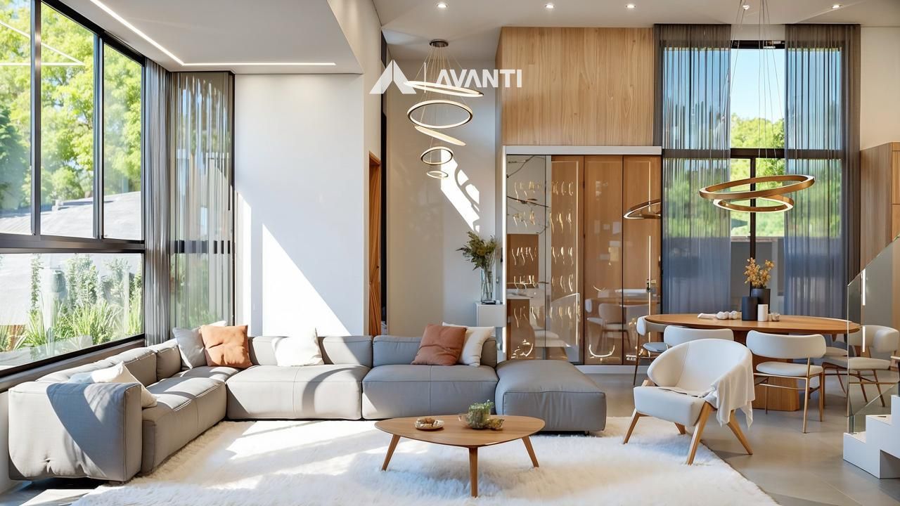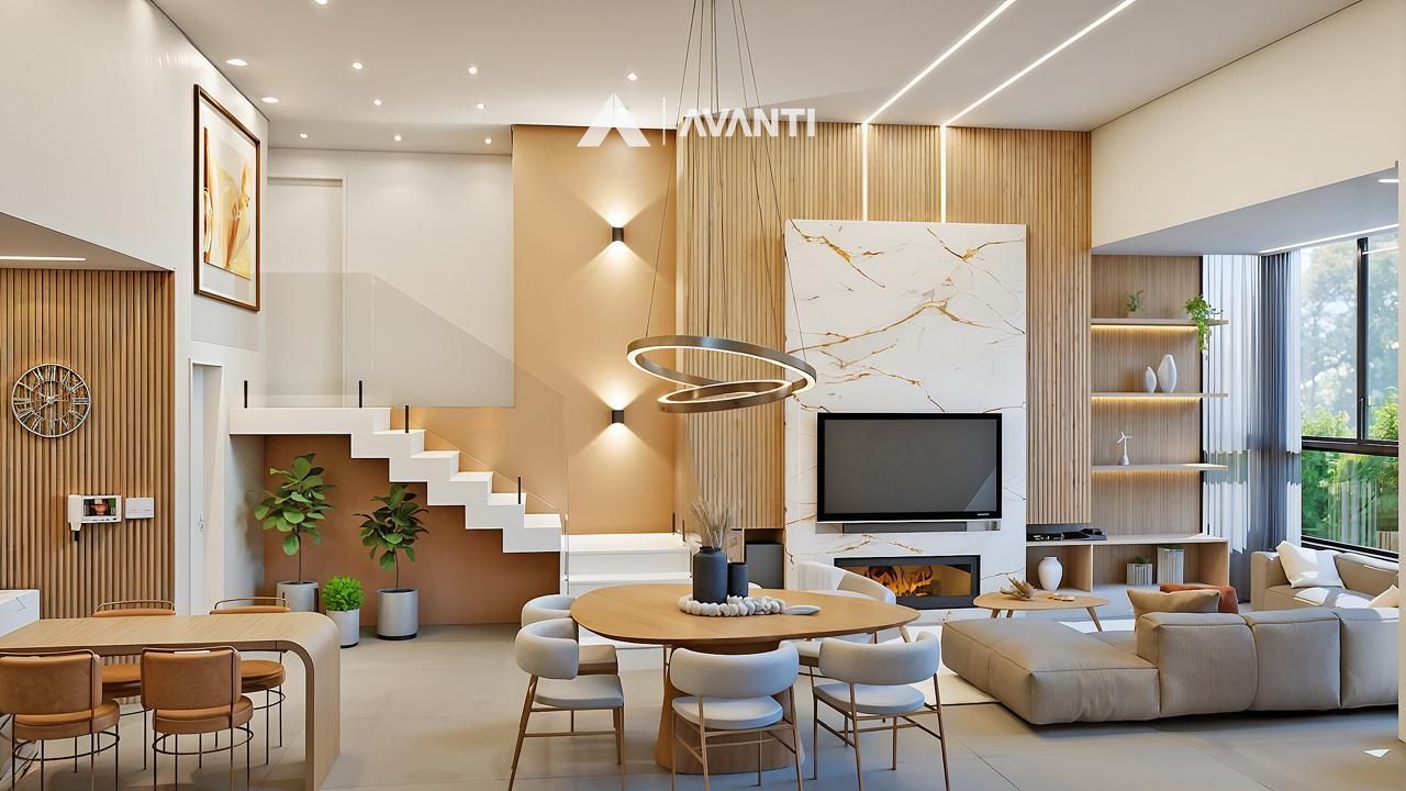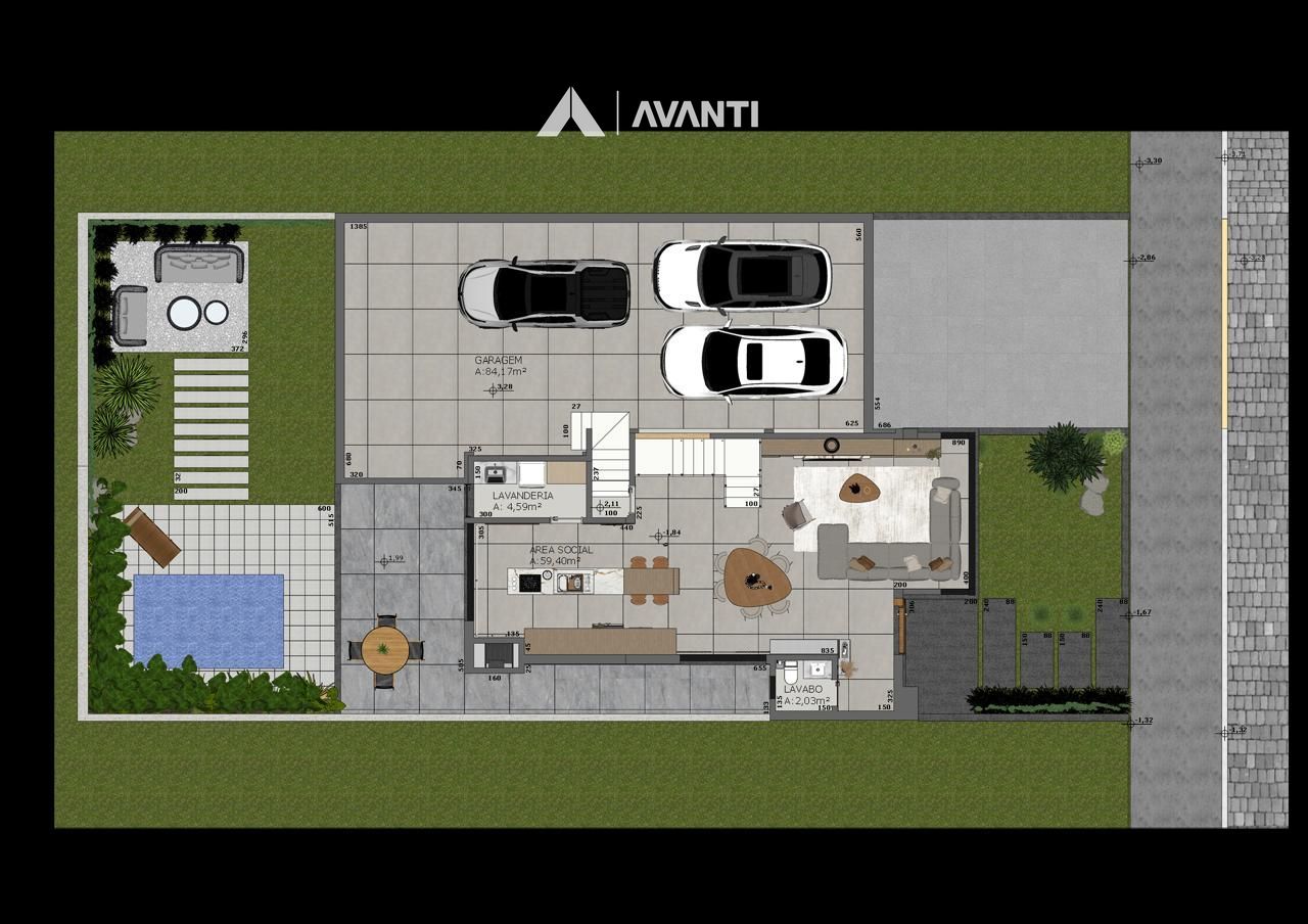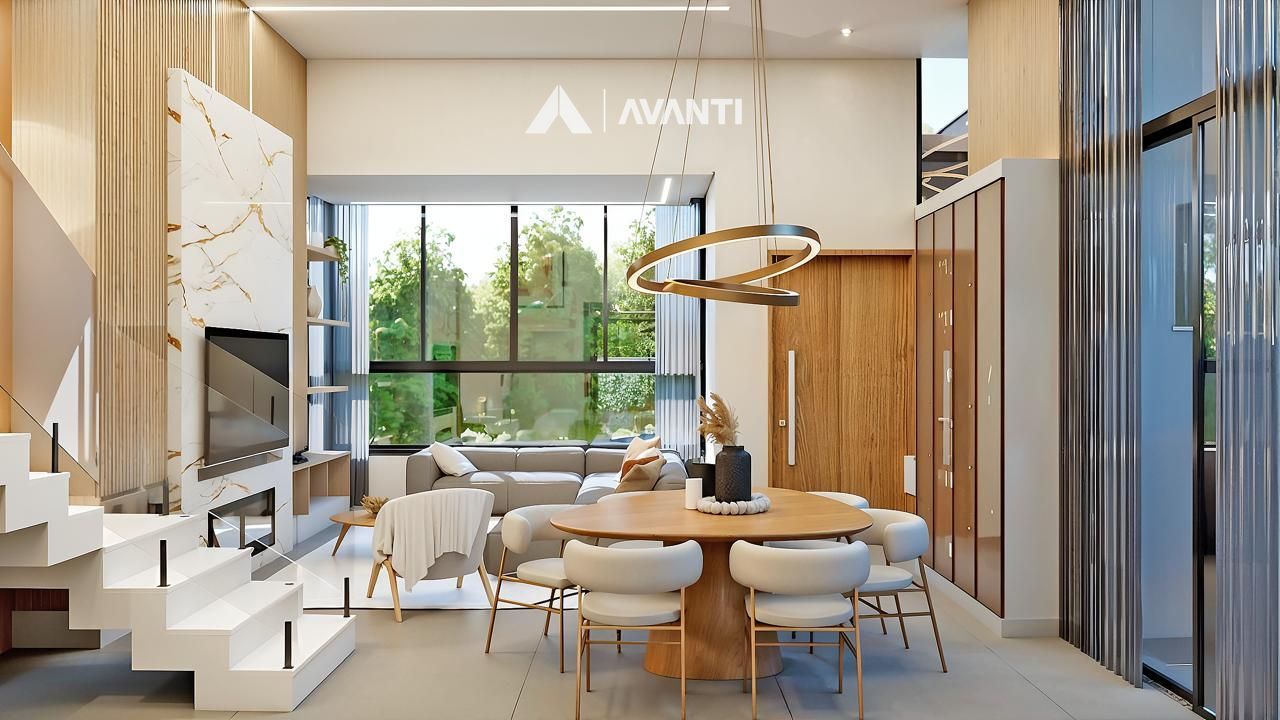 Sala de estar com pé direito duplo, sala de jantar, cozinha americana com churrasqueira, espera para lareira, área de serviço e lavabo.
