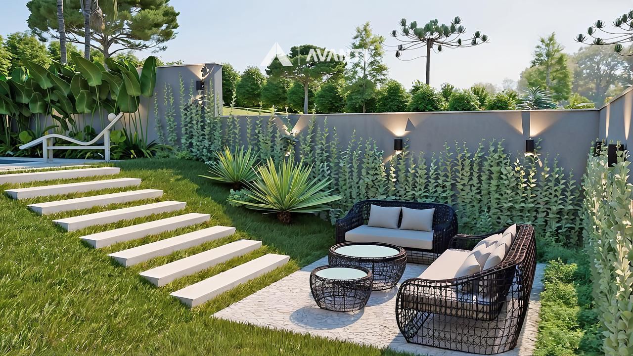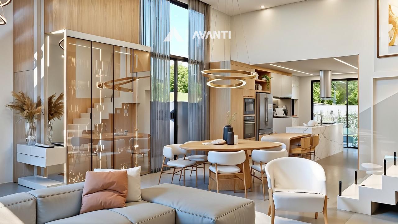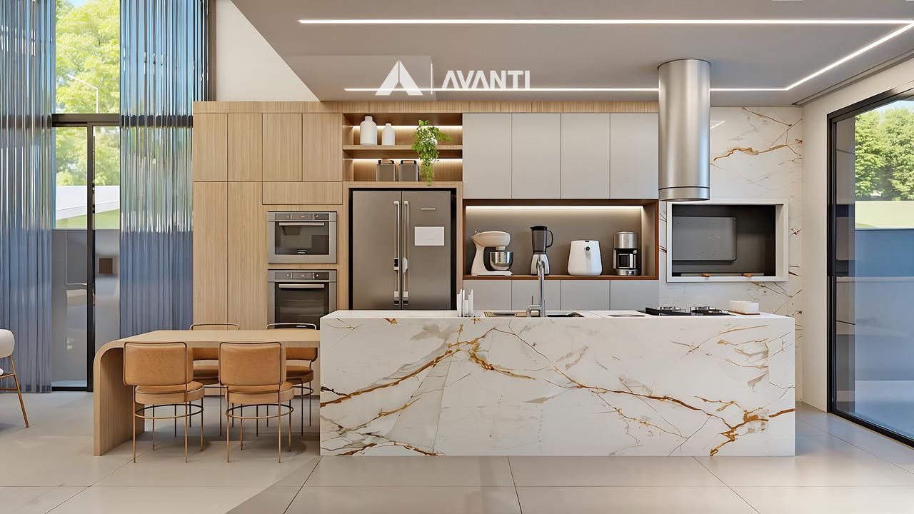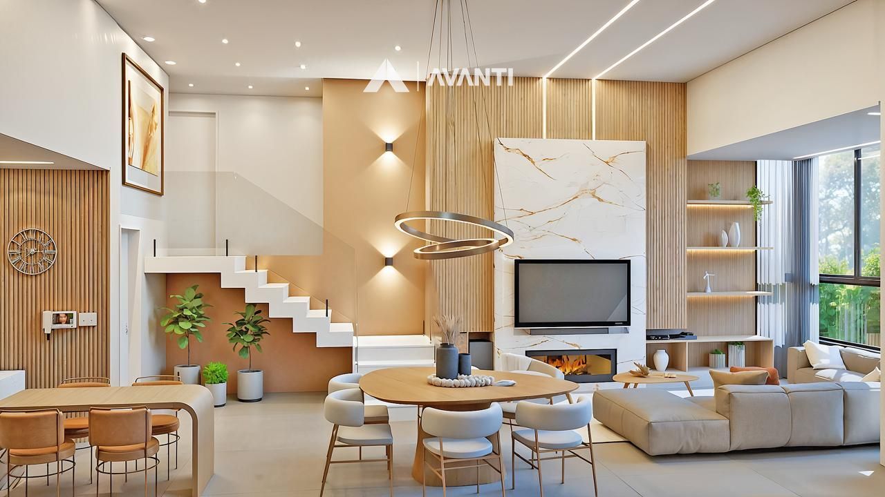 Sala de estar com pé direito duplo, sala de jantar, cozinha americana com churrasqueira, espera para lareira, área de serviço e lavabo.