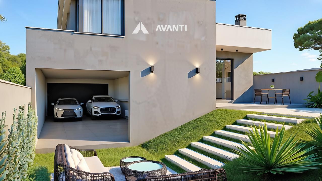 Esquadrias em alumínio preto com vidros duplos, portão eletrônico.