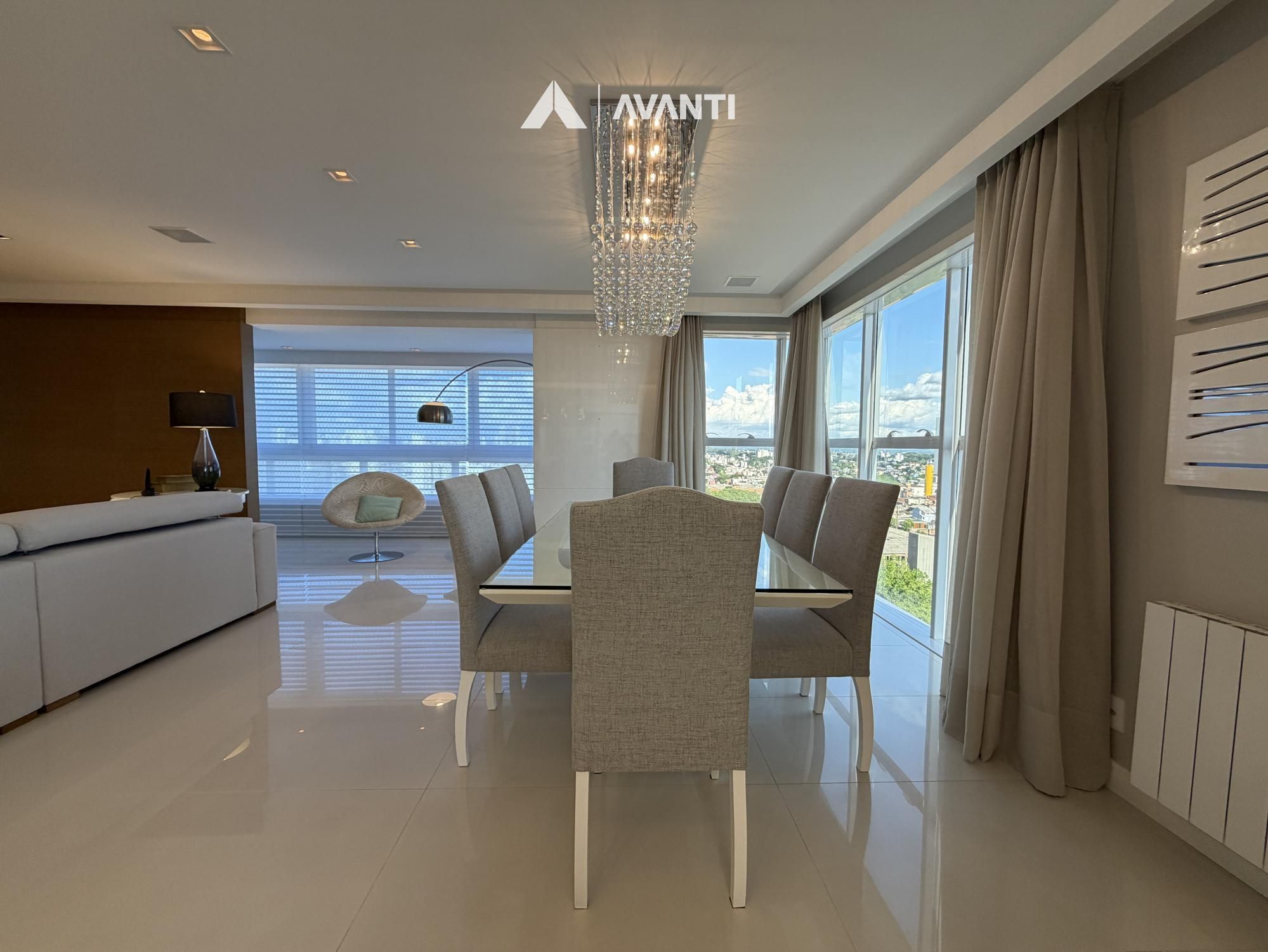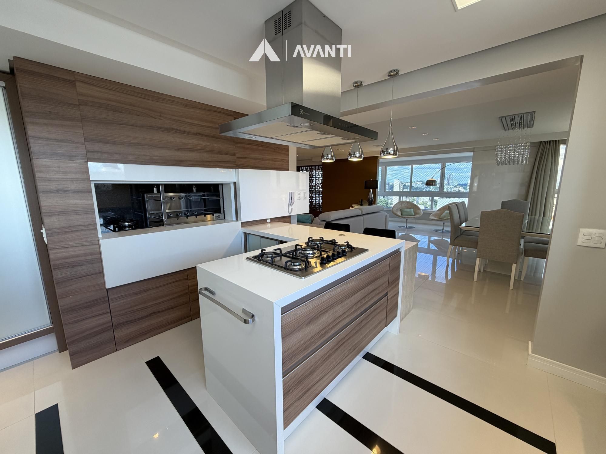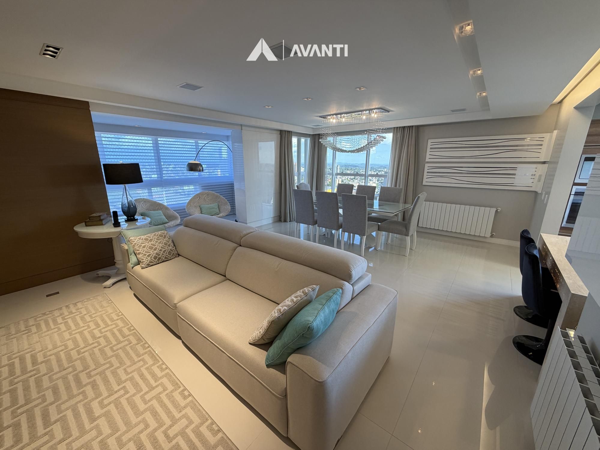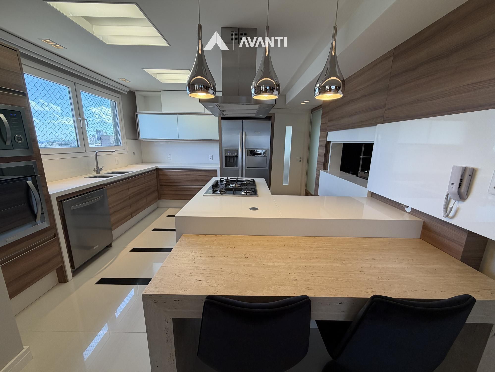 Hall de entrada com elevador privativo, living integrado que comporta sala de estar com lareira, sacada fechada e nivelada, sala de jantar, cozinha gourmet com bancada, lavabo e área de serviço separada.