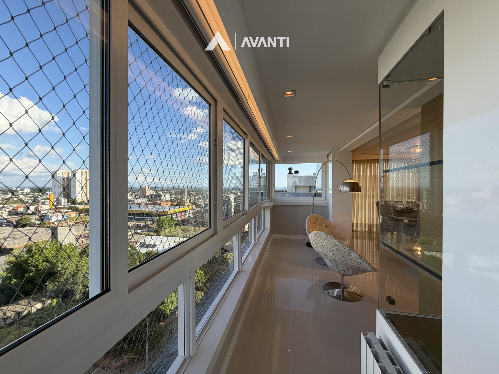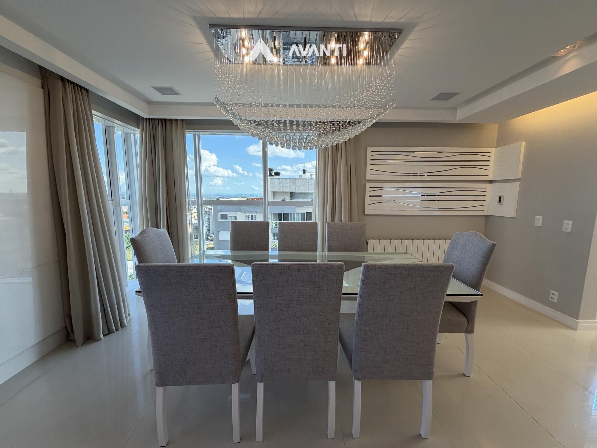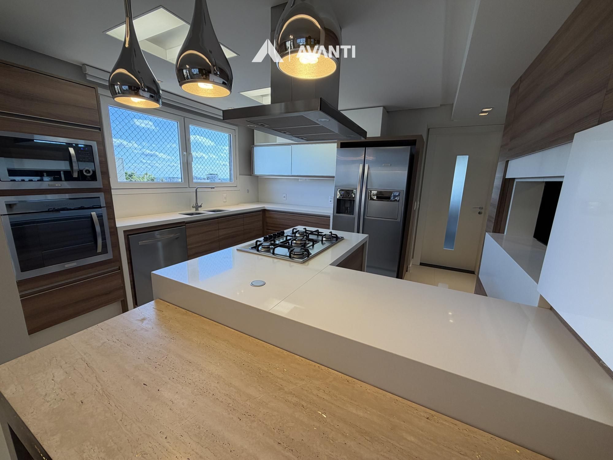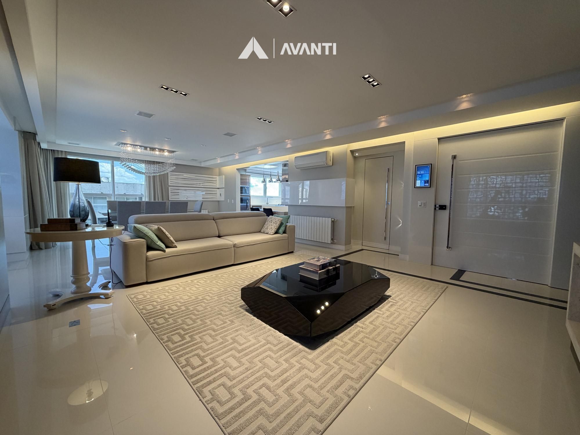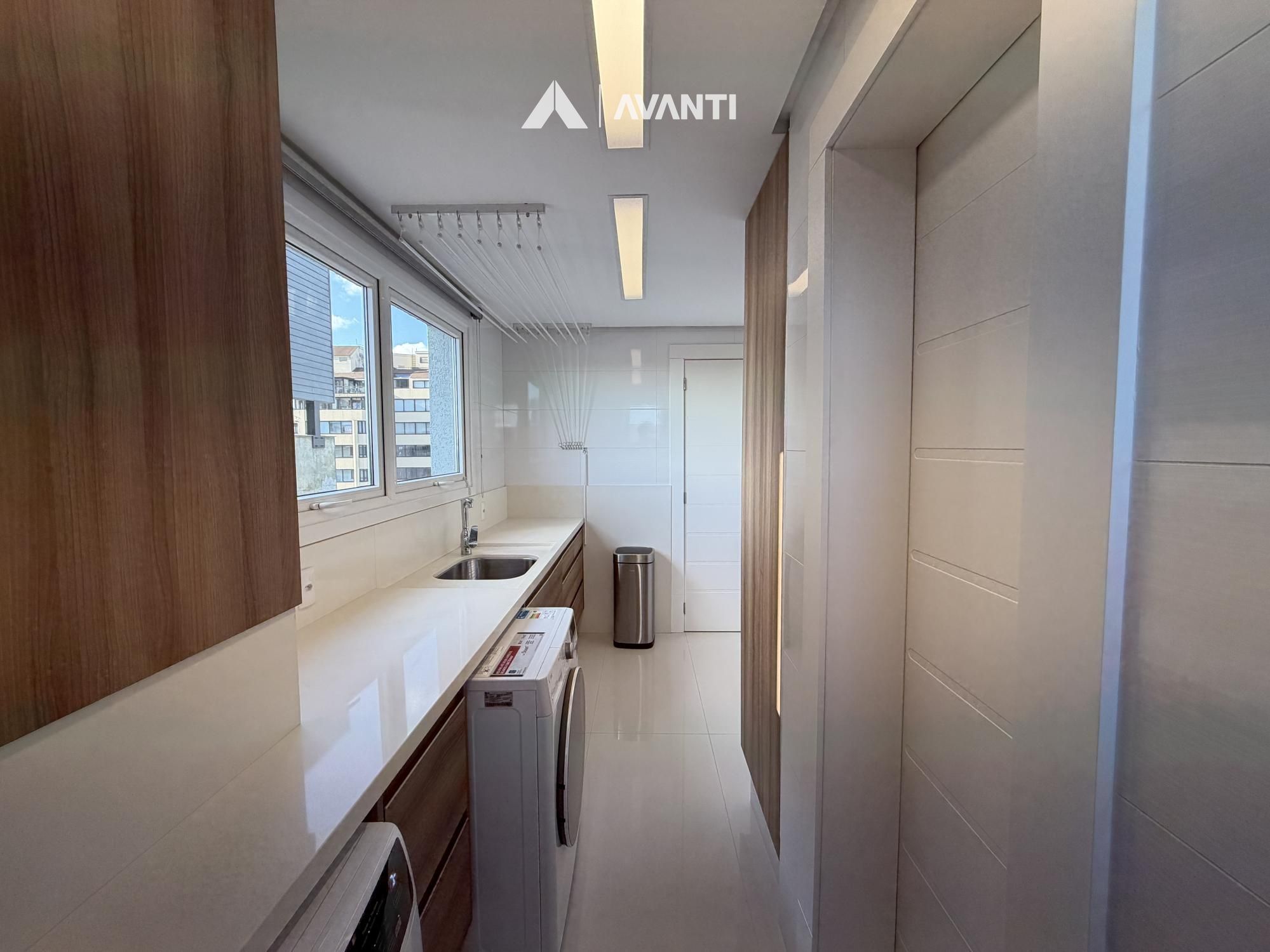 Hall de entrada com elevador privativo, living integrado que comporta sala de estar com lareira, sacada fechada e nivelada, sala de jantar, cozinha gourmet com bancada, lavabo e área de serviço separada.