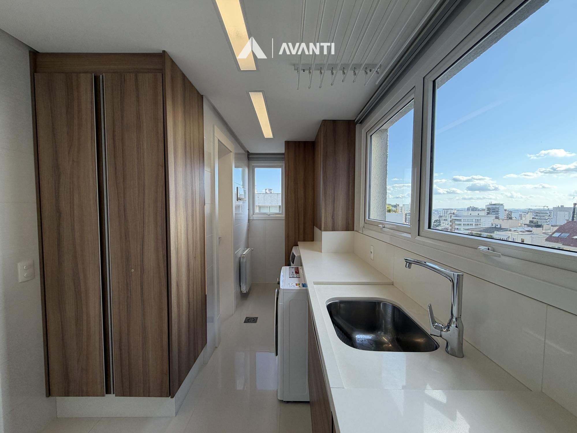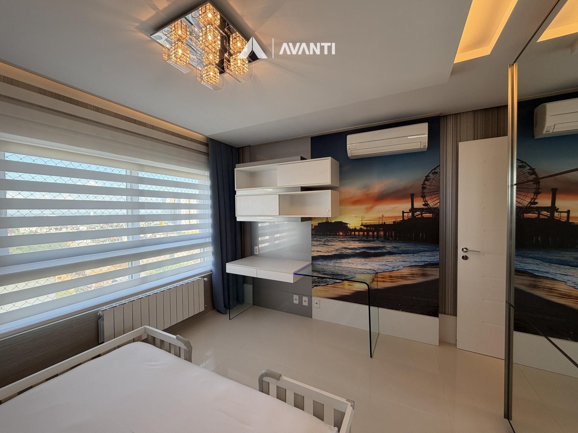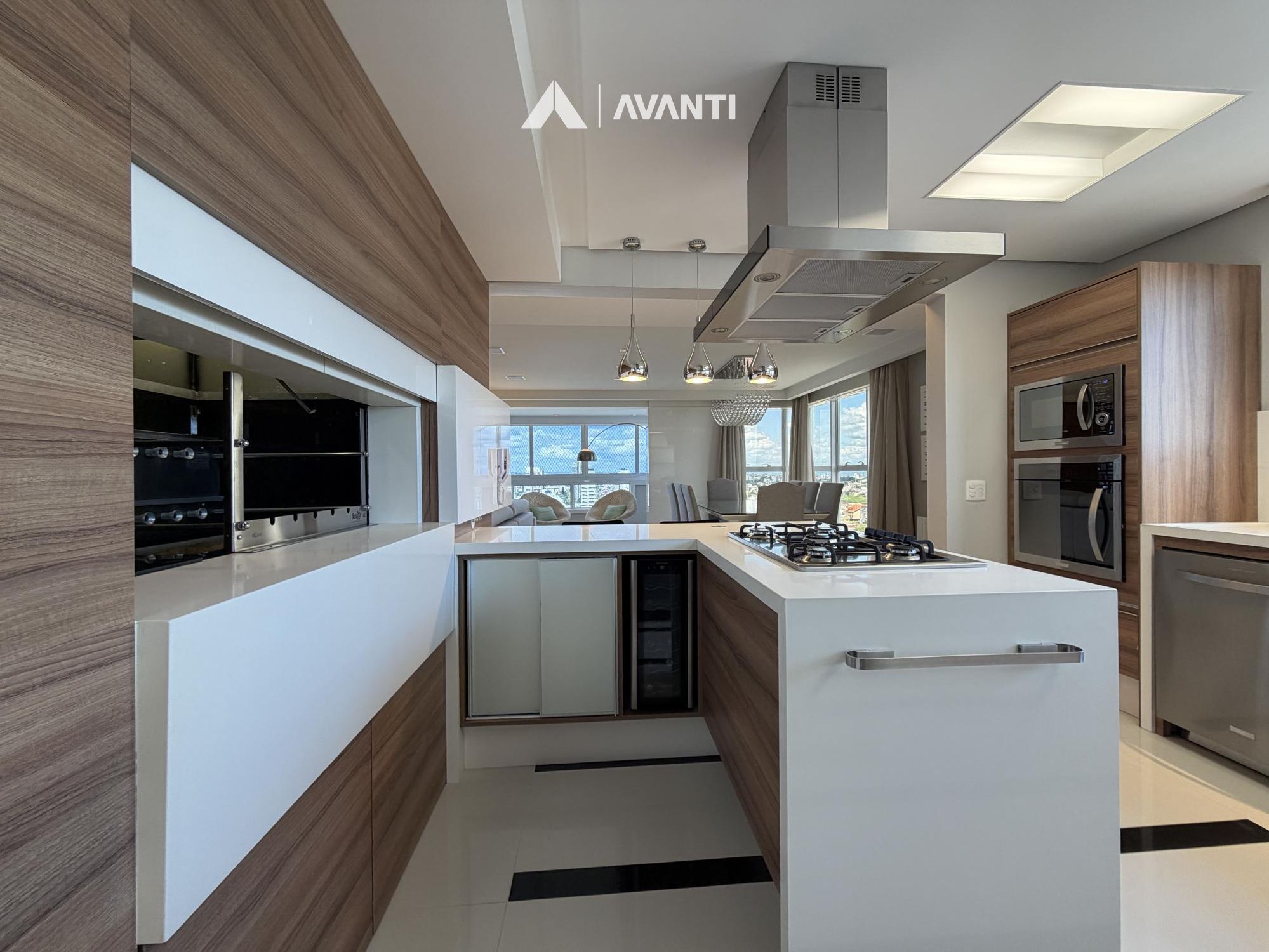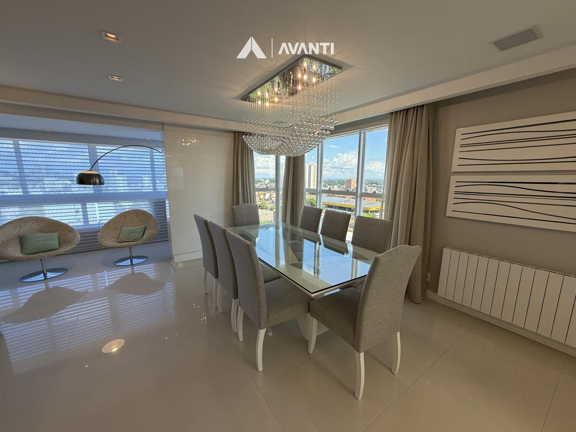 Hall de entrada com elevador privativo, living integrado que comporta sala de estar com lareira, sacada fechada e nivelada, sala de jantar, cozinha gourmet com bancada, lavabo e área de serviço separada.