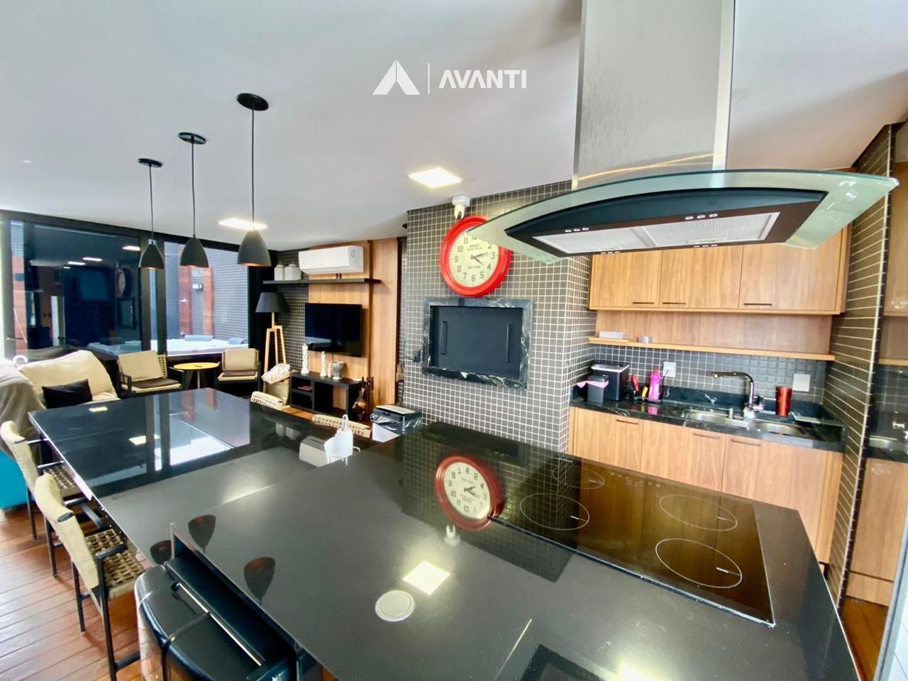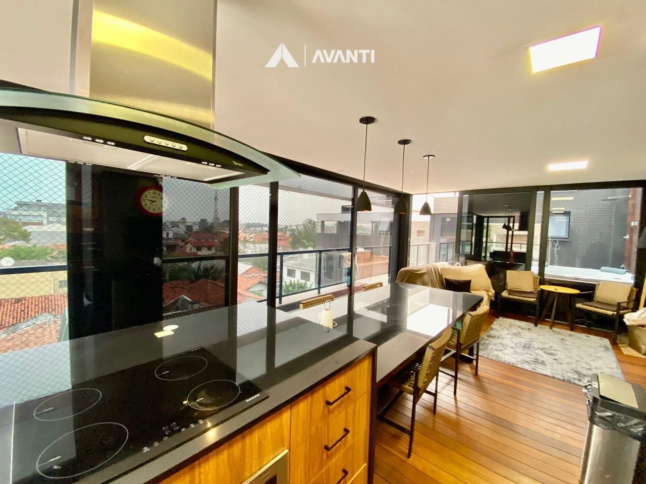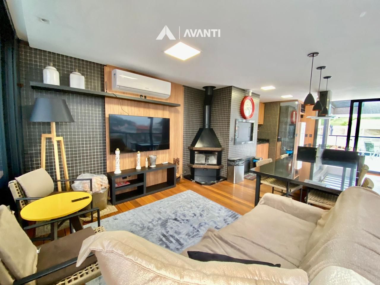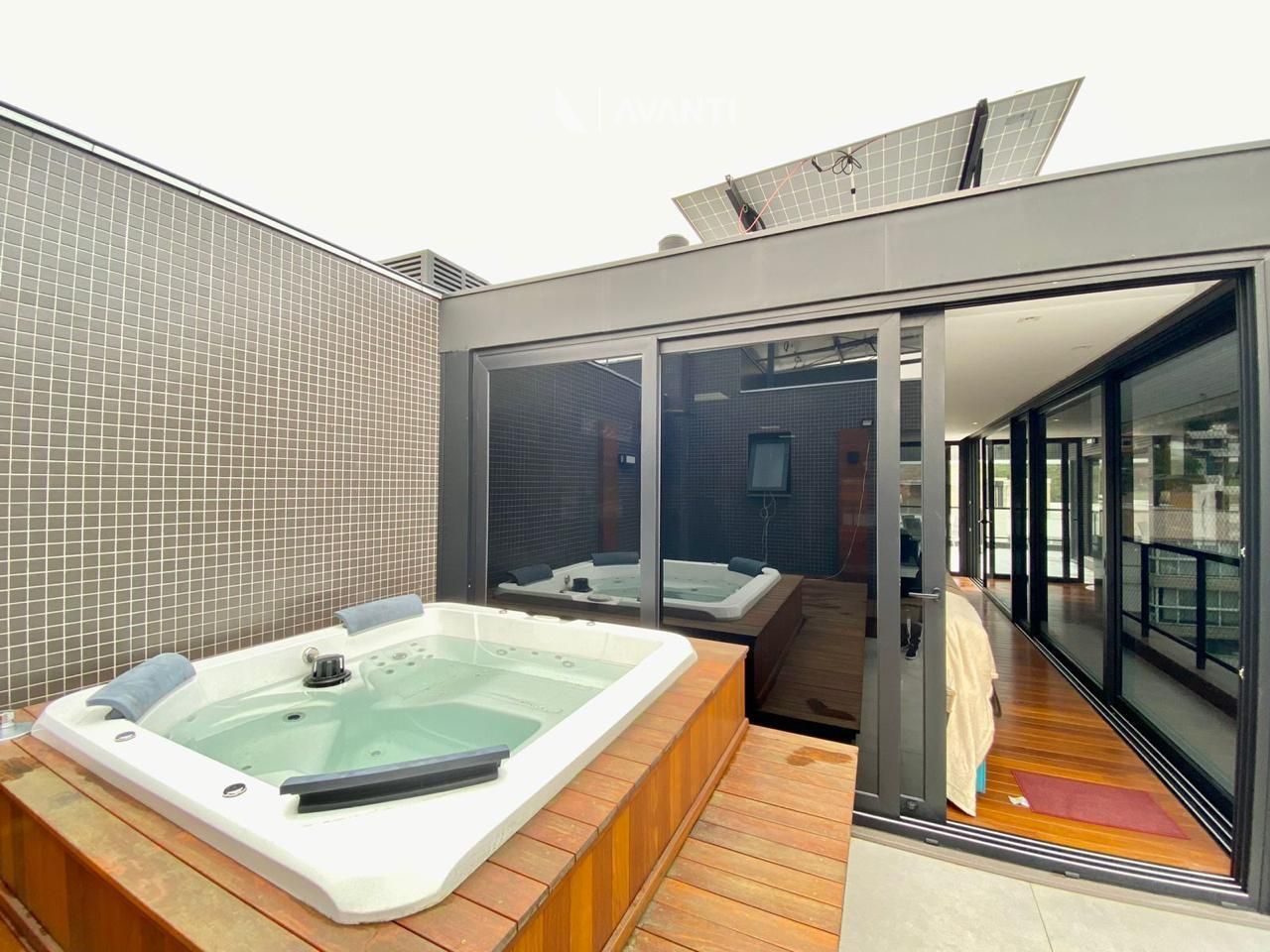 O imóvel apresenta várias características como aquecimento de água, churrasqueira, lareira, split instalado, acabamento em gesso, salas de estar e jantar integradas, sacada, espaço gourmet, banheiro social, banheira de hidromassagem com aquecimento e cromoterapia, esquadrias em PVC Preto, persianas automatizadas nos dormitórios, placas solares, piso em porcelanato, vista panorâmica e vaga dupla de garagem.