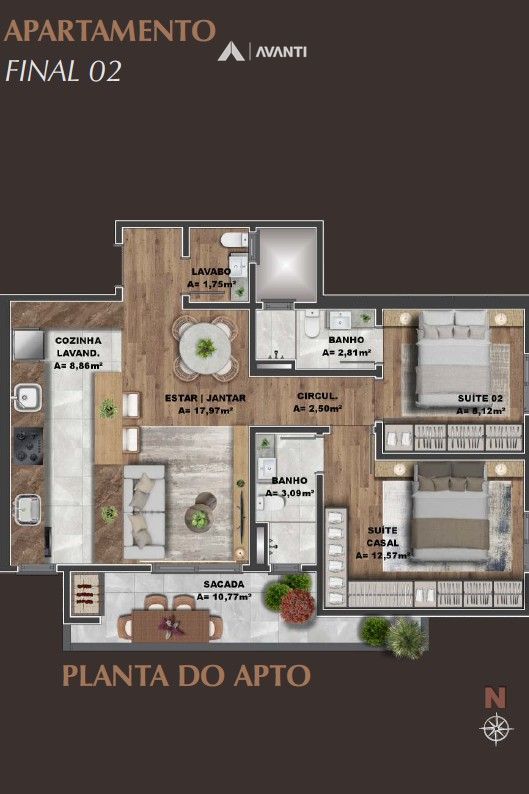 Com 63m² privativos, conta com 2 dormitórios e vaga para 01 carro.