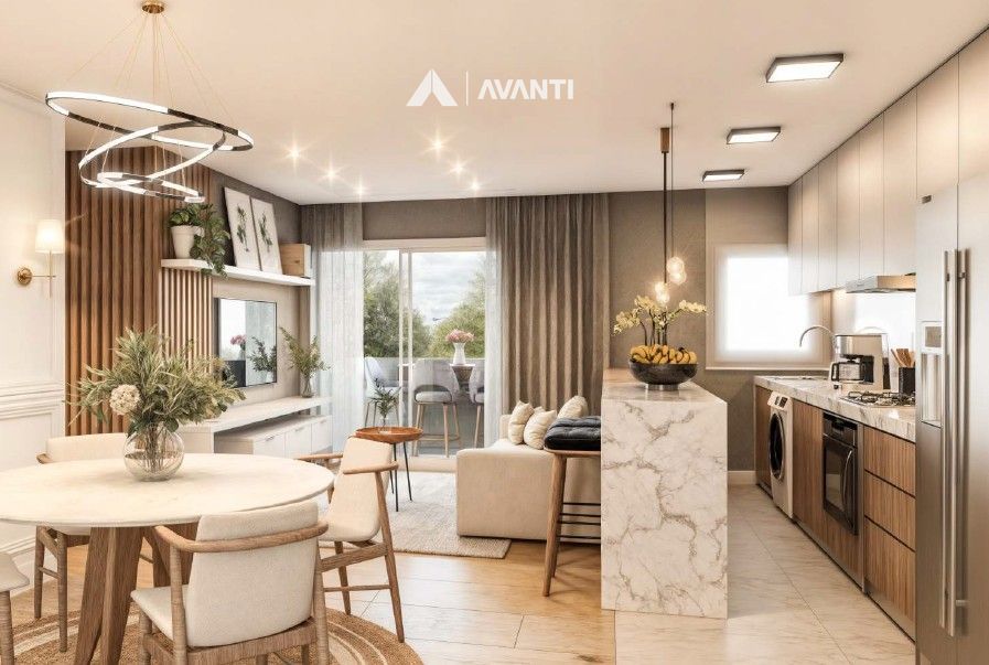 Living integrado, estar, jantar, cozinha e lavabo, banheiro social e sacada com churrasqueira.