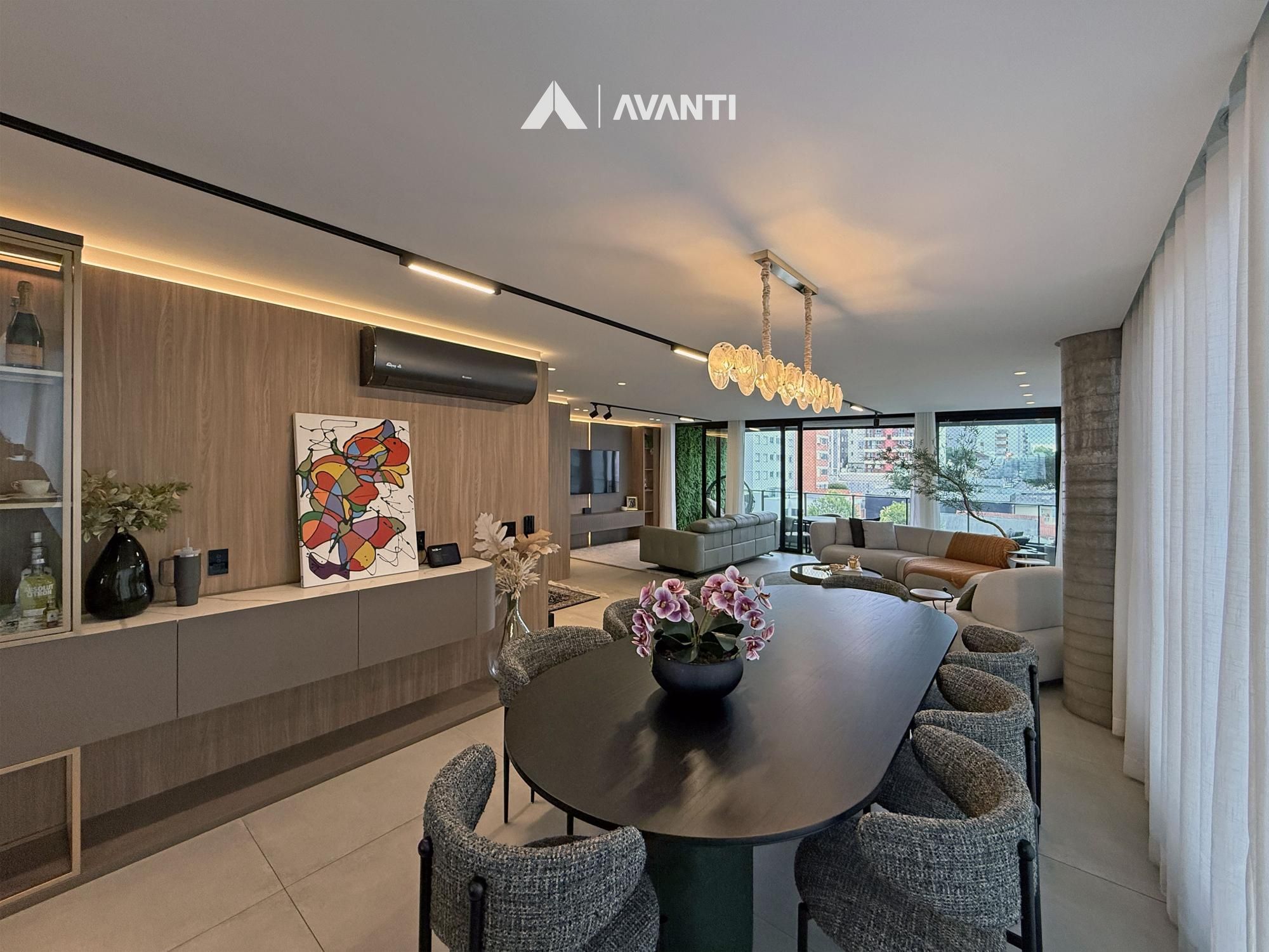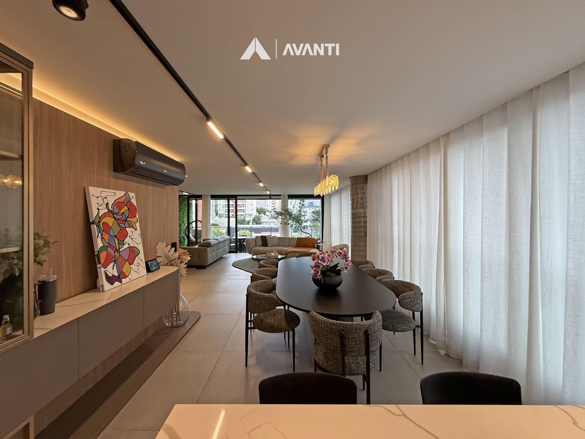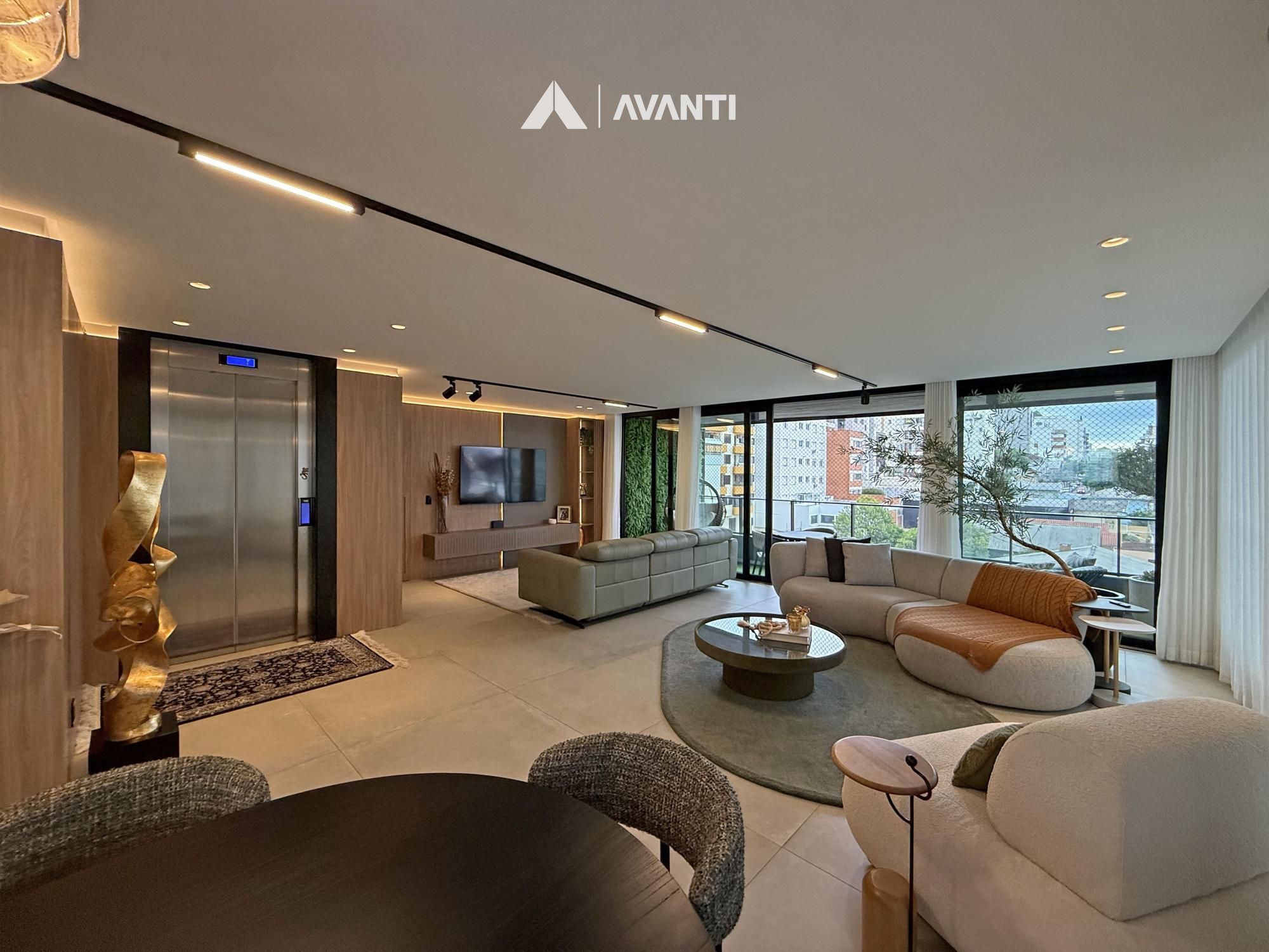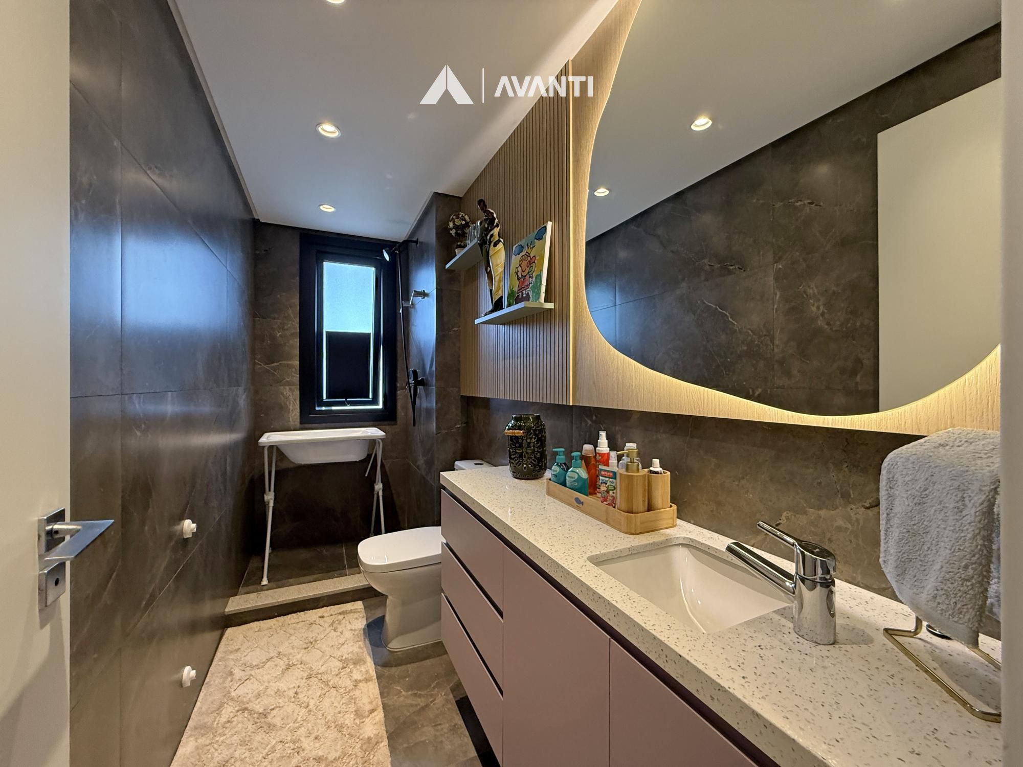 Com 198m² privativos, o imóvel apresenta elevador privativo, hall de entrada com lavabo e um living imponente em conceito aberto, integrando sala de estar em dois ambientes, ampla sacada, sala de jantar e uma cozinha gourmet espaçosa com bancada. A área de serviço é separada, conta com elevador de serviço e banheiro auxiliar, garantindo praticidade no dia a dia.