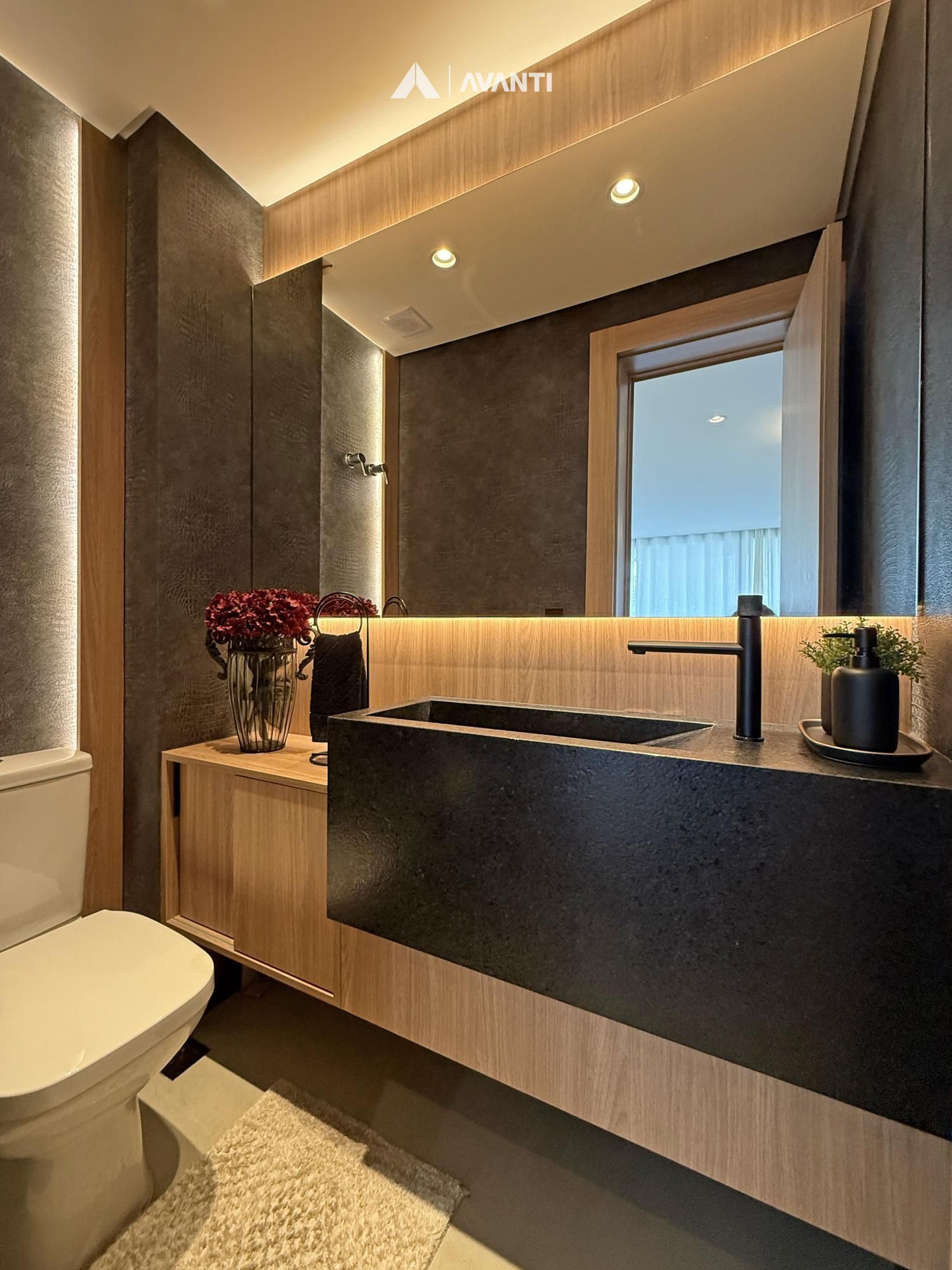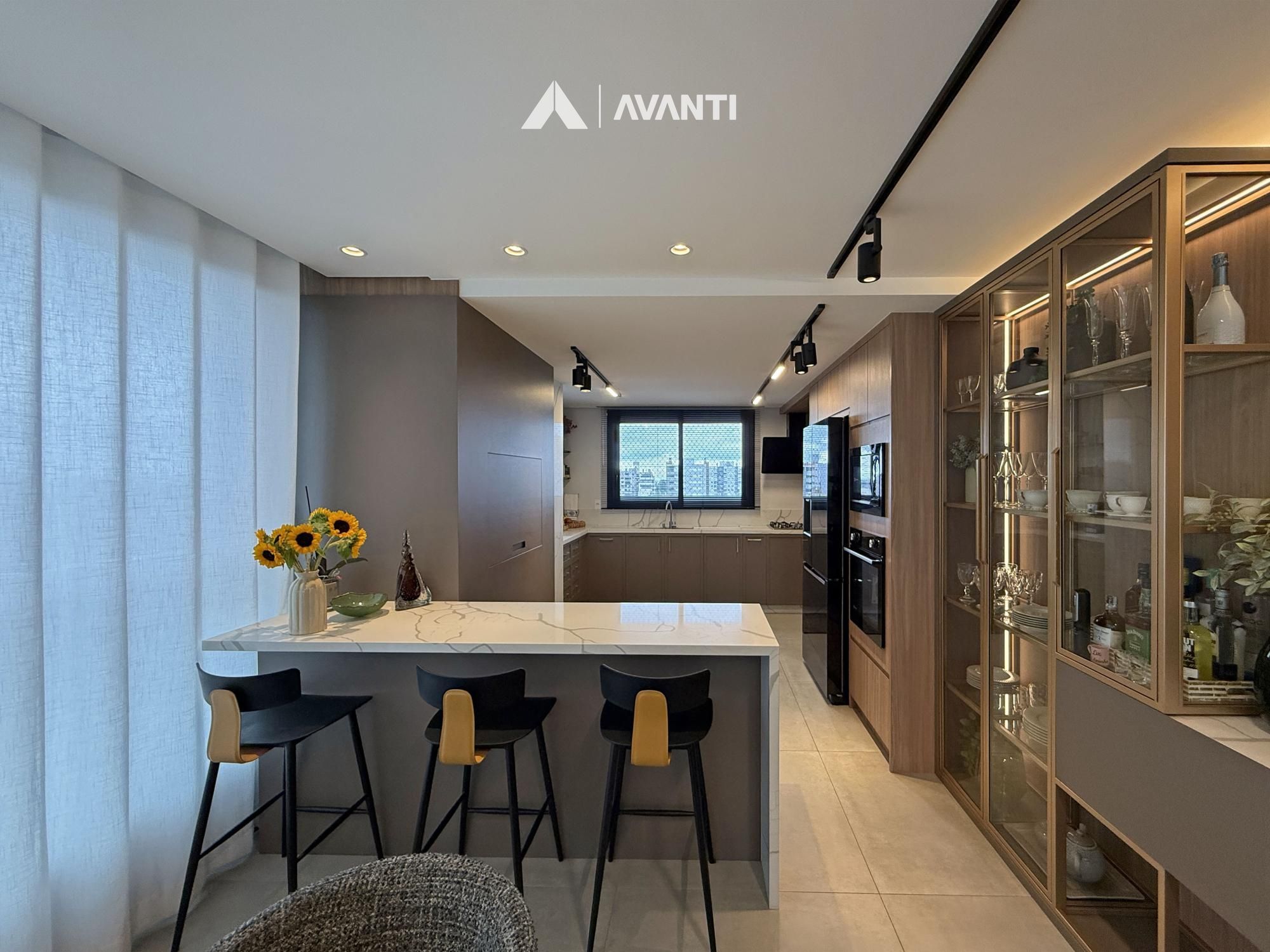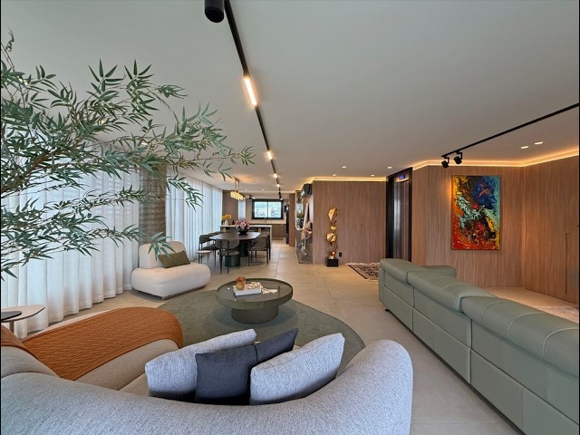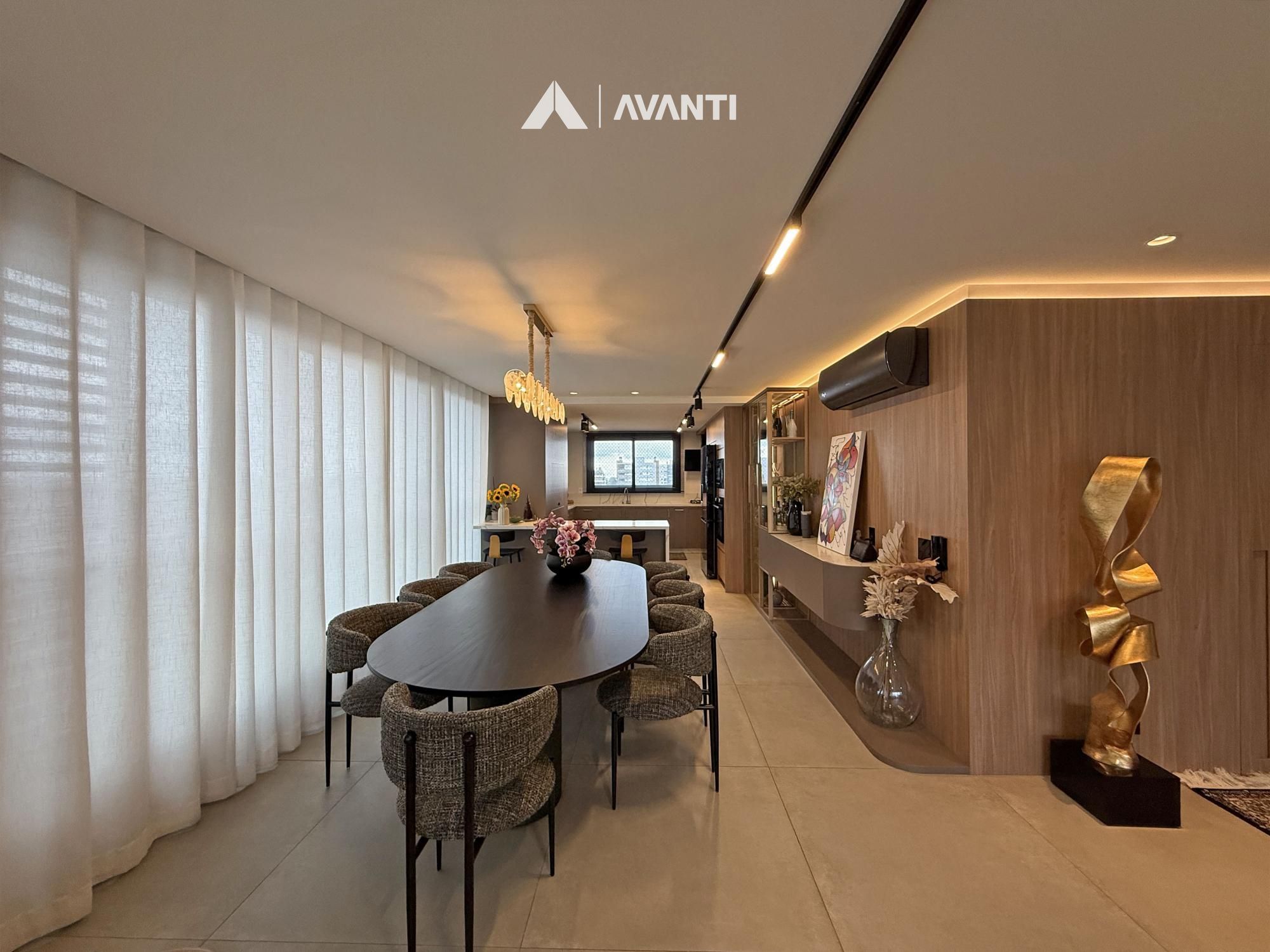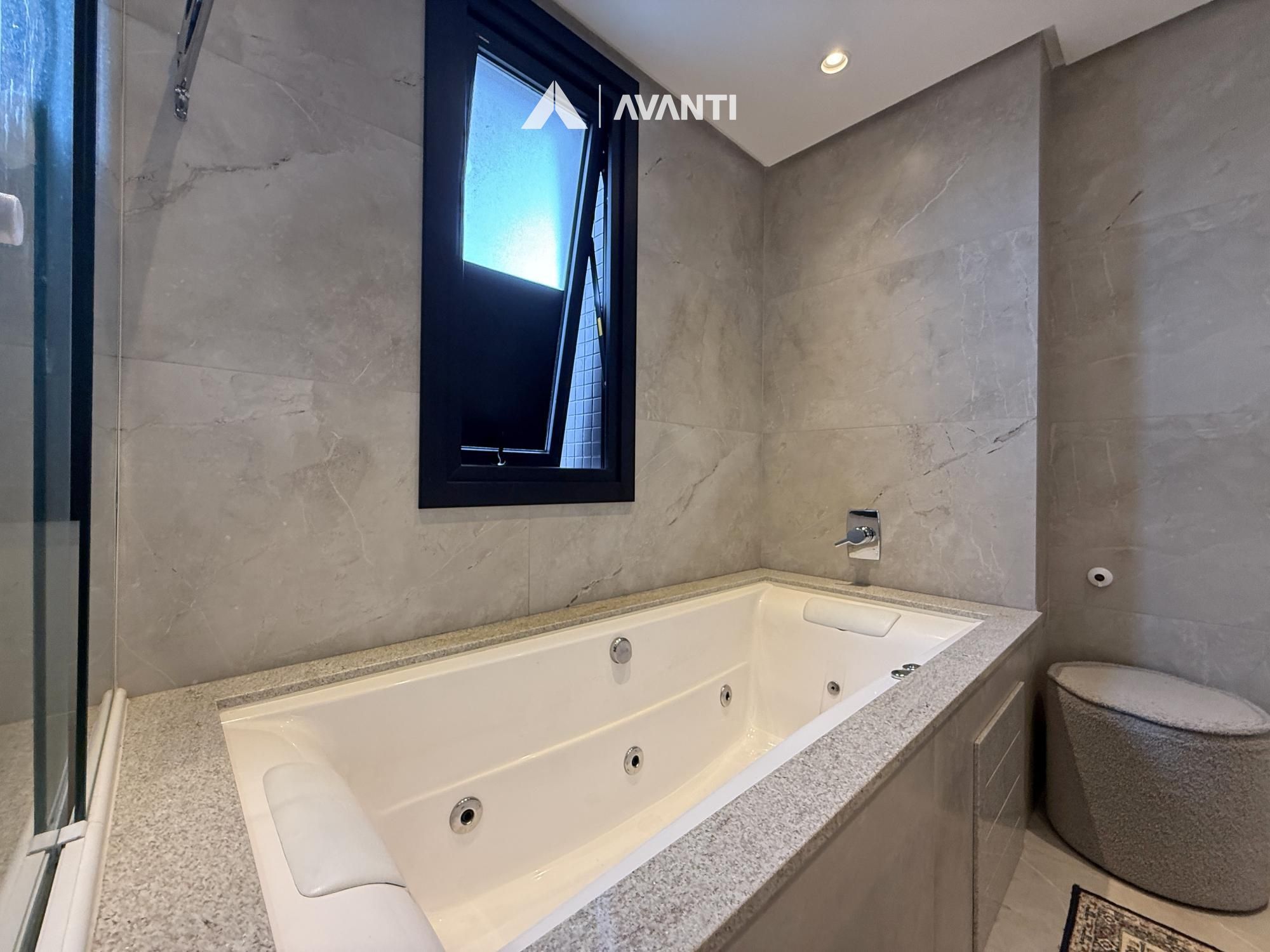 Com 198m² privativos, o imóvel apresenta elevador privativo, hall de entrada com lavabo e um living imponente em conceito aberto, integrando sala de estar em dois ambientes, ampla sacada, sala de jantar e uma cozinha gourmet espaçosa com bancada. A área de serviço é separada, conta com elevador de serviço e banheiro auxiliar, garantindo praticidade no dia a dia.