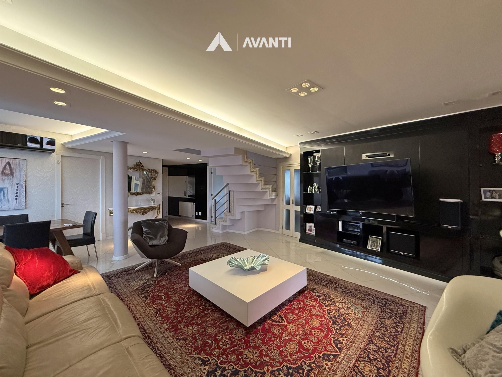 Com 296 m² privativos, o imóvel apresenta uma planta funcional e muito bem distribuída. No primeiro pavimento, o hall de entrada com lavabo conduz a um living em conceito aberto que integra sala de estar, sala de jantar e escritório privativo, criando um ambiente amplo e versátil. A sacada gourmet com churrasqueira possui fechamento em sistema reiki e se conecta ao terraço aberto, ampliando ainda mais as possibilidades de convivência.