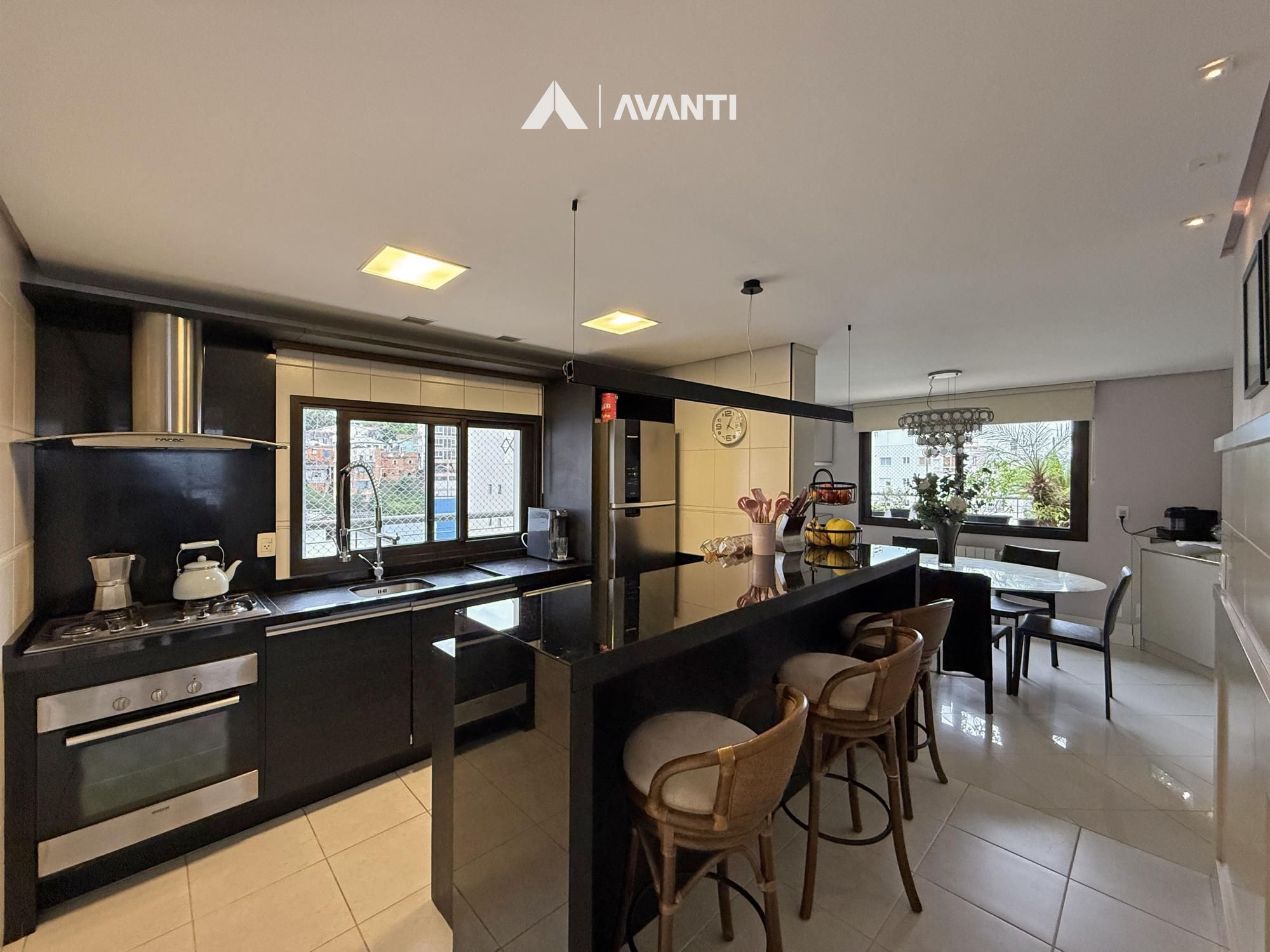 A cozinha em formato copa proporciona praticidade para a rotina, acompanhada por uma segunda sala de jantar que valoriza momentos em família. A área de serviço é separada e conta com espera para banheiro auxiliar.