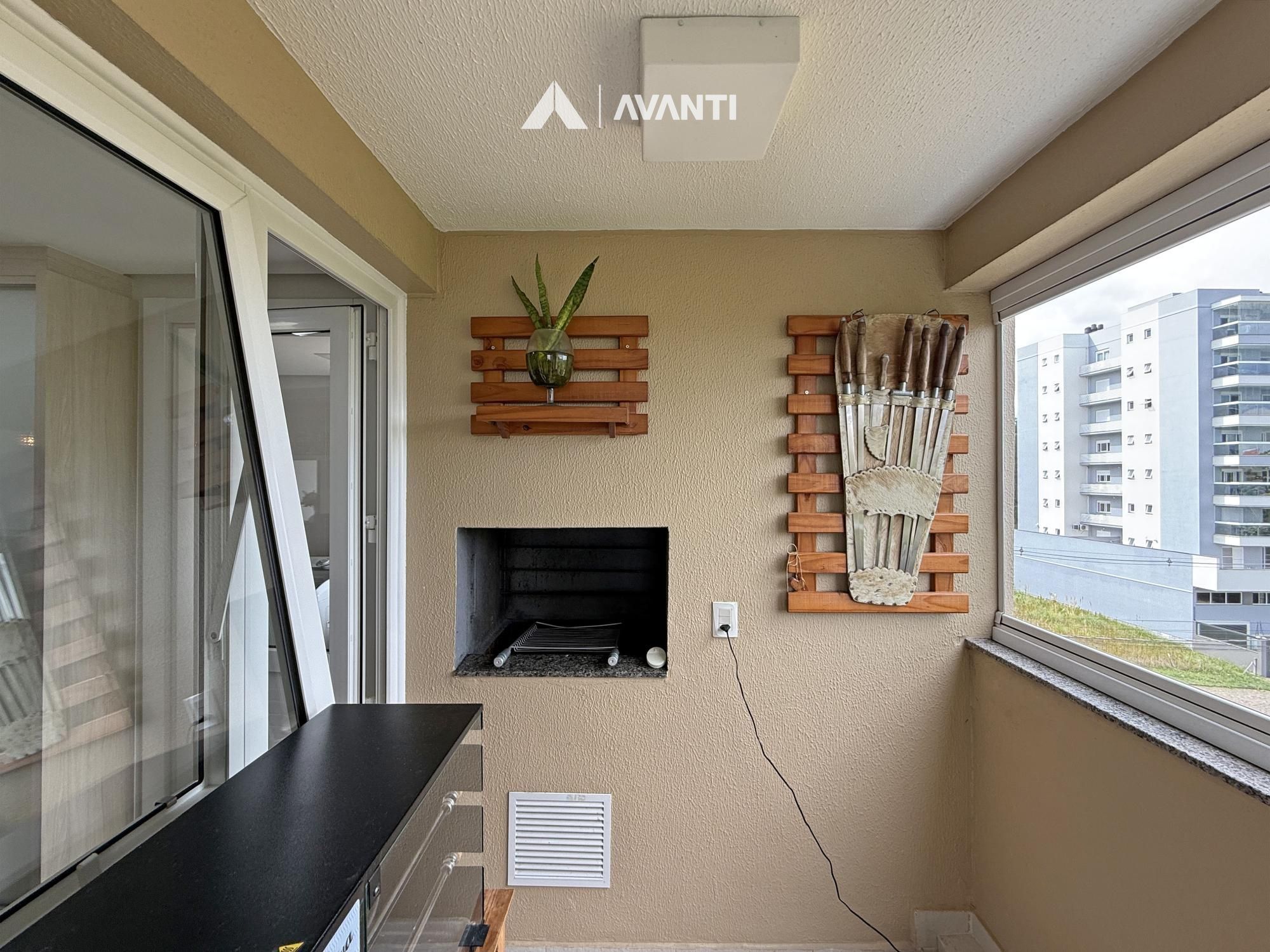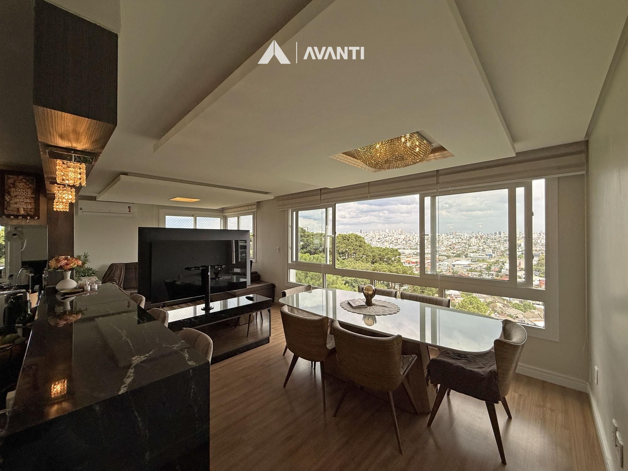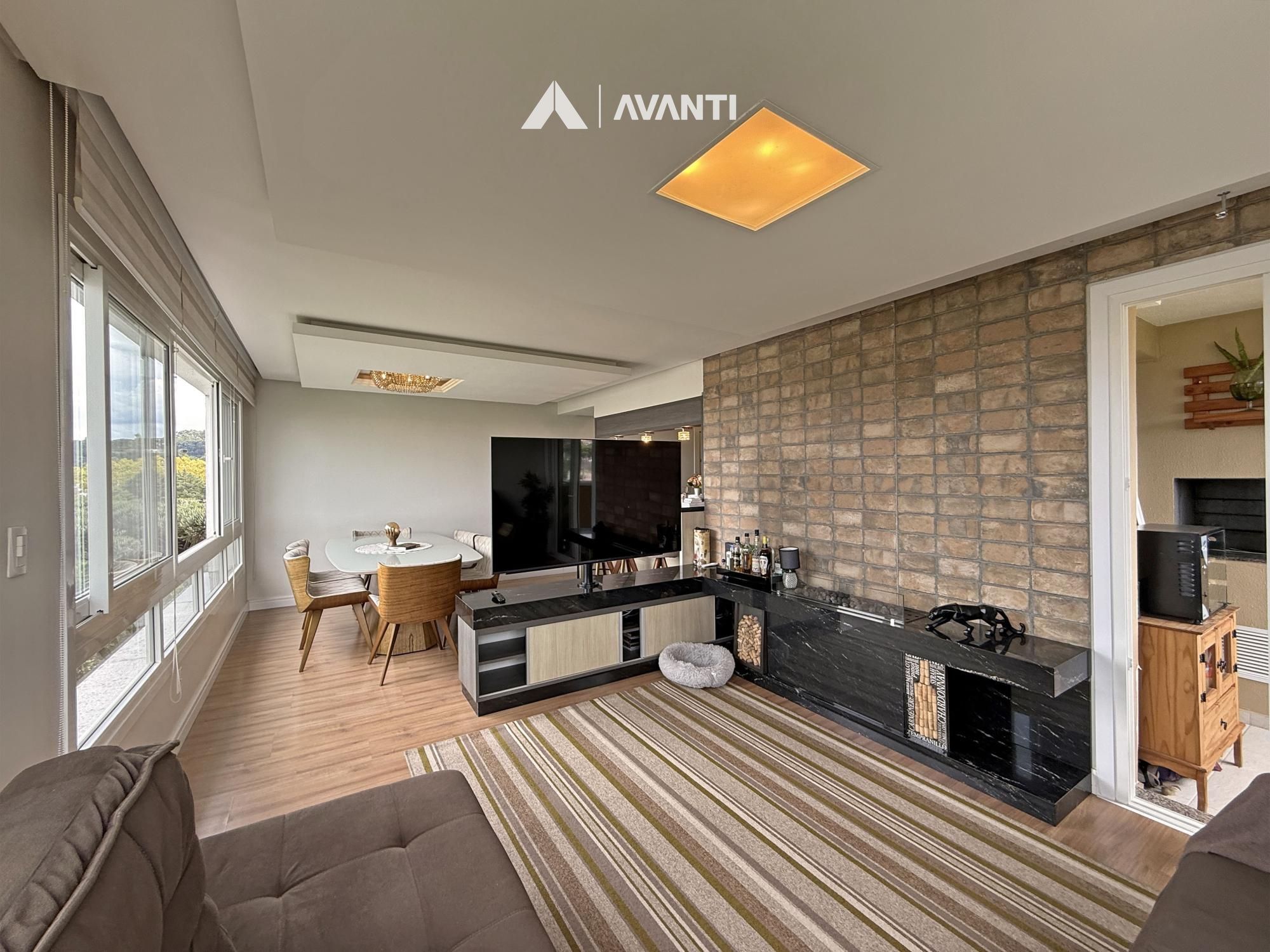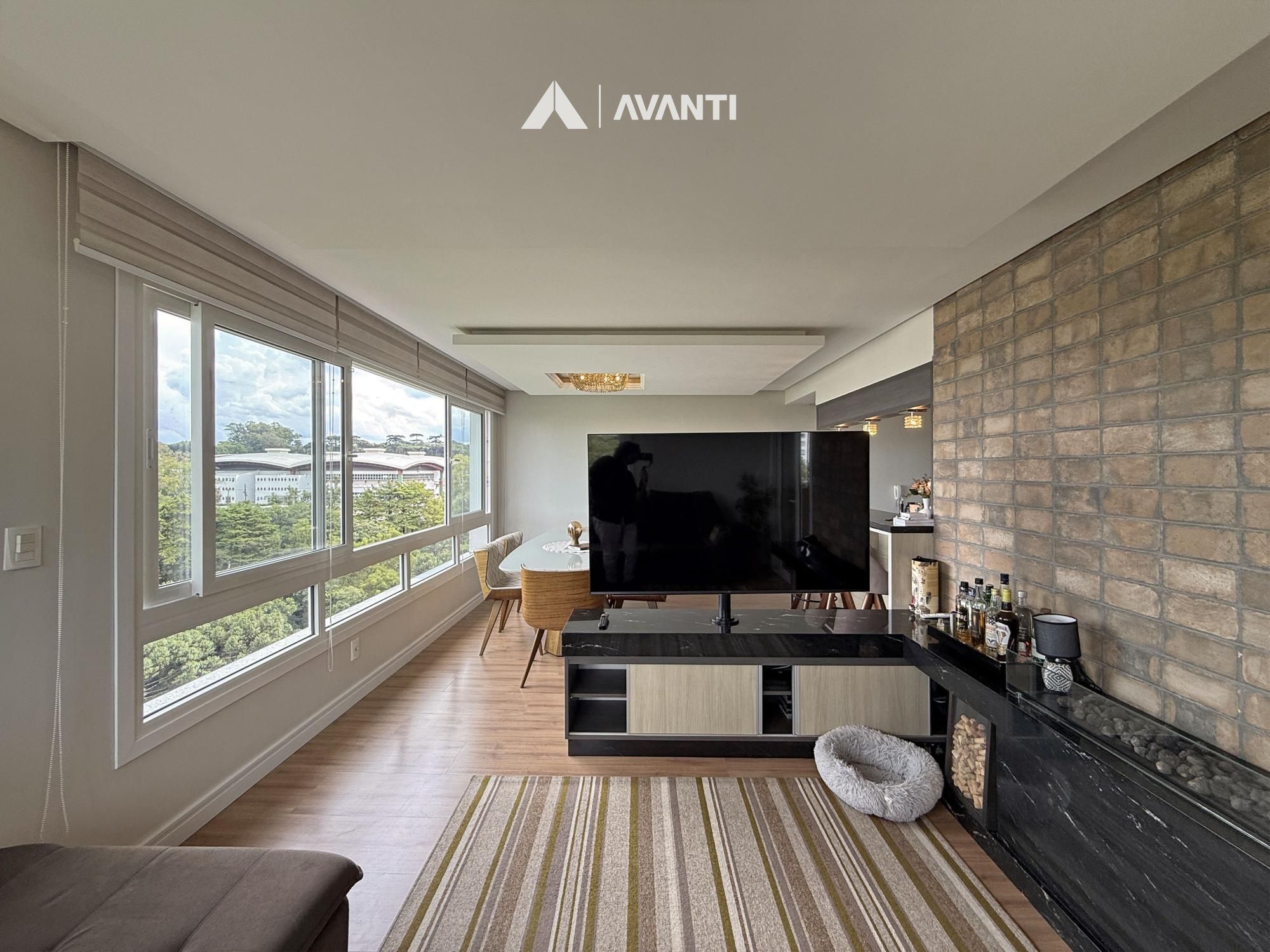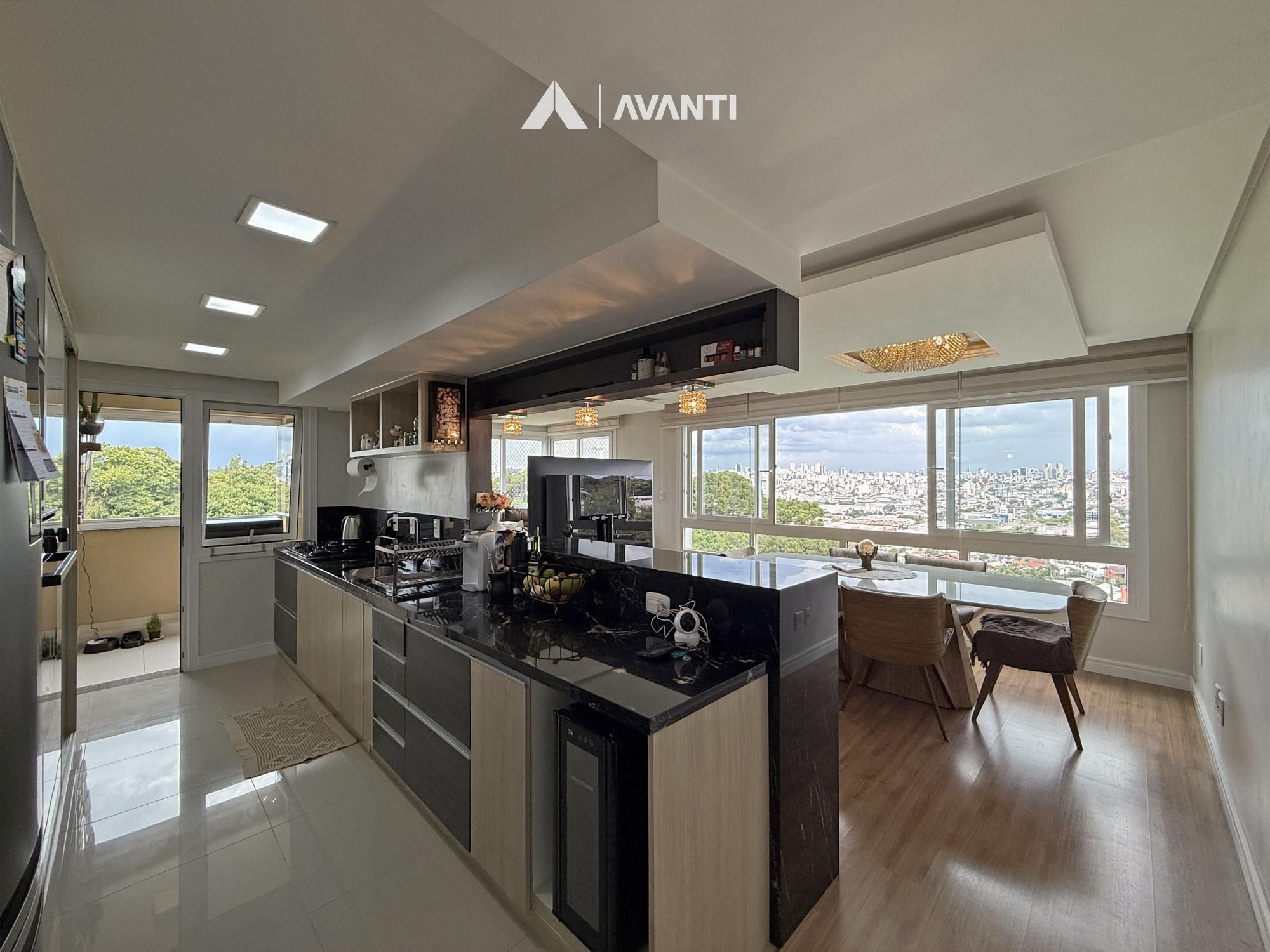O acesso se dá por um hall com lavabo que leva a um living integrado, onde sala de estar com lareira e sala de jantar se conectam de forma fluida. As amplas aberturas revelam uma vista de destaque para a cidade e área verde, criando um cenário único. A sacada com churrasqueira amplia o espaço social, enquanto a cozinha com bancada e o banheiro social complementam a funcionalidade do dia a dia.