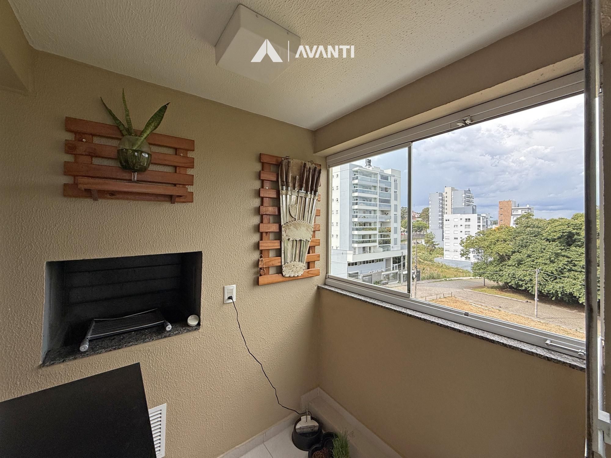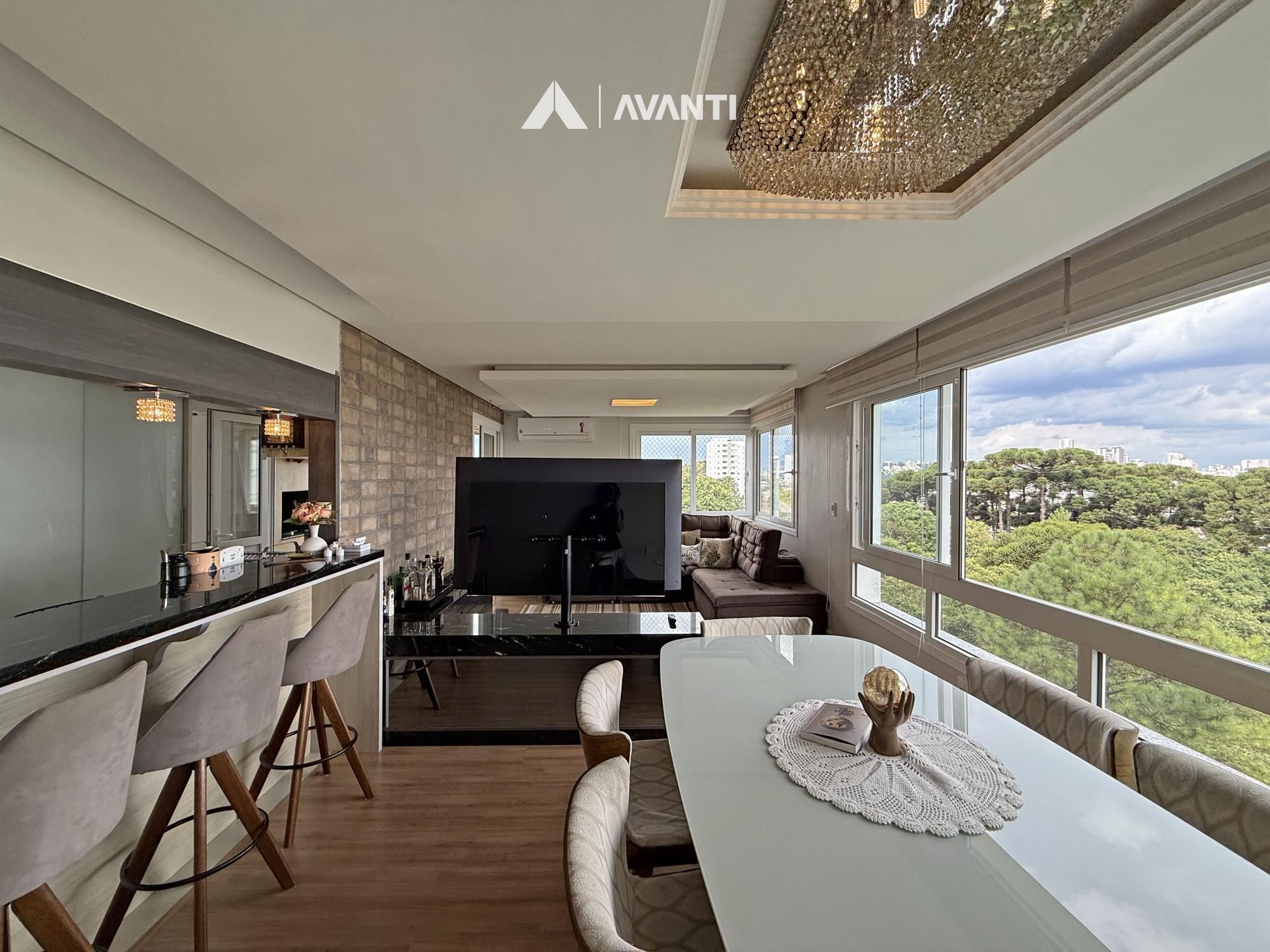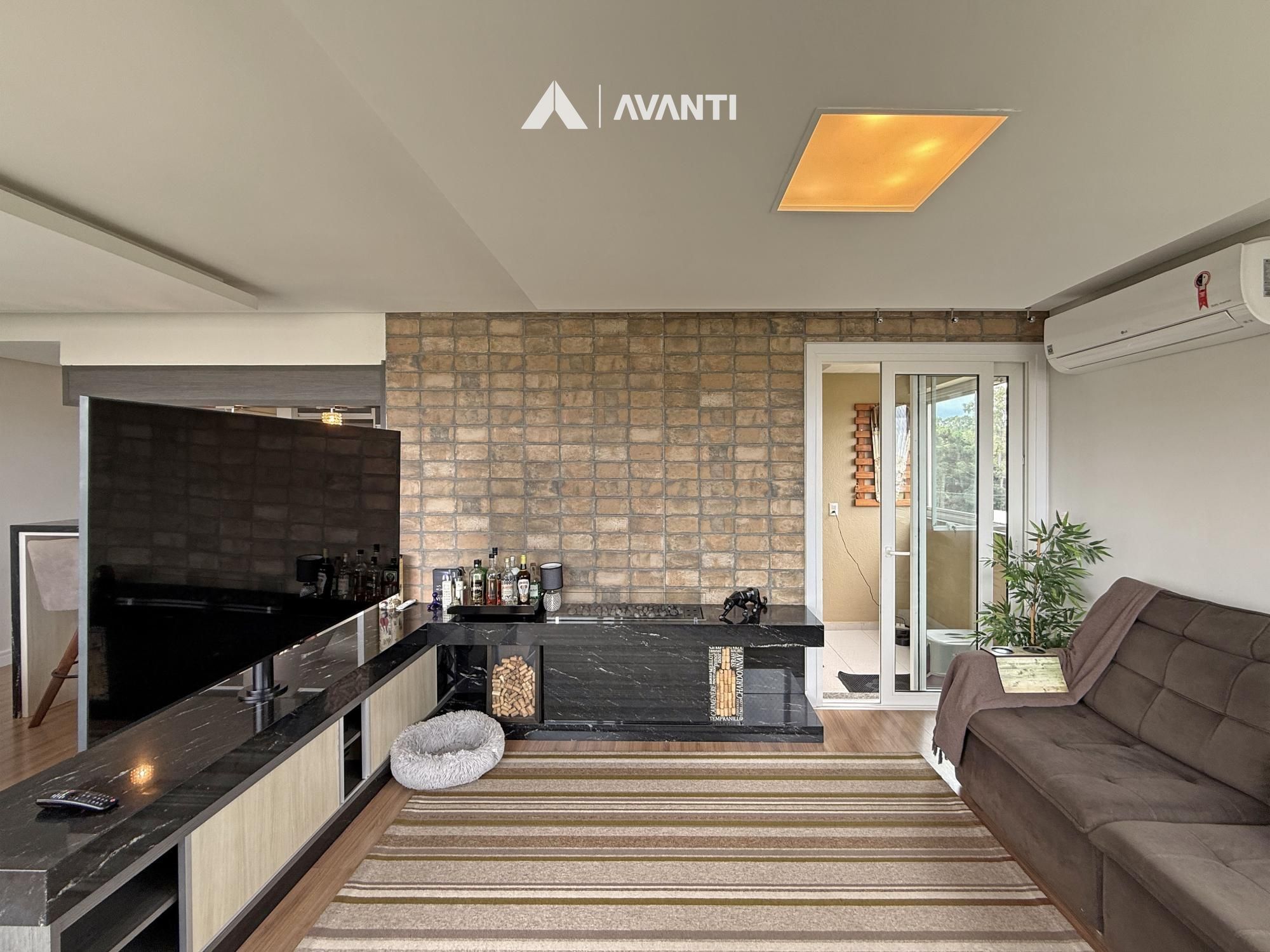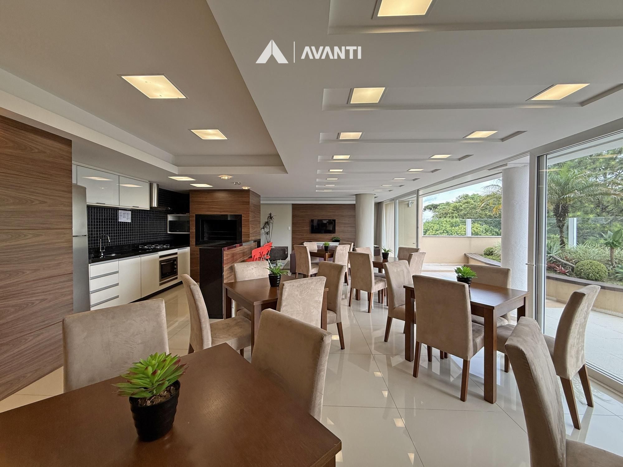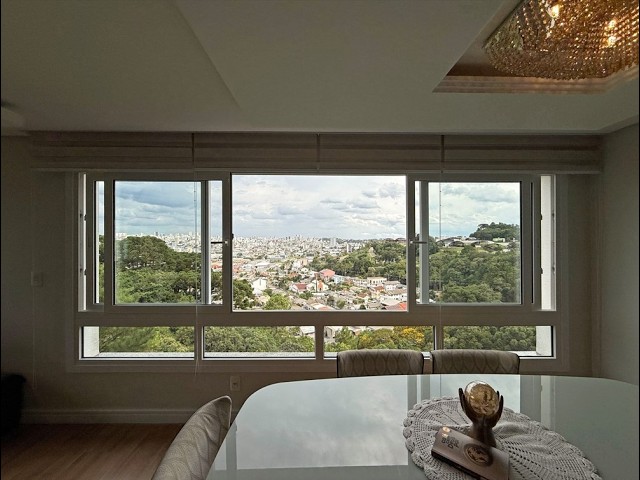 O acesso se dá por um hall com lavabo que leva a um living integrado, onde sala de estar com lareira e sala de jantar se conectam de forma fluida. As amplas aberturas revelam uma vista de destaque para a cidade e área verde, criando um cenário único. A sacada com churrasqueira amplia o espaço social, enquanto a cozinha com bancada e o banheiro social complementam a funcionalidade do dia a dia.