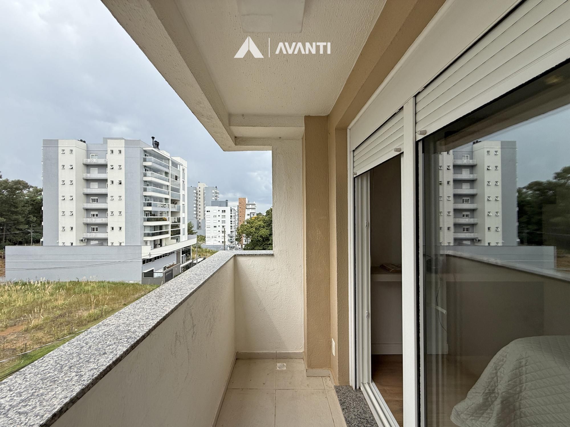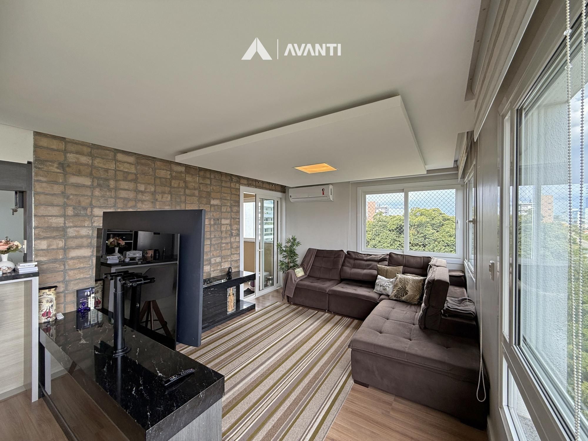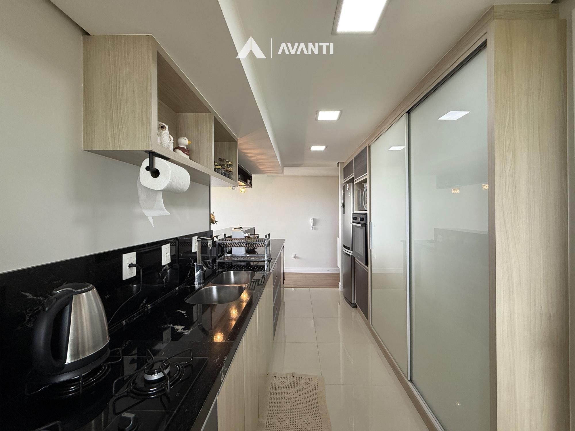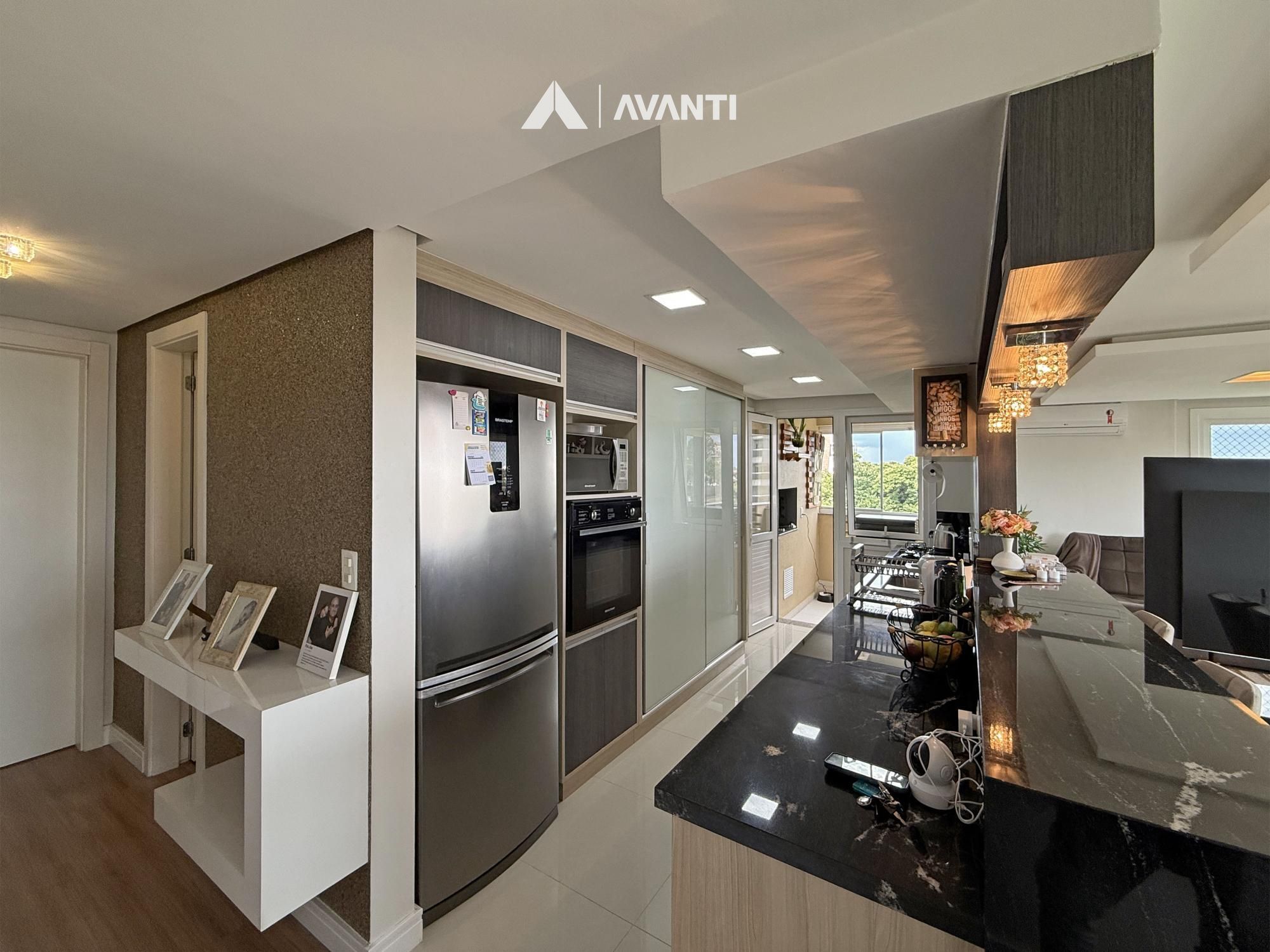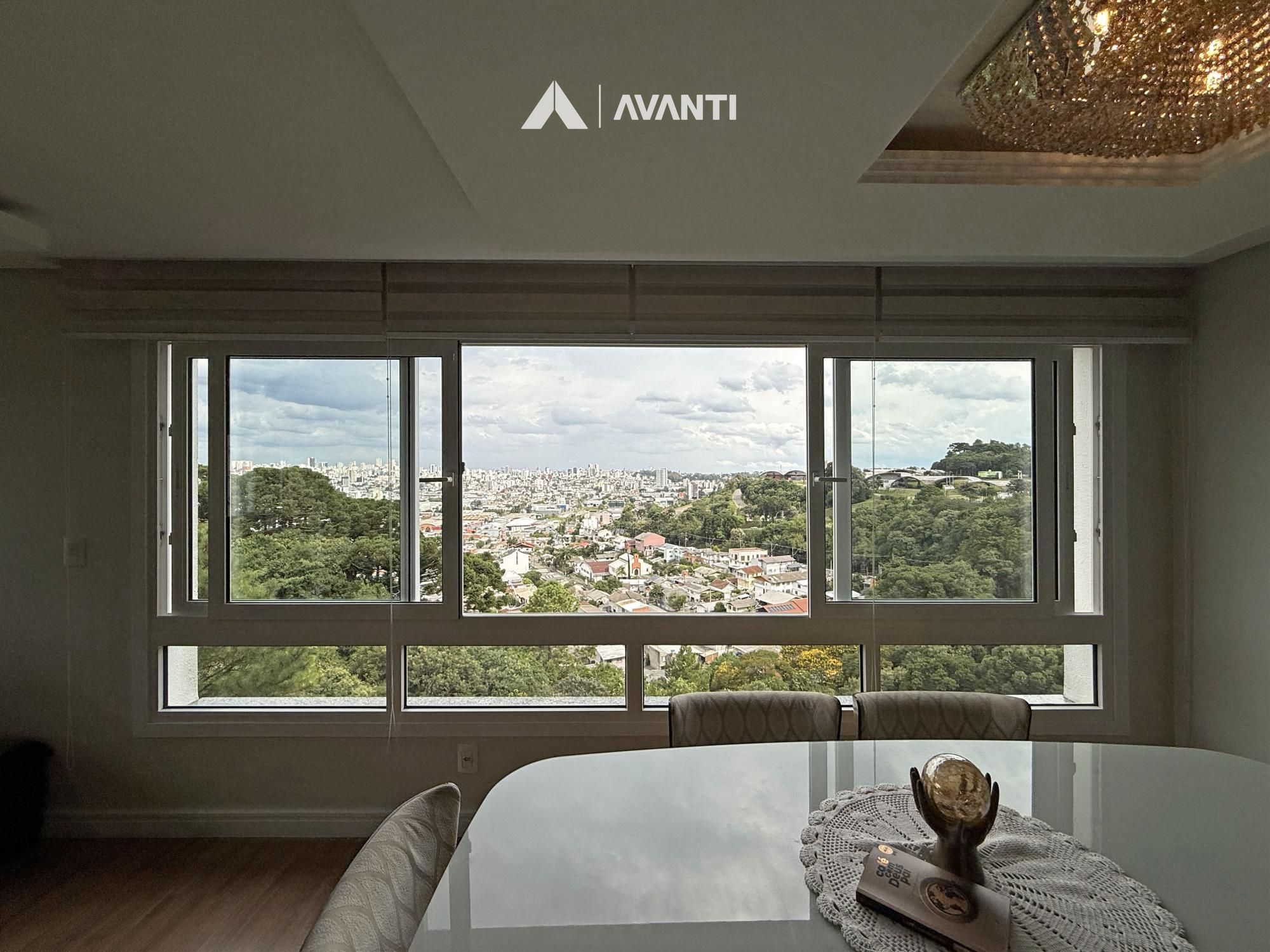 O acesso se dá por um hall com lavabo que leva a um living integrado, onde sala de estar com lareira e sala de jantar se conectam de forma fluida. As amplas aberturas revelam uma vista de destaque para a cidade e área verde, criando um cenário único. A sacada com churrasqueira amplia o espaço social, enquanto a cozinha com bancada e o banheiro social complementam a funcionalidade do dia a dia.